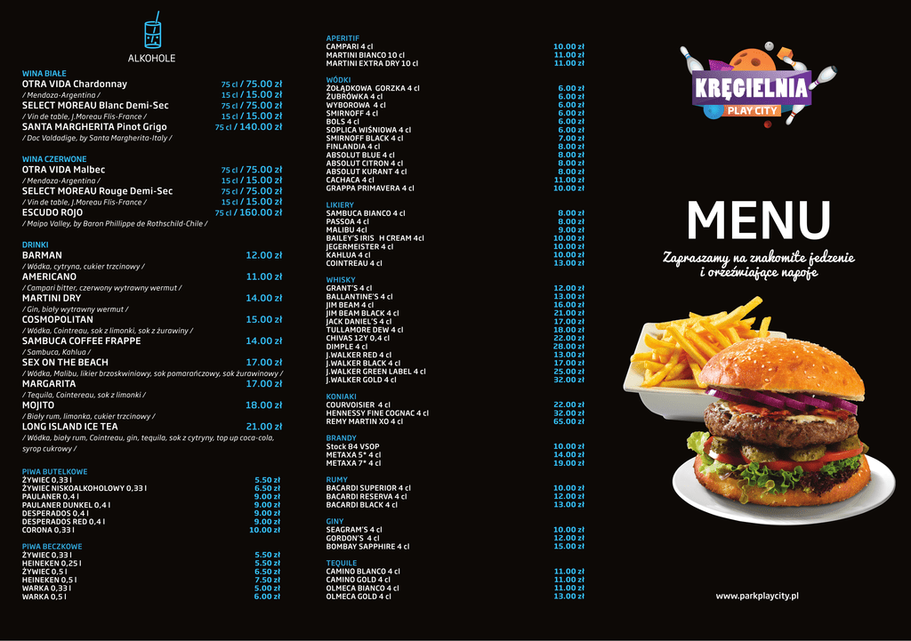 ALKOHOLE WINA BIAŁE OTRA VIDA Chardonnay / Mendoza-Argentina / SELECT MOREAU Blanc Demi-Sec / Vin de table, J.Moreau Flis-France / SANTA MARGHERITA Pinot Grigo / Doc Valdadige, by Santa Margherita-Italy / WINA CZERWONE OTRA VIDA Malbec / Mendoza-Argentina / SELECT MOREAU Rouge Demi-Sec / Vin de table, J.Moreau Flis-France / ESCUDO ROJO / Maipo Valley, by Baron Phillippe de Rothschild-Chile / DRINKI 75 cl / 75.00 15 cl / 15.00 75 cl / 75.00 15 cl / 15.00 75 cl / 140.00 zł zł zł zł zł 75 cl / 75.00 15 cl / 15.00 75 cl / 75.00 15 cl / 15.00 75 cl / 160.00 zł zł zł zł zł BARMAN 12.00 zł AMERICANO 11.00 zł MARTINI DRY 14.00 zł COSMOPOLITAN 15.00 zł SAMBUCA COFFEE FRAPPE 14.00 zł SEX ON THE BEACH 17.00 zł MARGARITA 17.00 zł / Wódka, cytryna, cukier trzcinowy / / Campari bitter, czerwony wytrawny wermut / / Gin, biały wytrawny wermut / / Wódka, Cointreau, sok z limonki, sok z żurawiny / / Sambuca, Kahlua / / Wódka, Malibu, likier brzoskwiniowy, sok pomarańczowy, sok żurawinowy / / Tequila, Cointereau, sok z limonki / MOJITO 18.00 zł LONG ISLAND ICE TEA 21.00 zł / Biały rum, limonka, cukier trzcinowy / / Wódka, biały rum, Cointreau, gin, tequila, sok z cytryny, top up coca-cola, syrop cukrowy / PIWA BUTELKOWE ŻYWIEC 0,33 l ŻYWIEC NISKOALKOHOLOWY 0,33 l PAULANER 0,4 l PAULANER DUNKEL 0,4 l DESPERADOS 0,4 l DESPERADOS RED 0,4 l CORONA 0,33 l PIWA BECZKOWE ŻYWIEC 0,33 l HEINEKEN 0,25 l ŻYWIEC 0,5 l HEINEKEN 0,5 l WARKA 0,33 l WARKA 0,5 l 5.50 zł 6.50 zł 9.00 zł 9.00 zł 9.00 zł 9.00 zł 10.00 zł 5.50 zł 5.50 zł 6.50 zł 7.50 zł 5.00 zł 6.00 zł APERITIF CAMPARI 4 cl MARTINI BIANCO 10 cl MARTINI EXTRA DRY 10 cl 10.00 zł 11.00 zł 11.00 zł WÓDKI ŻOŁĄDKOWA GORZKA 4 cl ŻUBRÓWKA 4 cl WYBOROWA 4 cl SMIRNOFF 4 cl BOLS 4 cl SOPLICA WIŚNIOWA 4 cl SMIRNOFF BLACK 4 cl FINLANDIA 4 cl ABSOLUT BLUE 4 cl ABSOLUT CITRON 4 cl ABSOLUT KURANT 4 cl CACHACA 4 cl GRAPPA PRIMAVERA 4 cl 6.00 zł 6.00 zł 6.00 zł 6.00 zł 6.00 zł 6.00 zł 7.00 zł 8.00 zł 8.00 zł 8.00 zł 8.00 zł 11.00 zł 10.00 zł LIKIERY SAMBUCA BIANCO 4 cl PASSOA 4 cl MALIBU 4cl BAILEY’S IRIS H CREAM 4cl JEGERMEISTER 4 cl KAHLUA 4 cl COINTREAU 4 cl 8.00 zł 8.00 zł 9.00 zł 10.00 zł 10.00 zł 10.00 zł 13.00 zł WHISKY GRANT’S 4 cl BALLANTINE’S 4 cl JIM BEAM 4 cl JIM BEAM BLACK 4 cl JACK DANIEL’S 4 cl TULLAMORE DEW 4 cl CHIVAS 12Y 0,4 cl DIMPLE 4 cl J.WALKER RED 4 cl J.WALKER BLACK 4 cl J.WALKER GREEN LABEL 4 cl J.WALKER GOLD 4 cl 12.00 zł 13.00 zł 16.00 zł 21.00 zł 17.00 zł 18.00 zł 22.00 zł 28.00 zł 13.00 zł 17.00 zł 25.00 zł 32.00 zł KONIAKI COURVOISIER 4 cl HENNESSY FINE COGNAC 4 cl REMY MARTIN XO 4 cl 22.00 zł 32.00 zł 65.00 zł BRANDY Stock 84 VSOP METAXA 5* 4 cl METAXA 7* 4 cl 10.00 zł 14.00 zł 19.00 zł RUMY BACARDI SUPERIOR 4 cl BACARDI RESERVA 4 cl BACARDI BLACK 4 cl 10.00 zł 12.00 zł 13.00 zł GINY SEAGRAM’S 4 cl GORDON’S 4 cl BOMBAY SAPPHIRE 4 cl 10.00 zł 12.00 zł 15.00 zł TEQUILE CAMINO BLANCO 4 cl CAMINO GOLD 4 cl OLMECA BIANCO 4 cl OLMECA GOLD 4 cl 11.00 zł 11.00 zł 11.00 zł 13.00 zł KREGIELNIA PLAY CITY MENU Zapraszamy na znakomite jedzenie i orzezwiajace napoje www.parkplaycity.pl PRZYSTAWKI DANIA GŁÓWNE 29.90 zł TATAR WOŁOWY / Tatar z polędwicy wołowej z cebulą, ogórkiem kiszonym, grzybami marynowanymi, kaparami / / Kurczak w chrupiącym cieście tempura z sosem słodko-pikantnym / 29.90 zł KREWETKI w chrupiącym cieście tempura / Krewetki w chrupiącym cieście tempura z sosem słodko-pikantnym / 11.00 zł ŚLEDŹ / Śledź w śmietanie lub oleju / CHRUPIĄCA PAJDA CHLEBA 6.00 zł BRUSCHETTA 6.00 zł / Pajda chleba ze swojskim smalcem / / Bruschetta z pomidorami / PLACEK PO WĘGIERSKU z zestawem surówek 17.00 zł STEAK Z POLĘDWICY WOŁOWEJ w sosie pieprzowym 69.00 zł BURGER KLASYCZNY 23.00 zł CHEESEBURGER 26.00 zł 13.00 zł ZUPA GULASZOWA / Zupa gulaszowa podana w chlebku / SAŁATKI Na zyczenie Klienta pierogi podajemy z cebulka lub skwarkami 24.00 zł 22.00 zł 250 ml / 5.00 zł 250 ml / 3.50 zł LEMONIADA 250 ml / 5.00 500 ml / 7.00 / gazowana, niegazowana / Sałatka Cezar Steak / Kompozycja sałat z pomidorami, ogórkiem, papryką, oliwkami, serem feta oraz sosem vinegrette / / pomarańczowy, grejpfrutowy, mieszany / 250 ml / 8.00 zł KAWY I HERBATY ESPRESSO 5.00 zł KAWA 6.50 zł KAWA Z MLEKIEM 7.00 zł CAPPUCCINO 8.00 zł KAWA LATTE 10.00 zł KAWA MROŻONA 12.00 zł 6.00 zł / Kompozycja sałat z boczkiem, pieczarkami, cebulą, wątróbką oraz sosem vinegrette / Tatar / 4.00 zł SOKI ZE ŚWIEŻYCH OWOCÓW HERBATA 26.00 zł zł zł SOKI I NEKTARY / pomarańczowy, jabłkowy, grejpfrutowy, 250 ml porzeczkowy, pomidorowy / 12.00 zł 12.00 zł 12.00 zł 13.00 zł 13.00 zł / Ruskie z serem i ziemniakami / / Z wątróbką / / Ze szpinakiem / / Z kapustą i grzybami / / Z mięsem / / Sałata rzymska z grillowanym kurczakiem, pomidorami cherry, bekonem, parmezanem, dressingiem / SAŁATKA GRECKA / 9.00 zł / Burger wołowy z pomidorem, sałatą, ogórkiem kiszonym i czerwoną cebulką, podawany z frytkami / Do naszych sałat podajemy bagietke czosnkowa SAŁATKA CEZAR 250 ml / gazowana, niegazowana / / Burger wołowy z serem cheddar, bekonem, pomidorem, sałatą, ogórkiem kiszonym i czerwoną cebulą, podawany z frytkami / ZUPY / 4.00 zł / brzoskwinia, cytryna / / Steak z polędwicy wołowej, podany z frytkami, sałatą i pomidorami oraz sosem vinegrette / zł zł 200 ml / Chrupiący placek ziemniaczany podany z gulaszem wieprzowym, śmietaną oraz zestawem surówek / PIEROGI gotowane lub pieczone SAŁATKA Z WĄTRÓBKĄ 200 ml / 4.00 500 ml / 6.00 21.00 zł KOTLET SCHABOWY / Kotlet schabowy ze smażonymi ziemniakami z dodatkiem boczku oraz cebuli, plus zestaw surówek / 16.00 zł KURCZAK w chrupiącym cieście tempura NAPOJE ZIMNE KREGIELNIA PLAY CITY