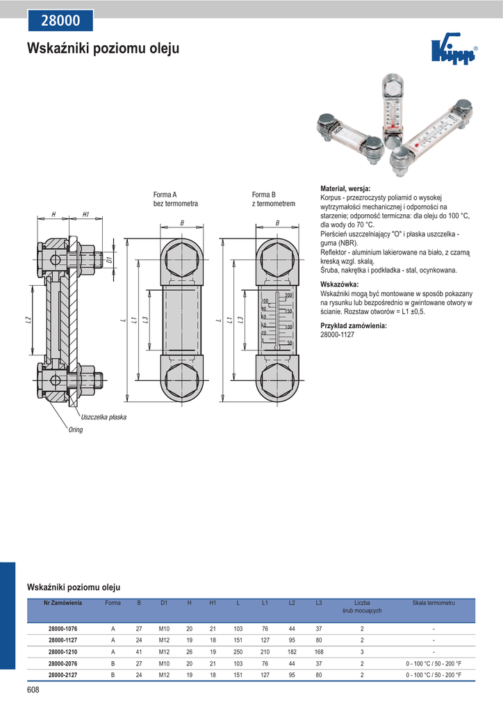 Wskaźniki poziomu oleju 'PSNB" CF[UFSNPNFUSB 'PSNB# [UFSNPNFUSFN Materiał, wersja: Korpus - przezroczysty poliamid o wysokej wytrzymałości mechanicznej i odporności na starzenie; odporność termiczna: dla oleju do 100 °C, dla wody do 70 °C. Pierścień uszczelniający "O" i płaska uszczelka guma (NBR). Reflektor - aluminium lakierowane na biało, z czarną kreską wzgl. skalą. Śruba, nakrętka i podkładka - stal, ocynkowana. Wskazówka: Wskaźniki mogą być montowane w sposób pokazany na rysunku lub bezpośrednio w gwintowane otwory w ścianie. Rozstaw otworów = L1 ±0,5. Przykład zamówienia: 28000-1127 8V]F]HONDS¶DVND 2ULQJ LBQ Wskaźniki poziomu oleju Nr Zamówienia Forma B D1 H H1 L L1 L2 L3 Liczba śrub mocuących Skala termometru 28000-1076 A 27 M10 20 21 103 76 44 37 2 - 28000-1127 A 24 M12 19 18 151 127 95 80 2 - 28000-1210 A 41 M12 26 19 250 210 182 168 3 - 28000-2076 B 27 M10 20 21 103 76 44 37 2 0 - 100 °C / 50 - 200 °F 28000-2127 B 24 M12 19 18 151 127 95 80 2 0 - 100 °C / 50 - 200 °F