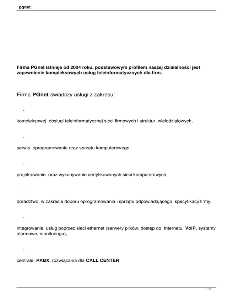pgnet Firma PGnet istnieje od 2004 roku, podstawowym profilem naszej działalności jest zapewnienie kompleksowych usług teleinformatycznych dla firm. Firma PGnet świadczy usługi z zakresu: kompleksowej obsługi teleinformatycznej sieci firmowych i struktur wielodziałowych, serwis oprogramowania oraz sprzętu komputerowego, projektowanie oraz wykonywanie certyfikowanych sieci komputerowych, doradztwo w zakresie doboru oprogramowania i sprzętu odpowiadającego specyfikacji firmy, integrowanie usług poprzez sieci ethernet (serwery plików, dostęp do Internetu, VoIP, systemy alarmowe, monitoringu), centrale PABX, rozwiązania dla CALL CENTER 1/3 pgnet systemy monitoringu analogowe, IP, hybrydowe w oparciu o cyfrowe systemy rejestrujące, nadzór w procesie tworzenia, aktualizowania strony firmowej, współpraca z osobami zajmującymi się projektowaniem stron, dostęp do internetu sieciami WLAN, FTTH hosting, ftp, poczta oraz inne usługi internetowe, inne usługi związane z informatyka - montaż oraz serwis automatyki do bram przesuwnych,dwuskrzydłowych , garażowych . - montaż instalacja alarmowych sprzedaż, instalacja oprogramowania antywirusowego Avira w stacjach roboczych, serwerach opartych o systemy Windows, Unix/Linux, sprzedaż, instalacja i serwis drukarek, kas fiskalnych, wag firmy ELZAB, - 2/3 pgnet wdrażanie i serwis oprogramowania VENDO, unikalne rozwiązania i specyficzne oprogramowanie projektowane specjalnie dla klientów - Projekt oraz wdrażanie instalacji "Inteligentny Dom" 3/3