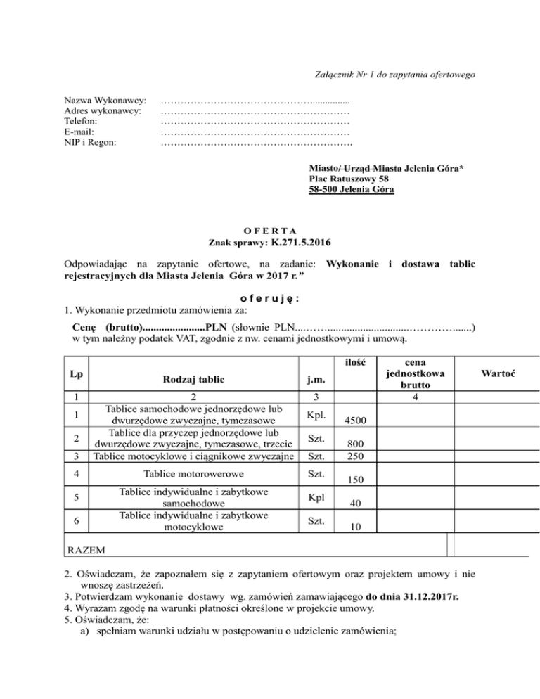Załącznik Nr 1 do zapytania ofertowego Nazwa Wykonawcy: Adres wykonawcy: Telefon: E-mail: NIP i Regon: ………………………………………................ ………………………………………………… ………………………………………………… ………………………………………………… …………………………………………………. Miasto/ Urząd Miasta Jelenia Góra* Plac Ratuszowy 58 58-500 Jelenia Góra O F E R TA Znak sprawy: K.271.5.2016 Odpowiadając na zapytanie ofertowe, na zadanie: Wykonanie i dostawa tablic rejestracyjnych dla Miasta Jelenia Góra w 2017 r.” oferuję: 1. Wykonanie przedmiotu zamówienia za: Cenę (brutto).......................PLN (słownie PLN....……..............................………….......) w tym należny podatek VAT, zgodnie z nw. cenami jednostkowymi i umową. ilość Lp Rodzaj tablic j.m. 3 3 2 Tablice samochodowe jednorzędowe lub dwurzędowe zwyczajne, tymczasowe Tablice dla przyczep jednorzędowe lub dwurzędowe zwyczajne, tymczasowe, trzecie Tablice motocyklowe i ciągnikowe zwyczajne 4 Tablice motorowerowe 1 1 2 5 6 Tablice indywidualne i zabytkowe samochodowe Tablice indywidualne i zabytkowe motocyklowe Kpl. Szt. Szt. Szt. Kpl Szt. cena jednostkowa brutto 4 4500 800 250 150 40 10 RAZEM 2. Oświadczam, że zapoznałem się z zapytaniem ofertowym oraz projektem umowy i nie wnoszę zastrzeżeń. 3. Potwierdzam wykonanie dostawy wg. zamówień zamawiającego do dnia 31.12.2017r. 4. Wyrażam zgodę na warunki płatności określone w projekcie umowy. 5. Oświadczam, że: a) spełniam warunki udziału w postępowaniu o udzielenie zamówienia; Wartoć b) posiadam uprawnienia do wykonywania działalności lub czynności objętych niniejszym zamówieniem, jeżeli przepisy prawa nakładają obowiązek posiadania takich uprawnień. ........................................................ (podpis wykonawcy lub osoby upełnomocnionej) W załączeniu: 1. Aktualny odpis z właściwego rejestru lub z centralnej ewidencji i informacji o działalności gospodarczej, jeżeli odrębne przepisy wymagają wpisu do rejestru lub ewidencji, w celu wykazania braku podstaw do wykluczenia, wystawionego nie wcześniej niż 6 miesięcy przed upływem terminu składania ofert. 2. Certyfikat na zgodność tablic rejestracyjnych lub materiałów służących do ich produkcji z warunkami technicznymi /art. 75a ustawy z dnia 20 czerwca 1997 r. Prawo o ruchu drogowym tj. Dz.U z 2012 r. poz 1137 z późn. zmianami/. 3. Zaświadczenie o wpisie do rejestru przedsiębiorców produkujących tablice rejestracyjne art. 75a ust 1 w/w ustawy Prawo o ruchu drogowym.