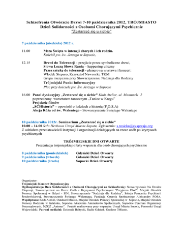 Schizofrenia Otwórzcie Drzwi 7-10 października 2012, TRÓJMIASTO Dzień Solidarności z Osobami Chorującymi Psychicznie "Zestarzeć się u siebie" 7 października (niedziela) 2012 r. 11.00 Msza Święta w intencji chorych i ich rodzin. Kościół pw. św. Jerzego w Sopocie, 12.15 Drzwi do Tolerancji - przejście przez symboliczne drzwi, Słowa Leczą Słowa Ranią – happening uliczny Przez sztukę do tolerancji - plenerowa wystawa i koncert: Włodek Stepuro, Krzysztof Nawrocki, TKM Grupa muzyczna przy Stowarzyszeniu Nadzieja dla Rodziny Trójmiejski Punkt Informacyjny Plac przy kościele pw. Św. Jerzego w Sopocie 16.00 Panel dyskusyjny „Zestarzeć się u siebie" Klub Atelier, ul. Mamuszki 2 poprzedzony warsztatem tanecznym „Taniec w Kręgu” Projekcie filmów „SCHIstoria” – opowieść o ludziach z historią (F.O.S.A) Akcja Róża od św. Walentego - Stowarzyszenie Świętego Walentego 10 października 2012r. Seminarium „Zestarzeć się u siebie” 10.00 – 14.00 Sala Herbowa Urząd Miasta Sopotu, Zgłoszenia: [email protected] Z udziałem przedstawicieli instytucji i organizacji działających na rzecz osób po kryzysach psychicznych TRÓJMIEJSKIE DNI OTWARTE Prezentacja trójmiejskiej oferty wsparcia dla osób chorujących psychicznie 8 października (poniedziałek) 9 października (wtorek) 10 października (środa) Gdyński Dzień Otwarty Gdański Dzień Otwarty Sopocki Dzień Otwarty Organizator: Trójmiejski Komitet Organizacyjny Ogólnopolskiego Dnia Solidarności z Osobami Chorującymi na Schizofrenię: Stowarzyszenie Na Drodze Ekspresji, Stowarzyszenie na Rzecz Osób z Kryzysami Psychicznymi "Przyjazna Dłoń", Miejski Ośrodek Pomocy Społecznej w Gdyni - SIN, Stowarzyszenie "Nadzieja dla Rodziny", Sekcja Pomorska Psychiatrii Środowiskowej, Stowarzyszenie Świętego Walentego, Fundacja Oparcia Społecznego Aleksandry FOSA. Współpraca: Klub Atelier, Outdoor3Miasto, Miejski Ośrodek Pomocy Społecznej w Sopocie, Miejski Ośrodek Pomocy Rodzinie w Gdańsku, Sopocka Akademia Animatorów Społecznych, Sopockie Centrum Organizacji Pozarządowych, NZOZ „Animus”. Projekt realizowany przy wsparciu: Urząd Miasta Sopotu, Pomorski Urząd Wojewódzki. Patroni medialni: Dziennik Bałtycki, Radio Gdańsk, Outdoor 3Miasto.