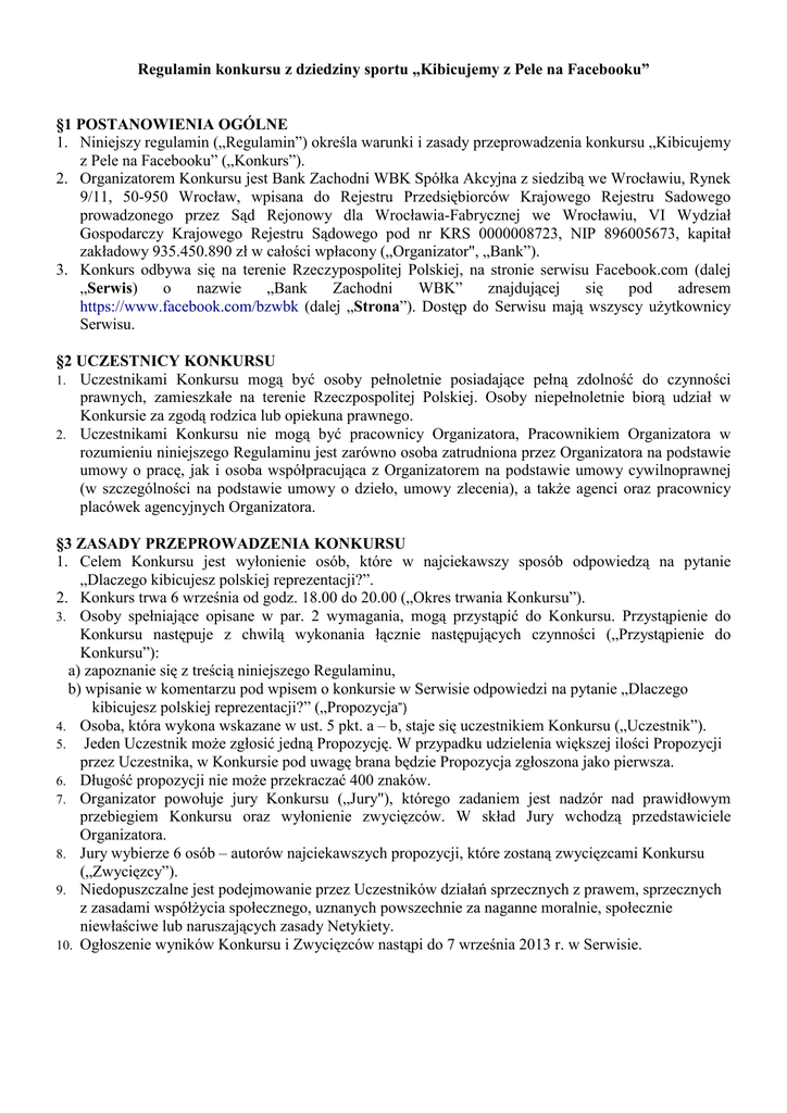 Regulamin konkursu z dziedziny sportu „Kibicujemy z Pele na Facebooku” §1 POSTANOWIENIA OGÓLNE 1. Niniejszy regulamin („Regulamin”) określa warunki i zasady przeprowadzenia konkursu „Kibicujemy z Pele na Facebooku” („Konkurs”). 2. Organizatorem Konkursu jest Bank Zachodni WBK Spółka Akcyjna z siedzibą we Wrocławiu, Rynek 9/11, 50-950 Wrocław, wpisana do Rejestru Przedsiębiorców Krajowego Rejestru Sadowego prowadzonego przez Sąd Rejonowy dla Wrocławia-Fabrycznej we Wrocławiu, VI Wydział Gospodarczy Krajowego Rejestru Sądowego pod nr KRS 0000008723, NIP 896005673, kapitał zakładowy 935.450.890 zł w całości wpłacony („Organizator", „Bank”). 3. Konkurs odbywa się na terenie Rzeczypospolitej Polskiej, na stronie serwisu Facebook.com (dalej „Serwis) o nazwie „Bank Zachodni WBK” znajdującej się pod adresem https://www.facebook.com/bzwbk (dalej „Strona”). Dostęp do Serwisu mają wszyscy uŜytkownicy Serwisu. §2 UCZESTNICY KONKURSU 1. Uczestnikami Konkursu mogą być osoby pełnoletnie posiadające pełną zdolność do czynności prawnych, zamieszkałe na terenie Rzeczpospolitej Polskiej. Osoby niepełnoletnie biorą udział w Konkursie za zgodą rodzica lub opiekuna prawnego. 2. Uczestnikami Konkursu nie mogą być pracownicy Organizatora, Pracownikiem Organizatora w rozumieniu niniejszego Regulaminu jest zarówno osoba zatrudniona przez Organizatora na podstawie umowy o pracę, jak i osoba współpracująca z Organizatorem na podstawie umowy cywilnoprawnej (w szczególności na podstawie umowy o dzieło, umowy zlecenia), a takŜe agenci oraz pracownicy placówek agencyjnych Organizatora. §3 ZASADY PRZEPROWADZENIA KONKURSU 1. Celem Konkursu jest wyłonienie osób, które w najciekawszy sposób odpowiedzą na pytanie „Dlaczego kibicujesz polskiej reprezentacji?”. 2. Konkurs trwa 6 września od godz. 18.00 do 20.00 („Okres trwania Konkursu”). 3. Osoby spełniające opisane w par. 2 wymagania, mogą przystąpić do Konkursu. Przystąpienie do Konkursu następuje z chwilą wykonania łącznie następujących czynności („Przystąpienie do Konkursu”): a) zapoznanie się z treścią niniejszego Regulaminu, b) wpisanie w komentarzu pod wpisem o konkursie w Serwisie odpowiedzi na pytanie „Dlaczego kibicujesz polskiej reprezentacji?” („Propozycja”) 4. Osoba, która wykona wskazane w ust. 5 pkt. a – b, staje się uczestnikiem Konkursu („Uczestnik”). 5. Jeden Uczestnik moŜe zgłosić jedną Propozycję. W przypadku udzielenia większej ilości Propozycji przez Uczestnika, w Konkursie pod uwagę brana będzie Propozycja zgłoszona jako pierwsza. 6. Długość propozycji nie moŜe przekraczać 400 znaków. 7. Organizator powołuje jury Konkursu („Jury"), którego zadaniem jest nadzór nad prawidłowym przebiegiem Konkursu oraz wyłonienie zwycięzców. W skład Jury wchodzą przedstawiciele Organizatora. 8. Jury wybierze 6 osób – autorów najciekawszych propozycji, które zostaną zwycięzcami Konkursu („Zwycięzcy”). 9. Niedopuszczalne jest podejmowanie przez Uczestników działań sprzecznych z prawem, sprzecznych z zasadami współŜycia społecznego, uznanych powszechnie za naganne moralnie, społecznie niewłaściwe lub naruszających zasady Netykiety. 10. Ogłoszenie wyników Konkursu i Zwycięzców nastąpi do 7 września 2013 r. w Serwisie. §5 NAGRODY 1. Nagrody w Konkursie stanowią 2 koszulki z autografem Pele („Koszulki”) i 4 zdjęcia Pele z autografem („Zdjęcia”) (dalej łącznie„Nagrody”). 2. Koszulki zostaną przyznane autorom Propozycji, które zostaną ocenione przez Jury jako najlepsze, Zdjęcia zostaną przyznane autorom Propozycji, które zajmą kolejne miejsca. 3. Posiedzenie Jury, podczas którego wybrani zostaną Zwycięzcy, którym przyznane zostaną Nagrody odbędzie się 7 września 2013 r. 4. Nagrody w Konkursie podlegają zwolnieniu od podatku na podstawie przepisu art.21 ust.1 pkt.68 ustawy o podatku dochodowym od osób fizycznych (Dz. U. z 2012r ,poz.361), jako nagrody z dziedziny sportu. 5. Nagrody nie będą podlegały wymianie na gotówkę ani na inne nagrody rzeczowe. Rezygnacja z części Nagrody oznacza rezygnację z całości Nagrody. 6. Uczestnicy, których Propozycje zwycięŜą w Konkursie zostaną poproszeni przez Organizatora o przesłanie danych do wysyłki Nagrody na adres [email protected]. 7. Zwycięzcy są zobowiązani do przesłania w e-mailu zwrotnym do Organizatora – oprócz danych – klauzuli: WyraŜam zgodę na przetwarzanie moich danych osobowych na potrzeby realizacji Konkursu. Oświadczam, Ŝe zostałam/em poinformowana/y o prawie dostępu do danych, prawie ich poprawiania, dobrowolności podania danych, oraz Ŝe administratorem danych osobowych jest Bank Zachodni WBK S.A, z siedzibą we Wrocławiu (50-950), Rynek 9/11. 8. Lista Zwycięzców, w formie imion i nazwisk, nicków lub pseudonimów, jakimi posługują się na Facebooku, zostanie opublikowana w formie wpisu w Serwisie najpóźniej 7 września 2013 r. Zwycięzca nie moŜe domagać się zamiany wygranej Nagrody na inną. 9. Zwycięzca ma prawo zrezygnować z Nagrody, o czym pisemnie powiadomi Organizatora w terminie 10 dni od dnia jej przyznania. 10. Organizator rozstrzyga o losie nieodebranych lub zwróconych Nagród. 11. W przypadku braku kontaktu ze strony Uczestnika w ciągu 10 dni od ogłoszenia w serwisie informacji o wygranej przez Organizatora, Uczestnik traci prawo do Nagrody. 11. Organizator nie ponosi odpowiedzialności za brak moŜliwości przekazania Nagrody z przyczyn leŜących po stronie Zwycięzcy. Są to przypadki: a) podania błędnych, niepełnych danych adresowych (imię i nazwisko, adres,), b) niepodania danych adresowych w terminie 10 dni od opublikowania przez Organizatora informacji o wygranej lub podania ich po tym terminie, d) nastąpienia zmiany danych adresowych Zwycięzcy, o których Organizator nie został poinformowany np. drogą e-mailową na adres: [ema