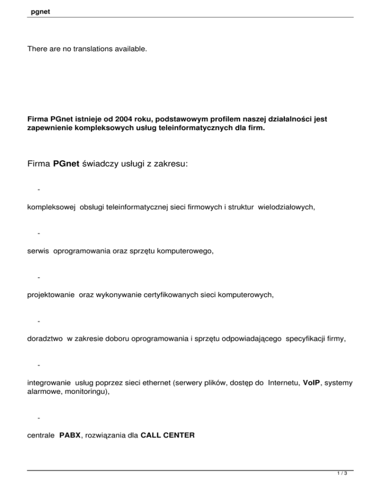 pgnet There are no translations available. Firma PGnet istnieje od 2004 roku, podstawowym profilem naszej działalności jest zapewnienie kompleksowych usług teleinformatycznych dla firm. Firma PGnet świadczy usługi z zakresu: kompleksowej obsługi teleinformatycznej sieci firmowych i struktur wielodziałowych, serwis oprogramowania oraz sprzętu komputerowego, projektowanie oraz wykonywanie certyfikowanych sieci komputerowych, doradztwo w zakresie doboru oprogramowania i sprzętu odpowiadającego specyfikacji firmy, integrowanie usług poprzez sieci ethernet (serwery plików, dostęp do Internetu, VoIP, systemy alarmowe, monitoringu), centrale PABX, rozwiązania dla CALL CENTER 1/3 pgnet systemy monitoringu analogowe, IP, hybrydowe w oparciu o cyfrowe systemy rejestrujące, nadzór w procesie tworzenia, aktualizowania strony firmowej, współpraca z osobami zajmującymi się projektowaniem stron, dostęp do internetu sieciami WLAN, FTTH hosting, ftp, poczta oraz inne usługi internetowe, inne usługi związane z informatyka - montaż oraz serwis automatyki do bram przesuwnych,dwuskrzydłowych , garażowych . - montaż instalacja alarmowych sprzedaż, instalacja oprogramowania antywirusowego Avira w stacjach roboczych, serwerach opartych o systemy Windows, Unix/Linux, sprzedaż, instalacja i serwis drukarek, kas fiskalnych, wag firmy ELZAB, 2/3 pgnet wdrażanie i serwis oprogramowania VENDO, unikalne rozwiązania i specyficzne oprogramowanie projektowane specjalnie dla klientów - Projekt oraz wdrażanie instalacji "Inteligentny Dom" 3/3
