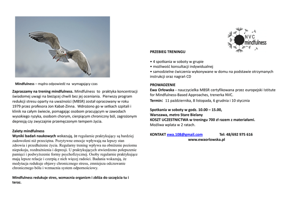 PRZEBIEG TRENINGU • 4 spotkania w soboty w grupie • możliwość konsultacji indywidualnej • samodzielne ćwiczenia wykonywane w domu na podstawie otrzymanych instrukcji oraz nagrań CD Mindfulness – mądra odpowiedź na wymagający czas Zapraszamy na trening mindfulness. Mindfulness to praktyka koncentracji świadomej uwagi na bieżącej chwili bez jej oceniania. Pierwszy program redukcji stresu oparty na uważności (MBSR) został opracowany w roku 1979 przez profesora Jon Kabat-Zinna. Wdrożono go w setkach szpitali i klinik na całym świecie, pomagając osobom pracującym w zawodach wysokiego ryzyka, osobom chorym, cierpiącym chroniczny ból, zagrożonym depresją czy zwyczajnie przemęczonym tempem życia. Zalety mindfulness Wyniki badań naukowych wskazują, że regularnie praktykujący są bardziej zadowoleni niż przeciętna. Pozytywne emocje wpływają na lepszy stan zdrowia i przedłużenie życia. Regularny trening wpływa na obniżenie poziomu niepokoju, rozdrażnienia i depresji. U praktykujących stwierdzono polepszenie pamięci i podwyższenie formy psychofizycznej. Osoby regularnie praktykujące mają lepsze relacje i czerpią z nich więcej radości. Badania wskazują, że medytacja redukuje objawy chronicznego stresu, zmniejsza odczuwanie chronicznego bólu i wzmacnia system odpornościowy. Mindfulness redukuje stres, wzmacnia organizm i zbliża do szczęścia tu i teraz. PROWADZENIE Ewa Orłowska - nauczycielka MBSR certyfikowana przez europejski Istitute for Mindfulness-Based Approaches, trenerka NVC. Termin: 11 października, 8 listopada, 6 grudnia i 10 stycznia Spotkania w soboty w godz. 10.00 – 15.00, Warszawa, metro Stare Bielany KOSZT UCZESTNICTWA w treningu 700 zł razem z materiałami. Możliwa wplata w 2 ratach. KONTAKT [email protected] Tel: 48/692 975 616 www.ewaorlowska.pl