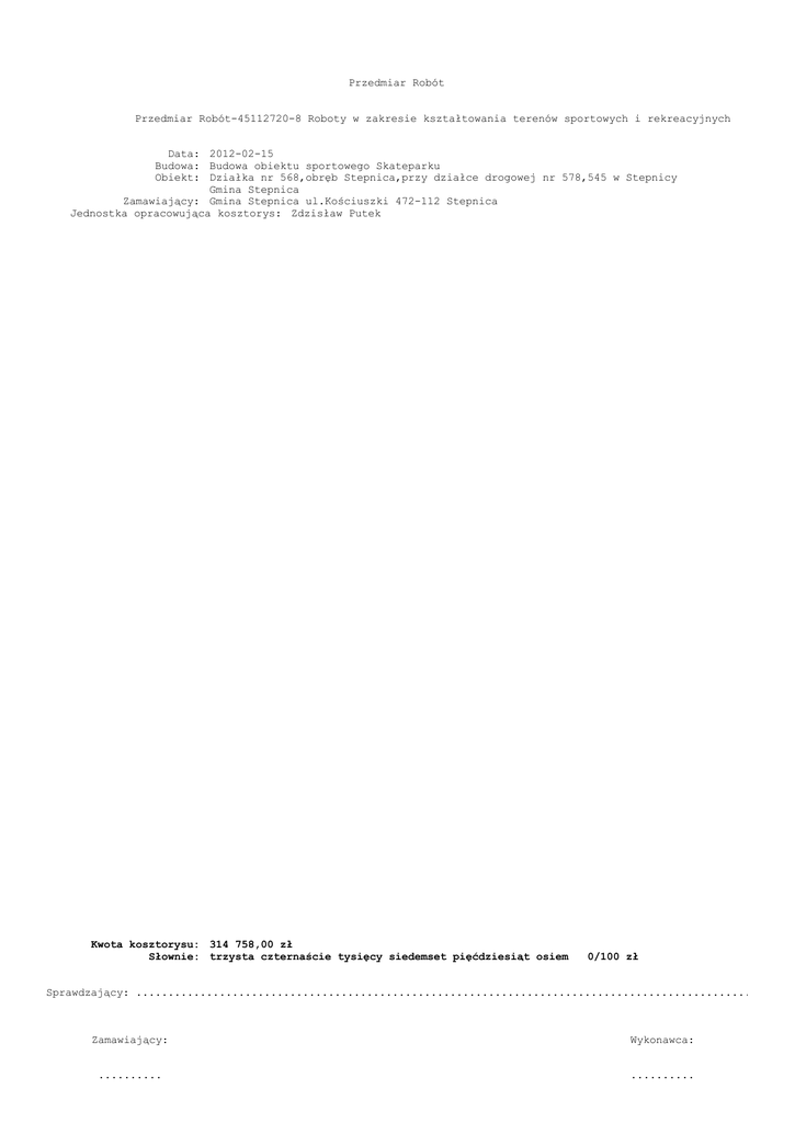 Przedmiar Robót Przedmiar Robót-45112720-8 Roboty w zakresie kształtowania terenów sportowych i rekreacyjnych Data: 2012-02-15 Budowa: Budowa obiektu sportowego Skateparku Obiekt: Działka nr 568,obręb Stepnica,przy działce drogowej nr 578,545 w Stepnicy Gmina Stepnica Zamawiający: Gmina Stepnica ul.Kościuszki 472-112 Stepnica Jednostka opracowująca kosztorys: Zdzisław Putek Kwota kosztorysu: 314 758,00 zł Słownie: trzysta czternaście tysięcy siedemset pięćdziesiąt osiem 0/100 zł Sprawdzający: ....................................................................................................... Zamawiający: Wykonawca: .......... .......... Zuzia (C) DataComp 1994-2008(lic. 10513) Ogólna charakterystyka obiektów lub robót Projekt przewiduje utwardzenie nawierzchni w formie płyty betonowej oraz takie jej ukształtowanie aby powstały żelbetowe przeszkody przystosowane do jazdy po nich na łyżworolkach, deskorolkach i rowerach. Zuzia (C) DataComp 1994-2008(lic. 10513) Zuzia (C) DataComp 1994-2008(lic. 10513) Założenia wyjściowe do kosztorysowania ZAŁOŻENIA WYJŚCIOWE DO KOSZTORYSOWANIA dla budowy obiektu sportowego Skateparku I.Dane techniczne, technologiczne i organizacyjne. I.1.Charakter obiektu Zakres opracowania obejmuje splantowanie części przedmiotowej działki w zakresie przewidzianym pod inwestycję, wykonanie projektowanej nawierzchni żelbetowej wraz z przeszkodami, chodników z kostki betonowej oraz montaż elementów małej architektury. Ponadto przewiduje się korektę istniejących nasypów dostosowując ich profil do projektowanej funkcji oraz uzupełnienie istniejących trawników w strefie bezpieczeństwa szerokości 2 m od płyty jak również terenu przyległego w niezbędnym zakresie. I.2.Plac budowy Koszty zagospodarowania i utrzymania placu budowy wraz z podłączeniami mediów wykonawca ponosi bezpośrednio w ramach własnych kosztów II. Założenia metodologiczne odnośnie określenia ceny ofertowej a)Cenę ofertową należy kalkulować w oparciu o przedmiar oraz z projektem budowlano -wykonawczym. Wycena uproszczona netto wg formuły: Ck = L x cj gdzie: Ck – cena kosztorysowa L – ilość ustalonych jednostek przedmiarowych cj – cena jednostkowa dla ustalonej jednostki przedmiarowej Brutto w odniesieniu do całości wymienionych prac wg formuły: Cb = Ck + Pv gdzie: Cb – cena brutto Ck – cena kosztorysowa PV – należny podatek od towarów i usług VAT Uwaga: Cena jednostkowa winna obejmować: robociznę jednostkową materiały jednostkowe w cenach “loco plac budowy” sprzęt jednostkowy koszty pośrednie zysk III.UWAGI DO SPORZĄDZONYCH PRZEDMIARÓW ROBÓT 1.Wg rozporządzenia Ministra Infrastruktury z dn. 18 maja 2004r. w sprawie określania metod i podstaw sporządzania kosztorysu inwestorskiego, obliczania planowanych kosztów prac projektowych oraz planowanych kosztów robót budowlanych określonych w programie funkcjonalno-użytkowym, przedmiar robót jest opracowaniem zawierającym zestawienie przewidywanych do wykonania robót w kolejności technologicznej ich wykonania. 2.Wg “Wzorcowej Dokumentacji Przetargowej dla robót budowanych” wydanej w roku 2004 przez Warszawskie Centrum Postępu Techniczno-Organizacyjnego Budownictwa “WACETOB”, przygotowanych na zlecenie Urzędu Zamówień Publicznych wynika: “Opisy poszczególnych pozycji przedmiaru robót nie mogą być traktowane jako ostatecznie definiujące wymagania dla danych robót. Nawet, jeżeli w przedmiarze tego nie podano, należy przyjmować że roboty ujęte w danej pozycji muszą być wykonane wg: - Specyfikacji technicznych i obowiązujących przepisów technicznych, - rysunków i wykazów zawartych w dokumentacji projektowej, - wiedzy technicznej, - wskazówek Zamawiającego lub jego przedstawiciela: zarządzającego realizacją umowy lub Inspektora nadzoru inwestorskiego. Jeżeli w opisie przedmiaru nie uwzględniono pewnych faz operacyjnych związanych z wykonaniem robót, to koszty tych faz operacyjnych powinny być przez wykonawcę uwzględnione w cenach wpisanych przy tych czy innych pozycjach przedmiaru Wykonawcy nie zezwala się na dodawanie żadnych nowych pozycji w którejkolwiek części przedmiaru robót. Jeżeli w przedmiarze nie uwzględniono pewnych robót uwidocznionych na rysunkach przekazanych wykonawcy, to koszty tych robót powinny być przez wykonawcę uwzględnione w cenach wpisanych przy istniejących pozycjach przedmiaru. Zuzia (C) DataComp 1994-2008(lic. 10513) Zuzia (C) DataComp 1994-2008(lic. 10513) Przedmiar robót Opis pozycji, wyliczenie ilości robót 1 Kody CPV: 45111000-8 Roboty w zakresie burzenia, roboty ziemne Roboty ziemne,przygotowawcze 1 Nr STWiOR: 01.01. Kody CPV: 45111200-0 Roboty w zakresie przygotowania terenu pod budowę i roboty ziemne Roboty ziemne koparkami przedsiębiernymi z transportem urobku samochodami samowyładowczymi do 1·km, koparka 0,60·m3, grunt kategorii III-przemieszczenie w obrębie budowy 27,60*0,5*6,45*1,25*2 = 222,53 222,53 2 Nr STWiOR: 01.01. Kody CPV: 45111200-0 Roboty w zakresie przygotowania terenu pod budowę i roboty ziemne Koryta wykonywane na całej szerokości jezdni i chodników, mechanicznie, grunt kategorii I-IV, na średnią głębokość 60·cm 18,70*10,7+0,5*(18,7+11,2)* 17,7-6,5*4,0 = 438,71 438,71 3 Nr STWiOR: 01.01. Kody CPV: 45111200-0 Roboty w zakresie przygotowania terenu pod budowę i roboty ziemne Roboty ziemne koparkami przedsiębiernymi z transportem urobku samochodami samowyładowczymi do 1·km, koparka 0,60·m3, grunt kategorii IV 438,71*0,6 = 263,23 7,0*4,5*0,75 = 23,63 286,86 4 Nr STWiOR: 01.01. Kody CPV: 45111200-0 Roboty w zakresie przygotowania terenu pod budowę i roboty ziemne Nakłady uzupełniające do tablic 0201-0213 za każde dalsze rozpoczęte 0,5·km odległości transportu, ponad 1·km samochodami samowyładowczymi, po drogach utwardzonych, grunt kategorii III-IV, samochód do 5·t 286,86 = 286,86 286,86 5 Nr STWiOR: 01.01. Kody CPV: 