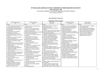 WYMAGANIA EDUKACYJNE Z CHEMII NA POSZCZEGÓLNE OCENY DLA KLAS I - III USTALONE ZGODNIE Z ZASADAMI POMIARU DYDAKTYCZNEGO Na rok szkolny 2016/2017 DLA KLASY I Nowa Era Substancje i ich przemiany Ocena dopuszczająca [1] Ocena dostateczna [1+2] Ocena dobra [1+2+3] Uczeń: – zalicza chemię do nauk przyrodniczych – stosuje zasady bezpieczeństwa obowiązujące w pracowni chemicznej – nazywa podstawowe szkło i sprzęt laboratoryjny – opisuje właściwości substancji stosowanych na co dzień – przeprowadza proste obliczenia z wykorzystaniem pojęć: masa, gęstość, objętość – odróżnia właściwości fizyczne od chemicznych substancji – dzieli substancje chemiczne na proste i złożone, na pierwiastki i związki chemiczne – definiuje pojęcie mieszanina substancji – opisuje cechy mieszanin jednorodnych i niejednorodnych – podaje przykłady mieszanin – opisuje proste metody rozdzielania mieszanin na składniki – definiuje pojęcia zjawisko fizyczne i reakcja chemiczna – podaje przykłady zjawisk fizycznych i reakcji chemicznych zachodzących w otoczeniu człowieka – definiuje pojęcia pierwiastek chemiczny i związek chemiczny – podaje przykłady związków chemicznych – klasyfikuje pierwiastki chemiczne na metale i niemetale – podaje przykłady pierwiastków chemicznych (metali i niemetali) – odróżnia metale i niemetale na podstawie ich właściwości Uczeń: – wyjaśnia, dlaczego chemia jest nauką przydatną ludziom – omawia, czym się zajmuje chemia – omawia sposób podziału chemii na organiczną i nieorganiczną – podaje zastosowania wybranych elementów sprzętu i szkła laboratoryjnego – wyjaśnia, czym się różni ciało fizyczne od substancji – opisuje właściwości substancji –wyjaśnia podstawowe sposoby rozdzielania mieszanin jednorodnych i niejednorodnych – sporządza mieszaninę – planuje rozdzielanie mieszanin (wymaganych) – opisuje różnicę w przebiegu zjawiska fizycznego i reakcji chemicznej – projektuje doświadczenia ilustrujące zjawisko fizyczne i reakcję chemiczną – definiuje stopy – podaje przykłady zjawisk fizycznych i reakcji chemicznych zachodzących w otoczeniu człowieka – formułuje obserwacje do doświadczenia – wyjaśnia potrzebę wprowadzenia symboliki chemicznej – rozpoznaje pierwiastki i związki chemiczne – wyjaśnia różnicę między pierwiastkiem a związkiem chemicznym – wymienia stałe i zmienne składniki powietrza – bada skład powietrza Uczeń: – identyfikuje substancje na podstawie podanych właściwości – podaje sposób rozdzielenia wskazanej mieszaniny – wskazuje różnice między właściwościami fizycznymi składników mieszaniny, które umożliwiają jej rozdzielenie – projektuje doświadczenia ilustrujące reakcję chemiczną i formułuje wnioski – wskazuje w podanych przykładach reakcję chemiczną i zjawisko fizyczne – wskazuje wśród różnych substancji mieszaninę i związek chemiczny – wyjaśnia różnicę między mieszaniną a związkiem chemicznym – proponuje sposoby zabezpieczenia produktów zawierających żelazo przed rdzewieniem – odszukuje w układzie okresowym pierwiastków podane pierwiastki chemiczne – opisuje doświadczenie wykonywane na lekcji – wykonuje obliczenia związane z zawartością procentową substancji występujących w powietrzu – wykrywa obecność tlenku węgla(IV) – opisuje właściwości tlenku węgla(II) - opisuje sposób identyfikowania gazów: wodoru, tlenu, tlenku węgla(IV) – wyjaśnia rolę procesu fotosyntezy w naszym życiu – podaje przykłady substancji szkodliwych dla środowiska – wyjaśnia, skąd się biorą kwaśne opady – określa zagrożenia wynikające z efektu cieplarnianego, dziury ozonowej, kwaśnych Ocena bardzo dobra [1+2+3+4] Ocena celująca [1+2+3+4+5] Uczeń: Uczeń: – wyjaśnia, na czym polega destylacja opisuje zasadę rozdziału w metodach – wyjaśnia, dlaczego gazy szlachetne są chromatograficznych bardzo mało aktywne chemicznie omawia dokładnie metodę skraplania – definiuje pojęcie patyna powietrza i rozdzielenia go na składniki – opisuje pomiar gęstości oblicza skład procentowy powietrza – – projektuje doświadczenie o podanym przelicza procenty objętościowe na tytule (rysuje schemat, zapisuje obserwacje masowe w różnych warunkach i wnioski) wykonuje obliczenia rachunkowe – – wykonuje doświadczenia z działu zadania dotyczące mieszanin Substancje i ich przemiany – przewiduje wyniki niektórych doświadczeń na podstawie posiadanej wiedzy – otrzymuje tlenek węgla(IV) w reakcji węglanu wapnia z kwasem chlorowodorowym – uzasadnia, na podstawie reakcji magnezu z tlenkiem węgla(IV), że tlenek węgla(IV) jest związkiem chemicznym węgla i tlenu – uzasadnia, na podstawie reakcji magnezu z parą wodną, że woda jest związkiem chemicznym tlenu i wodoru – planuje sposoby postępowania umożliwiające ochronę powietrza przed zanieczyszczeniami – identyfikuje substancje na podstawie schematów reakcji chemicznych – wykazuje zależność między rozwojem cywilizacji a występowaniem zagrożeń, 1 – opisuje, na czym polega rdzewienie (korozja) – posługuje się symbolami chemicznymi pierwiastków (H, O, N, Cl, S, C, P, Si, Na, K, Ca, Mg, Fe, Zn, Cu, Al, Pb, Sn, Ag, Hg) – opisuje skład i właściwości powietrza – określa, co to są stałe i zmienne składniki powietrza – opisuje właściwości fizyczne, chemiczne tlenu, tlenku węgla(IV), wodoru, azotu – podaje, że woda jest związkiem chemicznym wodoru i tlenu – tłumaczy, na czym polega zmiana stanów skupienia na przykładzie wody – omawia obieg wody w przyrodzie – określa znaczenie powietrza, wody, tlenu – określa, jak zachowują się substancje higroskopijne – opisuje, na czym polega reakcja syntezy, analizy, wymiany – omawia, na czym polega utlenianie, spalanie – definiuje pojęcia substrat i produkt reakcji chemicznej – wskazuj