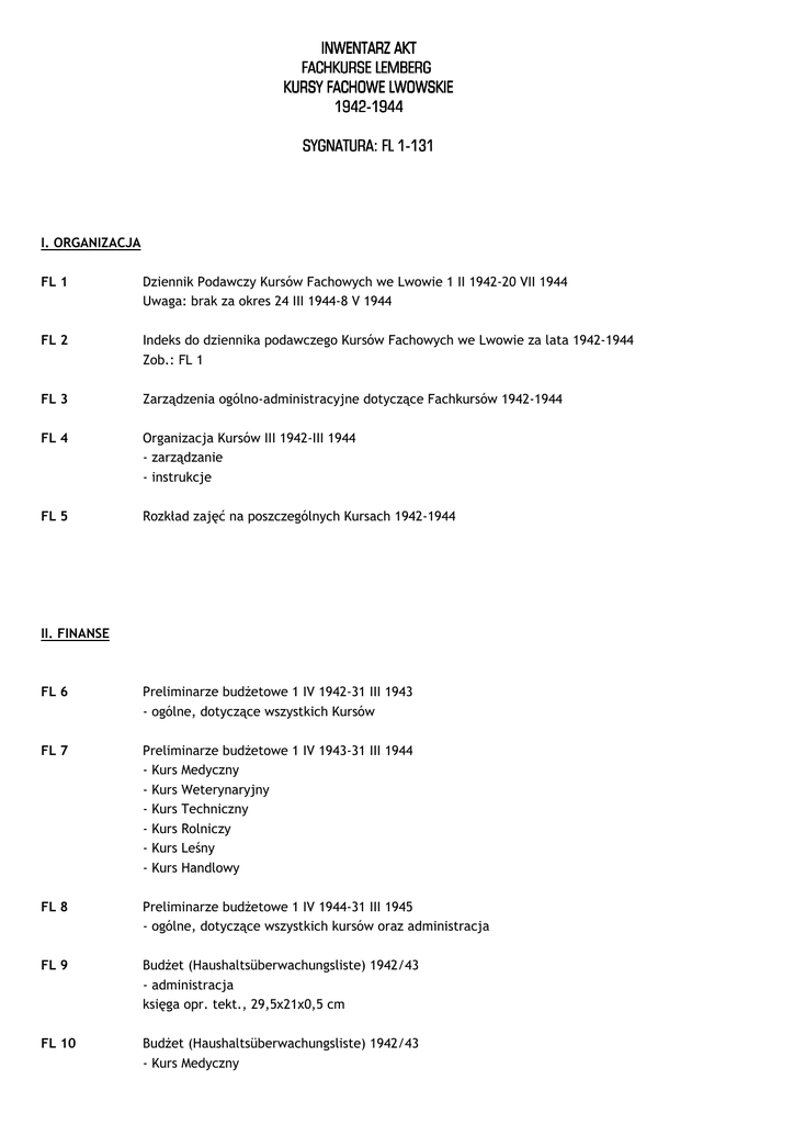 INWENTARZ AKT FACHKURSE LEMBERG KURSY FACHOWE LWOWSKIE 1942-1944 SYGNATURA: FL 1-131 I. ORGANIZACJA FL 1 Dziennik Podawczy Kursów Fachowych we Lwowie 1 II 1942-20 VII 1944 Uwaga: brak za okres 24 III 1944-8 V 1944 FL 2 Indeks do dziennika podawczego Kursów Fachowych we Lwowie za lata 1942-1944 Zob.: FL 1 FL 3 Zarządzenia ogólno-administracyjne dotyczące Fachkursów 1942-1944 FL 4 Organizacja Kursów III 1942-III 1944 - zarządzanie - instrukcje FL 5 Rozkład zajęć na poszczególnych Kursach 1942-1944 II. FINANSE FL 6 Preliminarze budŜetowe 1 IV 1942-31 III 1943 - ogólne, dotyczące wszystkich Kursów FL 7 Preliminarze budŜetowe 1 IV 1943-31 III 1944 - Kurs Medyczny - Kurs Weterynaryjny - Kurs Techniczny - Kurs Rolniczy - Kurs Leśny - Kurs Handlowy FL 8 Preliminarze budŜetowe 1 IV 1944-31 III 1945 - ogólne, dotyczące wszystkich kursów oraz administracja FL 9 BudŜet (Haushaltsüberwachungsliste) 1942/43 - administracja księga opr. tekt., 29,5x21x0,5 cm FL 10 BudŜet (Haushaltsüberwachungsliste) 1942/43 - Kurs Medyczny księga opr. tekt., 30x21x1 cm FL 11 BudŜet (Haushaltsüberwachungsliste) 1942/43 - Kurs Weterynaryjny księga opr. tekt., 30x21x1 cm FL 12 BudŜet (Haushaltsüberwachungsliste) 1942/43 - Kurs Farmaceutyczny księga opr. tekt., 30x21x0,5 cm FL 13 BudŜet (Haushaltsüberwachungsliste) 1942/43 - Kurs Techniczny księga opr. tekt., 30x21x1 cm FL 14 BudŜet (Haushaltsüberwachungsliste) 1942/43 - Kurs Rolniczy księga opr. tekt., 30x21x1 cm FL 15 BudŜet (Haushaltsüberwachungsliste) 1942/43 - Kurs Leśny księga opr. tekt., 30x21x1 cm FL 16 KsiąŜka kontowa (Anschreibungslisten) 1942/43 - administracja księga opr. tekt., 30x21x1 cm FL 17 Księgi kontowe (Anschreibungslisten) 1942/43 - wszystkie kursy księga opr. tekt., 30x21x0,5 cm FL 18 Sprawozdanie kasowe za rok budŜetowy 1942 FL 19 Korespondencja finansowa III 1942-V 1943 - zarządzanie - instrukcje - wyjaśnienia FL 20 Korespondencja finansowa VI 1943-V 1944 - zarządzanie - instrukcje - wyjaśnienia FL 21 Księga wypłat 1942 FL 22 Budynki Kursów XII 1942-IX 1943 Urządzenia zakładów - min. plan sytuacyjny budynków Instytutu Medycznego we Lwowie FL 23 Urządzenia przejęte z wyŜszych uczelni lwowskich X 1941-IX 1943 FL 24 Korespondencja komisaryczna zarządów wyŜszych uczelni i instytucja naukowych lwowskich 1942-1943 - Kommisarische Verwaltung der Universität - Kommisarische Verwaltung Handelshohcschule - Kommisarische Verwaltung Pedagogisches Hoch. - Kommisarische Verwaltung der Akademie der Wissenschaft FL 25 Obserwatorium Astronomiczne I-VI 1942 - organizacje, urządzenia III. PERSONALIA PRACOWNIKÓW FL 26 Zarządzanie, instrukcje, wyjaśnienia oraz dalsza korespondencja dotycząca spraw personalnych I 1942-VI 1944 FL 27 Akta osobowe pracowników naukowych 1942-1944 - Kurs Medyczny - Polacy Układ alfabetyczny, litery: A-H FL 28 Akta osobowe pracowników naukowych 1942-1944 - Kurs Medyczny - Polacy Układ alfabetyczny, litery: J-Kru FL 29 Akta osobowe pracowników naukowych 1942-1944 - Kurs Medyczny - Polacy Układ alfabetyczny, litery: Krw-O FL 30 Akta osobowe pracowników naukowych 1942-1944 - Kurs Medyczny - Polacy Układ alfabetyczny, litery: P-ś FL 31 Akta osobowe pracowników naukowych 1942-1944 - Kurs Medyczny - Ukraińcy Układ alfabetyczny, litery: A-G FL 32 Akta osobowe pracowników naukowych 1942-1944 - Kurs Medyczny - Ukraińcy Układ alfabetyczny, litery: H-Ko FL 33 Akta osobowe pracowników naukowych 1942-1944 - Kurs Medyczny - Ukraińcy Układ alfabetyczny, litery: Kr-P FL 34 Akta osobowe pracowników naukowych 1942-1944 - Kurs Medyczny - Ukraińcy Układ alfabetyczny, litery: R-ś FL 35 Akta osobowe pracowników naukowych 1942-1944 - Kurs Medyczny - Volksdeutsche FL 36 Akta osobowe pracowników administracyjno-fizycznych 1942-1944 - Kurs Medyczny - Polacy Układ alfabetyczny, litery: A-C FL 37 Akta osobowe pracowników administracyjno-fizycznych 1942-1944 - Kurs Medyczny - Polacy Układ alfabetyczny, litery: D-F FL 38 Akta osobowe pracowników administracyjno-fizycznych 1942-1944 - Kurs Medyczny - Polacy Układ alfabetyczny, litery: G-J FL 39 Akta osobowe pracowników administracyjno-fizycznych 1942-1944 - Kurs Medyczny - Polacy Układ alfabetyczny, litery: K FL 40 Akta osobowe pracowników administracyjno-fizycznych 1942-1944 - Kurs Medyczny - Polacy Układ alfabetyczny, litery: L-M FL 41 Akta osobowe pracowników administracyjno-fizycznych 1942-1944 - Kurs Medyczny - Polacy Układ alfabetyczny, litery: N-R FL 42 Akta osobowe pracowników administracyjno-fizycznych 1942-1944 - Kurs Medyczny - Polacy Układ alfabetyczny, litery: S-Ś FL 43 Akta osobowe pracowników administracyjno-fizycznych 1942-1944 - Kurs Medyczny - Polacy Układ alfabetyczny, litery: T-ś FL 44 Akta osobowe pracowników administracyjno-fizycznych 1942-1944 - Kurs Medyczny - Ukraińcy Układ alfabetyczny, litery: A-G FL 45 Akta osobowe pracowników administracyjno-fizycznych 1942-1944 - Kurs Medyczny - Ukraińcy Układ alfabetyczny, litery: H-Kos FL 46 Akta osobowe pracowników administracyjno-fizycznych 1942-1944 - Kurs Medyczny - Ukraińcy Układ alfabetyczny, litery: K-R FL 47 Akta osobowe pracowników administracyjno-fizycznych 1942-1944 - Kurs Medyczny - Ukraińcy Układ alfabetyczny, litery: S-ś FL 48 Akta osobowe pracowników administracyjno-fizycznych 1942-1944 - Kurs Medyczny - Niemcy, Volksdeutsche FL 49 Akta osobowe pracowników administracyjno-fizycznych 1942-1944 - Kurs Weterynaryjny - Polacy Układ alfabetyczny, litery: A-H FL 50 Akta osobowe pracowników administracyjno-fizycznych 1942-1944 - Kurs Weterynaryjny - Polacy Układ alfabetyczny, litery: J-N FL 51 Akta osobowe pracowników administracyjno-fizycznych 1942-1944 - Kurs Weterynaryjny - Polacy Układ alfabetyczny, litery: O-ś FL 52 Akta osobowe pracowników administracyjno-fizycznych 1942-1944 - Kurs Weterynaryjny - Ukraińcy Układ alfabetyczny, litery: A-ś FL 53 Akta osobowe pracowników administracyjno-fizycznych 1942-1944 - K