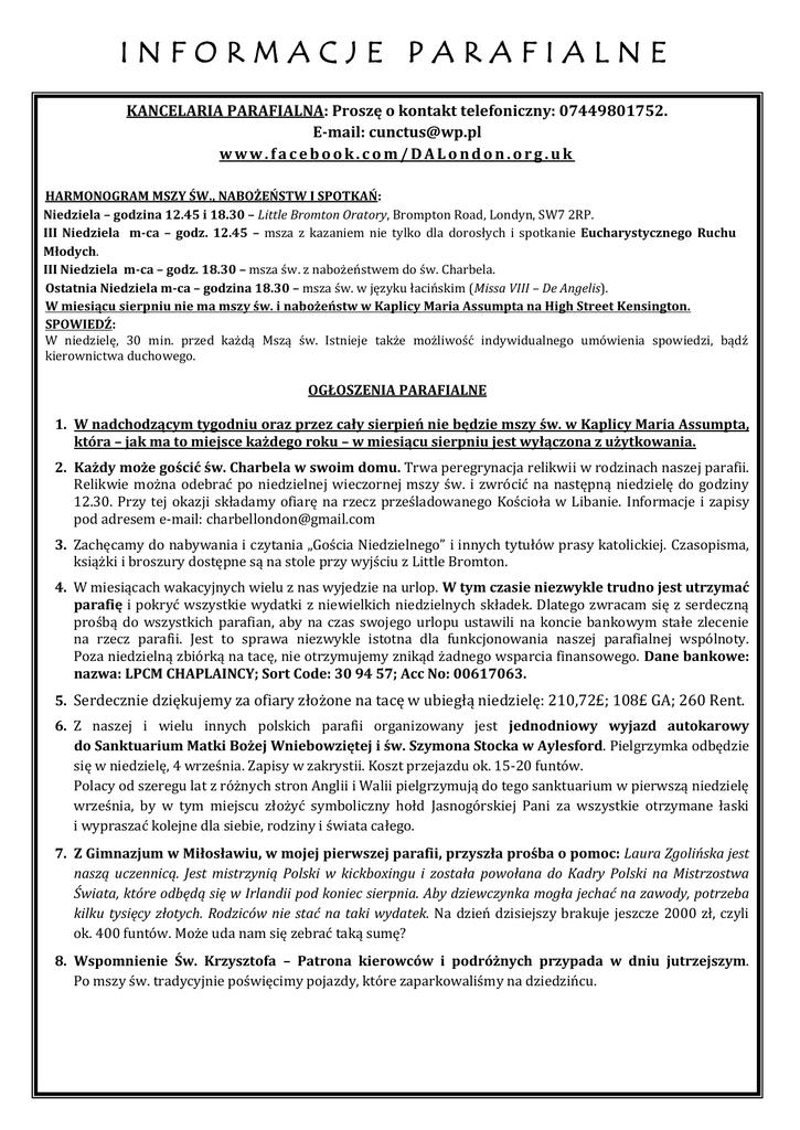 INFORMACJE PARAFIALNE KANCELARIA PARAFIALNA: Proszę o kontakt telefoniczny: 07449801752. E-mail: [email protected] www.facebook.com/DALondon.org.uk HARMONOGRAM MSZY ŚW., NABOŻEŃSTW I SPOTKAŃ: Niedziela – godzina 12.45 i 18.30 – Little Bromton Oratory, Brompton Road, Londyn, SW7 2RP. III Niedziela m-ca – godz. 12.45 – msza z kazaniem nie tylko dla dorosłych i spotkanie Eucharystycznego Ruchu Młodych. III Niedziela m-ca – godz. 18.30 – msza św. z nabożeństwem do św. Charbela. Ostatnia Niedziela m-ca – godzina 18.30 – msza św. w języku łacińskim (Missa VIII – De Angelis). W miesiącu sierpniu nie ma mszy św. i nabożeństw w Kaplicy Maria Assumpta na High Street Kensington. SPOWIEDŹ: W niedzielę, 30 min. przed każdą Mszą św. Istnieje także możliwość indywidualnego umówienia spowiedzi, bądź kierownictwa duchowego. OGŁOSZENIA PARAFIALNE 1. W nadchodzącym tygodniu oraz przez cały sierpień nie będzie mszy św. w Kaplicy Maria Assumpta, która – jak ma to miejsce każdego roku – w miesiącu sierpniu jest wyłączona z użytkowania. 2. Każdy może gościć św. Charbela w swoim domu. Trwa peregrynacja relikwii w rodzinach naszej parafii. Relikwie można odebrać po niedzielnej wieczornej mszy św. i zwrócić na następną niedzielę do godziny 12.30. Przy tej okazji składamy ofiarę na rzecz prześladowanego Kościoła w Libanie. Informacje i zapisy pod adresem e-mail: [email protected] 3. Zachęcamy do nabywania i czytania „Gościa Niedzielnego” i innych tytułów prasy katolickiej. Czasopisma, książki i broszury dostępne są na stole przy wyjściu z Little Bromton. 4. W miesiącach wakacyjnych wielu z nas wyjedzie na urlop. W tym czasie niezwykle trudno jest utrzymać parafię i pokryć wszystkie wydatki z niewielkich niedzielnych składek. Dlatego zwracam się z serdeczną prośbą do wszystkich parafian, aby na czas swojego urlopu ustawili na koncie bankowym stałe zlecenie na rzecz parafii. Jest to sprawa niezwykle istotna dla funkcjonowania naszej parafialnej wspólnoty. Poza niedzielną zbiórką na tacę, nie otrzymujemy znikąd żadnego wsparcia finansowego. Dane bankowe: nazwa: LPCM CHAPLAINCY; Sort Code: 30 94 57; Acc No: 00617063. 5. Serdecznie dziękujemy za ofiary złożone na tacę w ubiegłą niedzielę: 210,72£; 108£ GA; 260 Rent. 6. Z naszej i wielu innych polskich parafii organizowany jest jednodniowy wyjazd autokarowy do Sanktuarium Matki Bożej Wniebowziętej i św. Szymona Stocka w Aylesford. Pielgrzymka odbędzie się w niedzielę, 4 września. Zapisy w zakrystii. Koszt przejazdu ok. 15-20 funtów. Polacy od szeregu lat z różnych stron Anglii i Walii pielgrzymują do tego sanktuarium w pierwszą niedzielę września, by w tym miejscu złożyć symboliczny hołd Jasnogórskiej Pani za wszystkie otrzymane łaski i wypraszać kolejne dla siebie, rodziny i świata całego. 7. Z Gimnazjum w Miłosławiu, w mojej pierwszej parafii, przyszła prośba o pomoc: Laura Zgolińska jest naszą uczennicą. Jest mistrzynią Polski w kickboxingu i została powołana do Kadry Polski na Mistrzostwa Świata, które odbędą się w Irlandii pod koniec sierpnia. Aby dziewczynka mogła jechać na zawody, potrzeba kilku tysięcy złotych. Rodziców nie stać na taki wydatek. Na dzień dzisiejszy brakuje jeszcze 2000 zł, czyli ok. 400 funtów. Może uda nam się zebrać taką sumę? 8. Wspomnienie Św. Krzysztofa – Patrona kierowców i podróżnych przypada w dniu jutrzejszym. Po mszy św. tradycyjnie poświęcimy pojazdy, które zaparkowaliśmy na dziedzińcu. WIADOMOŚCI PARAFIALNE 24.07.2016 XVII NiedzielaZwykła Zwykła nr 121 (621) 04.07. – 11.07.2010 XIV Niedziela Lokalna Polska Misja Katolicka Chaplaincy przy Little Brompton Oratory w Londynie Tel: 07449801752 www.facebook.com/DALondon.org.uk ks. prałat Stefan Wylężek ks. Bartosz Rajewski Agnieszka Runowska – Rektor Polskiej Misji Katolickiej w Anglii i Walii – Proboszcz i Duszpasterz Akademicki – Prezes Rady Parafialnej I n t e n c j e m s z a l n e Niedziela – 24 lipca – XVII Niedziela Zwykła 12.45 – O szczęśliwe i zgodne z Bożą wolą rozwiązanie trudnej sprawy. 18.30 – W int. Małgorzaty i Piotra (z ok. 5r. ślubu) – o Boże bł., potrzebna łaski oraz wzrost w miłości małżeńskiej i rodzinnej. Z Ewangelii wg św. Łukasza (Łk 11, 1-13) Gdy Jezus przebywał w jakimś miejscu na modlitwie i skończył ją, rzekł jeden z uczniów do Niego: Panie, naucz nas się modlić, jak i Jan nauczył swoich uczniów. A On rzekł do nich: Kiedy się modlicie, mówcie: Ojcze, niech się święci Twoje imię; niech przyjdzie Twoje królestwo! Naszego chleba powszedniego dawaj nam na każdy dzień i przebacz nam nasze grzechy, bo i my przebaczamy każdemu, kto nam zawinił; i nie dopuść, byśmy ulegli pokusie. Dalej mówił do nich: Ktoś z was, mając przyjaciela, pójdzie do niego o północy i powie mu: Przyjacielu, użycz mi trzy chleby, bo mój przyjaciel przyszedł do mnie z drogi, a nie mam, co mu podać. Lecz tamten odpowie z wewnątrz: Nie naprzykrzaj mi się! Drzwi są już zamknięte i moje dzieci leżą ze mną w łóżku. Nie mogę wstać i dać tobie. Mówię wam: Chociażby nie wstał i nie dał z tego powodu, że jest jego przyjacielem, to z powodu natręctwa wstanie i da mu, ile potrzebuje. Ja wam powiadam: Proście, a będzie wam dane; szukajcie, a znajdziecie; kołaczcie, a otworzą wam. Każdy bowiem, kto prosi, otrzymuje; kto szuka, znajduje; a kołaczącemu otworzą. Jeżeli którego z was, ojców, syn poprosi o chleb, czy poda mu kamień? Albo o rybę, czy zamiast ryby poda mu węża? Lub też gdy prosi o jajko, czy poda mu skorpiona? Jeśli więc wy, choć źli jesteście, umiecie dawać dobre dary swoim dzieciom, o ileż bardziej Ojciec z nieba da Ducha Świętego tym, którzy Go proszą. Czwartek – 28 lipca – Św. Charbela 19.00 – NIE MA MSZY ŚW. Piątek – 29 lipca – Św. Marty 19.00 – NIE MA MSZY ŚW. Niedziel