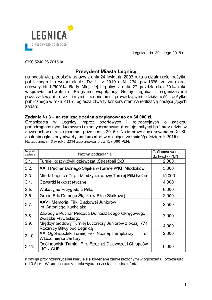 Legnica, dn. 20 lutego 2015 r. OKS.5240.26.2015.IX Prezydent Miasta Legnicy na podstawie przepisów ustawy z dnia 24 kwietnia 2003 roku o działalności pożytku publicznego i o wolontariacie (Dz. U. z 2010 r. Nr 234, poz.1536, ze zm.) oraz uchwały Nr L/509/14 Rady Miejskiej Legnicy z dnia 27 października 2014 roku w sprawie uchwalenia „Programu współpracy Gminy Legnica z organizacjami pozarządowymi oraz innymi podmiotami prowadzącymi działalność pożytku publicznego w roku 2015”, ogłasza otwarty konkurs ofert na realizację następujących zadań: Zadanie Nr 3 – na realizację zadania zaplanowano do 64.000 zł. Organizacja w Legnicy imprez sportowych i rekreacyjnych o zasięgu ponadregionalnym, krajowym i międzynarodowym (turnieje, mityngi itp.) oraz udział w zawodach w okresie marzec - październik 2015 r. Na imprezy zaplanowane na XI-XII zostanie ogłoszony otwarty konkurs ofert w miesiącu wrzesień/październik 2015 r. Na zadanie nr 3 w roku 2014 zaplanowano do 127.000 PLN. Nr podzadania Nazwa podzadania Dofinansowanie do kwoty (PLN): 3.1. Turniej koszykówki dziewcząt „Streetball 3x3” 2.000 3.2. XXIII Puchar Dolnego Śląska w Karate WKF Młodzików 3.000 3.3. Miedź Legnica Cup - Międzynarodowy Turniej Piłki Nożnej 15.000 3.4. Czwartki lekkoatletyczne 4.000 3.5. 3.6. Wakacyjna Przygoda z Piłką Grand Prix Dolnego Śląska w Piłce Siatkowej XXVII Memoriał Piłki Siatkowej Juniorów im. Antoniego Kuchciaka Zawody o Puchar Prezesa Dolnośląskiego Okręgowego Związku Pływackiego Międzynarodowy Turniej Łuczniczy Juniorów z okazji 774 Rocznicy Bitwy pod Legnicą XXI Ogólnopolski Turniej Piłki Nożnej Trampkarzy im. Włodzimierza Jantury Ogólnopolski Turniej Piłki Ręcznej Dziewcząt i Chłopców LION CUP 6.000 2.000 3.7. 3.8. 3.9. 3.10. 3.11. 2.500 3.000 4.000 2.000 6.000 Komisja przy rozstrzyganiu kieruje się kryteriami zamieszczonymi w ogłoszeniu, przyznając od 0-5 pkt. W ramach podzadania wybrana zostanie jedna oferta. 1 Zadanie Nr 5 - kwota dofinansowania do 5.000 PLN Organizacja i prowadzenie zajęć sportowo - rekreacyjnych dla dzieci i młodzieży z różnych środowisk i dyscyplin sportu Nr podzadania 5.1. Nazwa podzadania Akrobatyka – wszystkie kategorie wiekowe Dofinansowanie do kwoty (PLN) 5.000 Komisja przy rozstrzyganiu kieruje się kryteriami zamieszczonymi w ogłoszeniu przyznając od 0-5 pkt . W ramach podzadania zostanie wybrana jedna oferta. Na zadanie nr 5 w roku 2014 zaplanowano 65.000 PLN, w tym na podzadanie dotyczące akrobatyki 5.000 złotych. I. Cel i forma konkursu: Konkurs ma na celu udzielenie wsparcia finansowego dla realizacji zadań publicznych z zakresu upowszechniania kultury fizycznej. Forma –wspieranie. II. Zasady i warunki przyznawania dotacji 1. Podmioty uczestniczące w otwartym konkursie ofert i ubiegające się o dotację na realizację zadań powinny spełniać warunki ogólne: 1) posiadać osobowość prawną lub upoważnienie jednostki nadrzędnej, posiadającej osobowość prawną do złożenia oferty i podpisania umowy, dysponowania środkami finansowymi i ich rozliczania, 2) złożyć w terminie ofertę wypełnioną poprawnie i w sposób czytelny, zgodnie z zasadami uczciwej konkurencji, gwarantującą wykonanie zadania w sposób efektywny, oszczędny i terminowy, 3) wykazać posiadanie: niezbędnej wiedzy, kwalifikacji, doświadczeń, kadry i odpowiedniego zaplecza do realizacji konkretnego zadania. III. Sposób i termin składania ofert 1. Ofertę należy sporządzić z zachowaniem następujących zasad: 1) oferta powinna zostać przygotowana według wzoru stanowiącego załącznik do rozporządzenia Ministra Pracy i Polityki Społecznej z dnia 15 grudnia 2010 roku w sprawie wzoru oferty i ramowego wzoru umowy dotyczących realizacji zadania publicznego oraz sprawozdania z wykonania tego zadania (Dz. U. z 2011 r. Nr 6, poz. 25), 2) należy udzielić odpowiedzi na wszystkie pytania (oferta kompletnie wypełniona), jeśli którekolwiek pytanie nie dotyczy oferenta, czy zgłaszanego przez niego projektu/zadania, należy to jasno zaznaczyć, np. wpisać „nie dotyczy”; w przypadku znaku (przypis cyfrowy) postąpić według instrukcji, 3) w przypadku składania przez podmiot więcej niż jednej oferty (na realizację więcej niż jednego zadania publicznego), wymagany jest jeden komplet załączników (dołączony do jednej z ofert z odpowiednią adnotacją na pozostałych ofertach). 2.Oferta musi spełniać wszystkie wymogi formalne, ustalone w ustawie z dnia 24 kwietnia 2003 r. o działalności pożytku publicznego i o wolontariacie (Dz. U. z 2010 r. Nr 234, poz.1536, ze zm.). 2 3.Do wypełnionego formularza oferty podmioty biorące udział w konkursie ofert zobowiązane są dołączyć następujące dokumenty i oświadczenia: 1) kopia aktualnego odpisu z Krajowego Rejestru Sądowego, innego rejestru lub ewidencji. Odpis musi być zgodny z aktualnym stanem faktycznym i prawnym, niezależnie od tego, kiedy został wydany, 2) w przypadku gdy oferta została podpisana przez osobę lub osoby, których prawo do reprezentowania nie wynika z załączonego odpisu z Krajowego Rejestru Sądowego lub innego właściwego rejestru - dokument potwierdzający upoważnienie do działania w imieniu oferenta, 3) oświadczenie, że oferent posiada dokumenty potwierdzające niezbędne kwalifikacje i doświadczenie kadry oraz ma dostęp do odpowiedniej bazy sportowo rekreacyjnej do realizacji konkretnego podzadania. 4. Wszystkie dokumenty i zaświadczenia winny potwierdzać stan obecny, a kserokopie muszą być uwierzytelnione przez upoważnionego przedstawiciela podmiotu biorącego udział w konkursie. 5. Kompletne oferty wraz z załącznikami należy składać w zamkniętych kopertach z podaniem nazwy zadania oraz oferenta, w Kancelarii Urzędu Miasta Legnicy Plac Słowiański 8, lub przesłać pocztą na adres: Urząd Miasta Legnicy, Plac Słowiański 8, 59-220 Legnica, w nieprzekraczalnym terminie do 10 marca 2