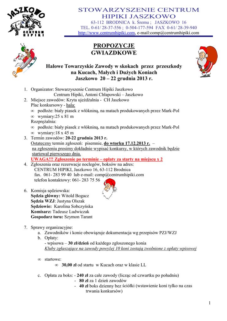 STOWARZYSZENIE CENTRUM HIPIKI JASZKOWO 63-112 BRODNICA k. Śremu ; JASZKOWO 16 TEL. 0-61/ 28-37-556 ; 0-504-177-594 FAX 0-61/ 28-39-940 http://www.centrumhipiki.com, e-mail:[email protected] PROPOZYCJE GWIAZDKOWE Halowe Towarzyskie Zawody w skokach przez przeszkody na Kucach, Małych i Dużych Koniach Jaszkowo 20 – 22 grudnia 2013 r. 1. Organizator: Stowarzyszenie Centrum Hipiki Jaszkowo Centrum Hipiki, Antoni Chłapowski – Jaszkowo 2. Miejsce zawodów: Kryta ujeżdżalnia - CH Jaszkowo Plac konkursowy - hala: • podłoże: biały piasek z włókniną, na matach produkowanych przez Mark-Pol • wymiary:25 x 81 m Rozprężalnia: • podłoże: biały piasek z włókniną, na matach produkowanych przez Mark-Pol • wymiary:18 x 45 m 3. Termin zawodów: 20-22 grudnia 2013 r. Ostateczny termin zgłoszeń: pisemnie, do wtorku 17.12.2013 r. – na zgłoszeniu prosimy dokładnie wypisać konkursy, w których zawodnik będzie startował pierwszego dnia. UWAGA!!! Zgłoszenie po terminie – opłaty za starty na miejscu x 2 4. Zgłoszenia oraz rezerwacje noclegów, boksów na adres: CENTRUM HIPIKI, Jaszkowo 16, 63-112 Brodnica fax. 061- 283 99 40 lub e-mail: [email protected] telefon kontaktowy: 061- 283 75 56 6. Komisja sędziowska: Sędzia główny: Witold Bogacz Sędzia WZJ: Justyna Olszak Sędziowie: Karolina Sobczyńska Komisarz: Tadeusz Ludwiczak Gospodarz toru: Szymon Tarant 7. Sprawy organizacyjne: a. Zawodników i konie obowiązuje dokumentacja wg przepisów PZJ/WZJ b. Opłaty: - wpisowa – 30 zł/dzień od każdego zgłoszonego konia Kluby zgłaszające na zawody powyżej 10 koni zostają zwolnione z opłaty wpisowej • startowe: • 30,00 zł od startu w Kucach oraz w klasie LL c. Opłata za boks: - 240 zł za całe zawody (licząc od czwartku po południu) - 80 zł za 1 dzień zawodów - 40 zł boks dzienny bez ściółki (wstawienie koni tylko na czas trwania konkursów) 1 Ściółka standard – słoma, 50 zł – dopłata za trociny (za 1 balot) Dla klubu zgłaszającego powyżej 10 koni opłata za boks 210 zł za całe zawody, 70 zł za 1 dzień zawodów d. Organizator nie ponosi żadnej odpowiedzialności w razie wypadków, zachorowań zawodników, członków ekip i koni, jak również w przypadku kradzieży, zniszczeń, pożarów i innych zdarzeń . e. Organizator zastrzega sobie prawo do zmian w programie f. Sprawdzanie dokumentów dla zawodników w kat. Kucy i Małych Koni od godz. 7.30 g. Sprawdzanie dokumentów dla zawodników w kat. Dużych Koni 14.12 (piątek) od godz. 11.30, 15-16.12 (sobota-niedziela) od godz. 09.00. h. Każda zmiana na liście startowej po jej wydrukowaniu – opłata 20 zł (nie dotyczy skreśleń z listy) i. Zakwaterowanie i wyżywienie na miejscu. j. Rezerwacje noclegów w samym Jaszkowie wg. kolejności zgłoszeń. Nowy pensjonat już jest otwarty, pokoje z łazienkami. Ceny noclegów bez śniadania: Oficyna: - 60 zł/nocleg/os. Mieszkania 2-3 pokojowe, pokoje 3 osobowe, w każdym mieszkaniu łazienka + WC. Pokój 1 os – 100 zł/nocleg Internat: - 50 zł/nocleg/os. 30 zł/nocleg/os. – łóżka piętrowe Pokoje 2,3,4 osobowe, w pokoju umywalka z ciepłą i zimną wodą. Łazienki wspólne dla kilku pokoi, na korytarzu. Pokoje z łóżkami piętrowymi 5-6 osobowe. Pokój 1 os – 100 zł/os Pałac: 200 zł - pokój 2 osobowy 150 zł - pokój 1 osobowy Pokoje z łazienkami. Istnieje możliwość dostawki – 70 zł/nocleg/os. Nowy pensjonat: - 160 zł – pokój 2 os. - 120 zł – pokój 1 os. Podłączenie przyczepy do prądu – 50 zł za dzień. Na zgłoszeniu proszę zaznaczyć, że będą Państwo korzystać z przyłącza prądu. Każdy kto nocuje na terenie ośrodka w przyczepie, samochodzie opłata 10 zł/dzień za toalety i prysznice . Lekarz medycyny obecny na terenie zawodów przez całe zawody. PROGRAM ZAWODÓW PIĄTEK 20.12.2013 r - godz. 11.00 Konkurs nr T1 - LL dokładności bez rozgrywki „Towarzyski” Art. 238.1.1 SOBOTA 21.12.2013 r. Konkursy dla Kuców, Małych i Dużych Koni - godz. 8.00 Konkurs nr T2 Konkurs nr T3 Konkurs nr T4 - 50 cm - 60 cm - 70 cm zwykły „Towarzyski” zwykły „Towarzyski” zwykły „Towarzyski” Art. 238.2.1 Art. 238.2.1 Art. 238.2.1 2 Konkurs nr T5 Konkurs nr T6 Konkurs nr T7 - 80 cm - 90 cm LL zwykły „Towarzyski” Art. 238.2.1 zwykły „Towarzyski” Art. 238.2.1 dokładności bez rozgrywki „Towarzyski” Art. 238.1.1 W sobotę odbędzie się wspólne spotkanie opłatkowe z poczęstunkiem i zabawą. NIEDZIELA 22.12.2013 r. Konkursy dla Kuców, Małych i Dużych Koni – godz. 8.00 Konkurs nr T8 Konkurs nr T9 Konkurs nr T10 Konkurs nr T11 Konkurs nr T12 Konkurs nr T13 - 50 cm - 60 cm - 70 cm - 80 cm - 90 cm LL zwykły „Towarzyski” Art. 238.2.1 zwykły „Towarzyski” Art. 238.2.1 zwykły „Towarzyski” Art. 238.2.1 zwykły „Towarzyski” Art. 238.2.1 zwykły „Towarzyski” Art. 238.2.1 dokładności bez rozgrywki „Towarzyski” Art. 238.1.1 1. Nagrody: nagrody rzeczowe w konkursach T2-T6, T8-T12 flots dla 25 % startujących w/w konkursach Godziny rozpoczęcia konkursów mogą ulec zmianie po zapoznaniu się z ilością zgłoszeń Zawody towarzyskie są rozgrywane zgodnie z uchwałą PZJ z dnia 06.02.2013 roku dotyczących zasad organizacji konkursów towarzyskich w jeździectwie. Serdecznie zapraszamy! 3