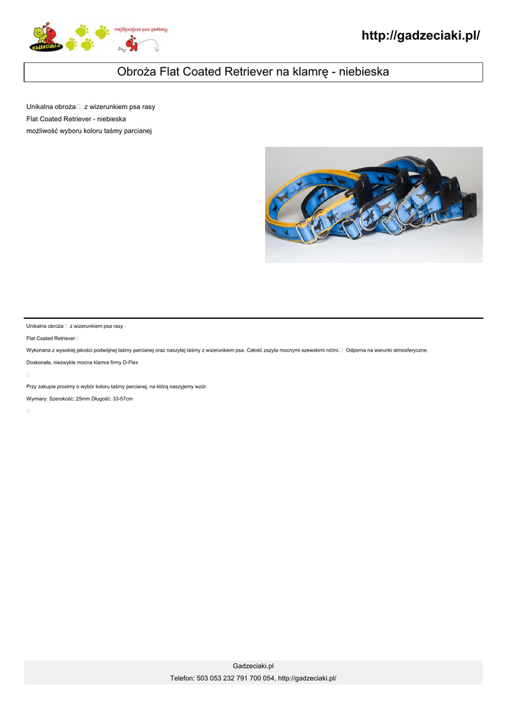 http://gadzeciaki.pl/ Obroża Flat Coated Retriever na klamrę - niebieska Unikalna obroża z wizerunkiem psa rasy Flat Coated Retriever - niebieska możliwość wyboru koloru taśmy parcianej Unikalna obroża z wizerunkiem psa rasy Flat Coated Retriever Wykonana z wysokiej jakości podwójnej taśmy parcianej oraz naszytej taśmy z wizerunkiem psa. Całość zszyta mocnymi szewskimi nićmi. Odporna na warunki atmosferyczne. Doskonała, niezwykle mocna klamra firmy D-Flex Przy zakupie prosimy o wybór koloru taśmy parcianej, na którą naszyjemy wzór. Wymiary: Szerokość: 25mm Długość: 33-57cm Gadzeciaki.pl Telefon: 503 053 232 791 700 054, http://gadzeciaki.pl/ http://gadzeciaki.pl/ Gadzeciaki.pl Telefon: 503 053 232 791 700 054, http://gadzeciaki.pl/