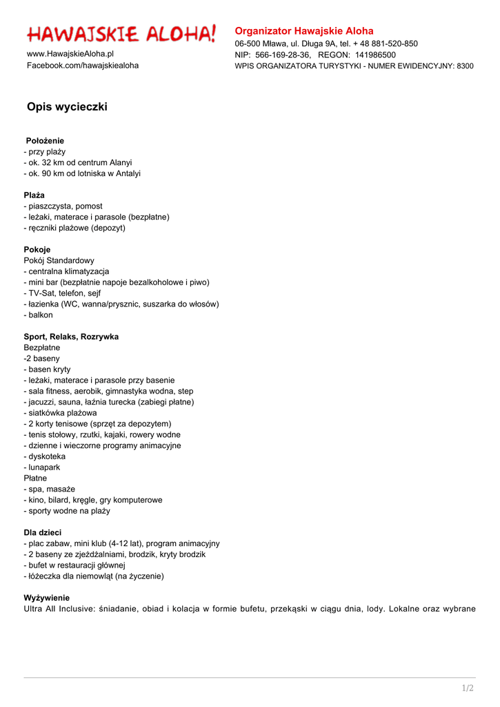 Organizator Hawajskie Aloha www.HawajskieAloha.pl Facebook.com/hawajskiealoha 06-500 Mława, ul. Długa 9A, tel. + 48 881-520-850 NIP: 566-169-28-36, REGON: 141986500 WPIS ORGANIZATORA TURYSTYKI - NUMER EWIDENCYJNY: 8300 Opis wycieczki Położenie - przy plaży - ok. 32 km od centrum Alanyi - ok. 90 km od lotniska w Antalyi Plaża - piaszczysta, pomost - leżaki, materace i parasole (bezpłatne) - ręczniki plażowe (depozyt) Pokoje Pokój Standardowy - centralna klimatyzacja - mini bar (bezpłatnie napoje bezalkoholowe i piwo) - TV-Sat, telefon, sejf - łazienka (WC, wanna/prysznic, suszarka do włosów) - balkon Sport, Relaks, Rozrywka Bezpłatne -2 baseny - basen kryty - leżaki, materace i parasole przy basenie - sala fitness, aerobik, gimnastyka wodna, step - jacuzzi, sauna, łaźnia turecka (zabiegi płatne) - siatkówka plażowa - 2 korty tenisowe (sprzęt za depozytem) - tenis stołowy, rzutki, kajaki, rowery wodne - dzienne i wieczorne programy animacyjne - dyskoteka - lunapark Płatne - spa, masaże - kino, bilard, kręgle, gry komputerowe - sporty wodne na plaży Dla dzieci - plac zabaw, mini klub (4-12 lat), program animacyjny - 2 baseny ze zjeżdżalniami, brodzik, kryty brodzik - bufet w restauracji głównej - łóżeczka dla niemowląt (na życzenie) Wyżywienie Ultra All Inclusive: śniadanie, obiad i kolacja w formie bufetu, przekąski w ciągu dnia, lody. Lokalne oraz wybrane 1/2 importowane napoje alkoholowe i bezalkoholowe serwowane są w godzinach 09:00-02:00 w wybranych barach, w delphin pub do 06:00. Raz na pobyt możliwość skorzystania z restauracji a’ la carte, po uprzedniej rezerwacji. Restauracje i bary - restauracja główna - 7 restauracji a l’a carte: turecka, rybna, chińska, japońska, włoska, śródziemnomorska, meksykańska - lobby bar - bar przy basenie - bar na plaży - bar witaminowy - bar w dyskotece Dodatkowe informacje - obiekt otwarty w 2001 roku, wyremontowany w 2012 roku - hotel dysponuje 500 pokojami - internet Wi-Fi w lobby (bezpłatny) - kawiarenka internetowa - fryzjer, sklepy, pralnia, punkt wymiany walut - lekarz - bezpłatny shutte bus do Alany i Side Biuro Podróży Hawajskie Aloha posiada pozwolenie Organizatora Imprez Turystycznych na cały świat, numer ewidencyjny 8300, zaświadczenie 1399 dokument wydany przez Urząd Marszałkowski woj. Mazowieckiego. Posiadamy również aktualną gwarancje ubezpieczeniową spełniająca rozporządzenie Ministra Finansów z dnia 16.12.2010r. w sprawie sumy gwarancji ubezpieczeniowej wymaganej w związku z prowadzoną działalnością gospodarczą jako Organizator Usług Turystycznych. Dokumenty firmy są dostępne na stronie internetowej www.hawajskiealoha.pl zakładka firma / dokumenty. 2/2