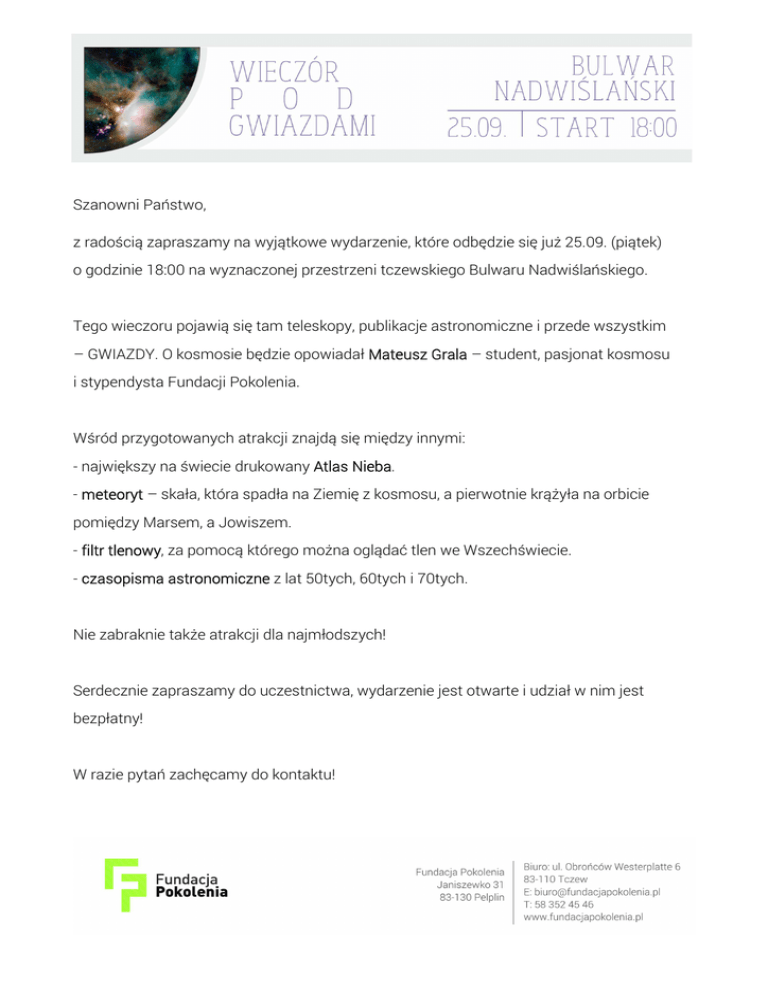 Szanowni Państwo, z radością zapraszamy na wyjątkowe wydarzenie, które odbędzie się już 25.09. (piątek) o godzinie 18:00 na wyznaczonej przestrzeni tczewskiego Bulwaru Nadwiślańskiego. Tego wieczoru pojawią się tam teleskopy, publikacje astronomiczne i przede wszystkim – GWIAZDY. O kosmosie będzie opowiadał Mateusz Grala – student, pasjonat kosmosu i stypendysta Fundacji Pokolenia. Wśród przygotowanych atrakcji znajdą się między innymi: - największy na świecie drukowany Atlas Nieba. - meteoryt – skała, która spadła na Ziemię z kosmosu, a pierwotnie krążyła na orbicie pomiędzy Marsem, a Jowiszem. - filtr tlenowy, za pomocą którego można oglądać tlen we Wszechświecie. - czasopisma astronomiczne z lat 50tych, 60tych i 70tych. Nie zabraknie także atrakcji dla najmłodszych! Serdecznie zapraszamy do uczestnictwa, wydarzenie jest otwarte i udział w nim jest bezpłatny! W razie pytań zachęcamy do kontaktu!