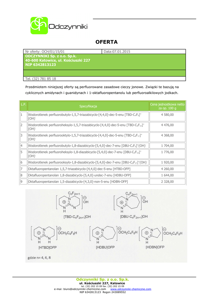 OFERTA Nr oferty: OCH/01/15/01 ODCZYNNIKI Sp. z o.o. Sp.k. 40-600 Katowice, ul. Kościuszki 227 NIP 6342813123 Data:07.01.2015 Tel. (32) 781 85 18 Przedmiotem niniejszej oferty są perfluorowane zasadowe cieczy jonowe. Związki te bazują na cyklicznych amidynach i guanidynach i 1-oktafluoropentanolu lub perfluoroalkilowych jodkach. L.P. Cena jednostkowa netto za op. 100 g Specyfikacja 1 Wodorotlenek perfluorobutylo-1,5,7-triazabicyclo-[4,4,0]-dec-5-enu [TBD-C 4F9]+ (OH)- 4 580,00 2 Wodorotlenek perfluoroheksylo-1,5,7-triazabicyclo-[4,4,0]-dec-5-enu [TBD-C 6F13]+ (OH)- 4 476,00 3 Wodorotlenek perfluorooktylo-1,5,7-triazabicyclo-[4,4,0]-dec-5-enu [TBD-C 8F17]+ (OH)- 4 368,00 4 Wodorotlenek perfluorobutylo-1,8-diazabicyclo-[5,4,0]-dec-7-enu [DBU-C 4F9]+(OH)- 1 704,00 + 5 Wodorotlenek perfluoroheksylo-1,8-diazabicyclo-[5,4,0]-dec-7-enu [DBU-C 6F13] (OH)- 1 776,00 6 Wodorotlenek perfluorooksylo-1,8-diazabicyclo-[5,4,0]-dec-7-enu [DBU-C 8F17]+(OH)- 1 920,00 7 Oktafluoropentanolan 1,5,7-triazabicyclo-[4,4,0]-dec-5-enu [HTBD-OFP] 4 260,00 8 Oktafluoropentanolan 1,8-diazabicyclo-[5,4,0]-undec-7-enu [HDBU-OFP] 1 644,00 9 Oktafluoropentanolan 1,5-diazabicyclo-[4,3,0]-non-5-enu [HDBN-OFP] 2 328,00 Odczynniki Sp. z o.o. Sp.k. ul. Kościuszki 227, Katowice tel. (32) 202 15 09 fax. (32) 202 15 09 e-mai: [email protected] www.odczynniki-chemiczne.com NIP 6342813123 Regon 243089552 N Zasadowe ciecze jonowe, będące przedmiotem oferty , są nowym typem związków opracowanych przez ICSO oraz Abo Akademi University, mogą być stosowane jako katalizatory zasadowe w wielu reakcjach chemicznych takich jak: - kondensacja aldolowa, - reakcja Michaela - sprzęganie Suzuki. Związki te mogą również znaleźć zastosowanie w konwersji biomasy, procesach absorpcji dwutlenku węgla i w przemyśle farmaceutycznym. Związki te charakteryzują się wysoką zasadowością. Aktywność katalityczna opracowanych cieczy jonowych była badana w reakcjach metanolizy oleju rzepakowego i transestryfikacji estrów metylowych kwasów tłuszczowych z alkoholami , takimi jak: 2-etyloheksanol, glikol neopentylowy i trimetylopropanol. Przeprowadzone badania potwierdziły wysoką aktywność katalityczną opracowanych cieczy jonowych w reakcjach transestryfikacji dużych cząsteczek ze znaczną przeszkodą steryczną. Podane ceny podlegają negocjacji. W przypadku zainteresowania powyższą ofertą, prosimy o przesłanie zapytania cenowego na adres e-mail: [email protected] lub faxem 32/ 205 15 09. Z poważaniem Monika Kolanko Odczynniki Sp. z o.o. Sp.k. ul. Kościuszki 227, Katowice tel. (32) 202 15 09 fax. (32) 202 15 09 e-mai: [email protected] www.odczynniki-chemiczne.com NIP 6342813123 Regon 243089552 N