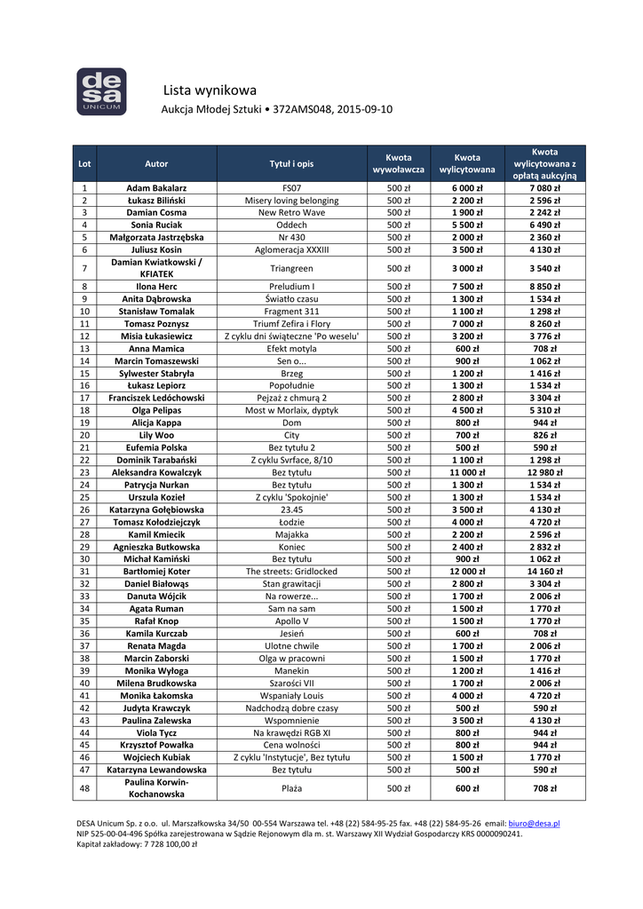 Lista wynikowa Aukcja Młodej Sztuki • 372AMS048, 2015-09-10 Lot Autor Tytuł i opis Kwota wywoławcza Kwota wylicytowana 1 2 3 4 5 6 Adam Bakalarz Łukasz Biliński Damian Cosma Sonia Ruciak Małgorzata Jastrzębska Juliusz Kosin Damian Kwiatkowski / KFIATEK Ilona Herc Anita Dąbrowska Stanisław Tomalak Tomasz Poznysz Misia Łukasiewicz Anna Mamica Marcin Tomaszewski Sylwester Stabryła Łukasz Lepiorz Franciszek Ledóchowski Olga Pelipas Alicja Kappa Lily Woo Eufemia Polska Dominik Tarabański Aleksandra Kowalczyk Patrycja Nurkan Urszula Kozieł Katarzyna Gołębiowska Tomasz Kołodziejczyk Kamil Kmiecik Agnieszka Butkowska Michał Kamiński Bartłomiej Koter Daniel Białowąs Danuta Wójcik Agata Ruman Rafał Knop Kamila Kurczab Renata Magda Marcin Zaborski Monika Wyłoga Milena Brudkowska Monika Łakomska Judyta Krawczyk Paulina Zalewska Viola Tycz Krzysztof Powałka Wojciech Kubiak Katarzyna Lewandowska Paulina KorwinKochanowska FS07 Misery loving belonging New Retro Wave Oddech Nr 430 Aglomeracja XXXIII 500 zł 500 zł 500 zł 500 zł 500 zł 500 zł 6 000 zł 2 200 zł 1 900 zł 5 500 zł 2 000 zł 3 500 zł Kwota wylicytowana z opłatą aukcyjną 7 080 zł 2 596 zł 2 242 zł 6 490 zł 2 360 zł 4 130 zł Triangreen 500 zł 3 000 zł 3 540 zł Preludium I Światło czasu Fragment 311 Triumf Zefira i Flory Z cyklu dni świąteczne 'Po weselu' Efekt motyla Sen o... Brzeg Popołudnie Pejzaż z chmurą 2 Most w Morlaix, dyptyk Dom City Bez tytułu 2 Z cyklu Svrface, 8/10 Bez tytułu Bez tytułu Z cyklu 'Spokojnie' 23.45 Łodzie Majakka Koniec Bez tytułu The streets: Gridlocked Stan grawitacji Na rowerze... Sam na sam Apollo V Jesień Ulotne chwile Olga w pracowni Manekin Szarości VII Wspaniały Louis Nadchodzą dobre czasy Wspomnienie Na krawędzi RGB XI Cena wolności Z cyklu 'Instytucje', Bez tytułu Bez tytułu 500 zł 500 zł 500 zł 500 zł 500 zł 500 zł 500 zł 500 zł 500 zł 500 zł 500 zł 500 zł 500 zł 500 zł 500 zł 500 zł 500 zł 500 zł 500 zł 500 zł 500 zł 500 zł 500 zł 500 zł 500 zł 500 zł 500 zł 500 zł 500 zł 500 zł 500 zł 500 zł 500 zł 500 zł 500 zł 500 zł 500 zł 500 zł 500 zł 500 zł 7 500 zł 1 300 zł 1 100 zł 7 000 zł 3 200 zł 600 zł 900 zł 1 200 zł 1 300 zł 2 800 zł 4 500 zł 800 zł 700 zł 500 zł 1 100 zł 11 000 zł 1 300 zł 1 300 zł 3 500 zł 4 000 zł 2 200 zł 2 400 zł 900 zł 12 000 zł 2 800 zł 1 700 zł 1 500 zł 1 500 zł 600 zł 1 700 zł 1 500 zł 1 200 zł 1 700 zł 4 000 zł 500 zł 3 500 zł 800 zł 800 zł 1 500 zł 500 zł 8 850 zł 1 534 zł 1 298 zł 8 260 zł 3 776 zł 708 zł 1 062 zł 1 416 zł 1 534 zł 3 304 zł 5 310 zł 944 zł 826 zł 590 zł 1 298 zł 12 980 zł 1 534 zł 1 534 zł 4 130 zł 4 720 zł 2 596 zł 2 832 zł 1 062 zł 14 160 zł 3 304 zł 2 006 zł 1 770 zł 1 770 zł 708 zł 2 006 zł 1 770 zł 1 416 zł 2 006 zł 4 720 zł 590 zł 4 130 zł 944 zł 944 zł 1 770 zł 590 zł Plaża 500 zł 600 zł 708 zł 7 8 9 10 11 12 13 14 15 16 17 18 19 20 21 22 23 24 25 26 27 28 29 30 31 32 33 34 35 36 37 38 39 40 41 42 43 44 45 46 47 48 DESA Unicum Sp. z o.o. ul. Marszałkowska 34/50 00-554 Warszawa tel. +48 (22) 584-95-25 fax. +48 (22) 584-95-26 email: [email protected] NIP 525-00-04-496 Spółka zarejestrowana w Sądzie Rejonowym dla m. st. Warszawy XII Wydział Gospodarczy KRS 0000090241. Kapitał zakładowy: 7 728 100,00 zł Lista wynikowa Aukcja Młodej Sztuki • 372AMS048, 2015-09-10 49 50 51 52 53 55 56 57 58 59 60 61 62 63 64 Dominik Woźniak Beata Filipowicz Piotr Woroniec Jr Jacek Malinowski Filip Gruszczyński Bartosz Michał HoppeSadowski Kamil Sarnowski Dominik Smolik Łukasz Stobiecki Campio Karolina Kucharska Magdalena Laskowska Magdalena Szilke Adrian Tkaczyk Marta Szarek- Michalak Izabela Ciastoń 65 Jakub Senderowski 66 67 68 69 70 71 72 73 74 75 Honorata Świderska Katarzyna Matylda Kręcicka Jarosław Szewczyk Ewa Guzy Mateusz Suda Katarzyna Orońska / Orno Janusz Orzechowski Edyta Duduś Grzegorz Klimek Janina Zaborowska 54 W drodze Przestrzeń I Fragmenty Il ricordo di Venezia "Pablo i Ewolwenta" 500 zł 500 zł 500 zł 500 zł 500 zł 1 700 zł 1 200 zł 1 400 zł 1 100 zł 1 200 zł 2 006 zł 1 416 zł 1 652 zł 1 298 zł 1 416 zł After for the range 500 zł 1 500 zł 1 770 zł Bez tytułu Piano sonata Przemijanie, dyptyk Spectrum Pan Tukan Las II Krowy Rider 13 Dance and... dance Że co? Audrey Hepburn Breakfast at Tiffany’s Makatka 8 Circus Tłum Fashion victims XXXXXXXXII Powierzchowna niedostępność Czytaj mi jeszcze Rekultywacja Sowy I Polowanie Bez tytułu 500 zł 500 zł 500 zł 500 zł 500 zł 500 zł 500 zł 500 zł 500 zł 500 zł 500 zł 1 900 zł 600 zł 1 300 zł 3 200 zł 800 zł 700 zł 3 200 zł 1 000 zł 2 200 zł 590 zł 2 242 zł 708 zł 1 534 zł 3 776 zł 944 zł 826 zł 3 776 zł 1 180 zł 2 596 zł 500 zł 600 zł 708 zł 500 zł 500 zł 500 zł 500 zł 500 zł 500 zł 500 zł 500 zł 500 zł 500 zł 500 zł 600 zł 600 zł 800 zł 500 zł 1 600 zł 5 500 zł 2 000 zł 7 500 zł 600 zł 167 900 zł 590 zł 708 zł 708 zł 944 zł 590 zł 1 888 zł 6 490 zł 2 360 zł 8 850 zł 708 zł 198 122 zł DESA Unicum Sp. z o.o. ul. Marszałkowska 34/50 00-554 Warszawa tel. +48 (22) 584-95-25 fax. +48 (22) 584-95-26 email: [email protected] NIP 525-00-04-496 Spółka zarejestrowana w Sądzie Rejonowym dla m. st. Warszawy XII Wydział Gospodarczy KRS 0000090241. Kapitał zakładowy: 7 728 100,00 zł