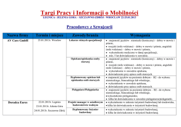 Targi Pracy i Informacji o Mobilności LEGNICA– JELENIA GORA – SZCZAWNO-ZDRÓJ - WROCŁAW 22-25.01.2013 Pracodawcy z Szwajcarii Nazwa firmy Termin i miejsce Zawody/branża Wymagania AV Care GmbH 25.01.2013r. Wrocław Lekarze różnych specjalizacji znajomość języków : niemiecki (konieczny) – dobry w mowie i piśmie, rosyjski (mile widziane) – dobry w mowie i piśmie, angielski (mile widziane) – dobry w mowie i piśmie, wykształcenie medyczne w danej specjalizacji, min. 5 lat doświadczenia w zawodzie. znajomość języków : niemiecki (konieczny) – dobry w mowie i piśmie, rosyjski (mile widziane) – dobry w mowie i piśmie, angielski (mile widziane) – dobry w mowie i piśmie, wykształcenie w zawodzie opiekuna, doświadczenie przy opiece osób starszych. znajomość języków na poziomie dobrym - B2 - do wyboru: niemieckiego, francuskiego lub włoskiego, wykształcenie w zawodzie opiekuna, doświadczenie przy opiece osób starszych. znajomość języków na poziomie dobrym - B2 - do wyboru: niemieckiego, francuskiego lub włoskiego, wykształcenie pielęgniarskie, kilka lat doświadczenia w zawodzie pielęgniarza/pielęgniarki. wykształcenie w zakresie inżynierii budowlanej lub środowiska, kilka lat doświadczenia w inżynierii budowlanej. Opiekun/opiekunka osoby starszej Dyplomowany opiekun lub opiekunka osób starszych Pielęgniarz/Pielęgniarka Doradca Eures 22.01.2013r. Legnica 23.01.2013r. Jelenia Góra 24.01.2013r. Szczawno Zdrój Projekt manager w osiedlowym budownictwie wodnym Dyplomowany Inżynier budowlany wykształcenie w zakresie inżynierii budowlanej, kilka lat doświadczenia w inżynierii budowlanej. 25.01.2013r. Wrocław Kierowca maszyn budowlanych Blacharz budowlany Dekarz Elektromonter Gipsiarz / Tynkarz Primula AG 23.01.2013r. Jelenia Góra 25.01.2013r. Wrocław Opiekunki osób starszych kilka lat (2-5) doświadczenia jako kierowca maszyn budowlanych w firmie budowlanej, uprawnienia do kierowania maszyn budowlanych. wykształcenie w zawodzie blacharza, kilka lat (2-5) doświadczenia w zawodzie. uprawnienia czeladnicze, kilka lat (2-5) doświadczenia w zawodzie. uprawnienia czeladnicze, kilka lat (2-5) doświadczenia w zawodzie. uprawnienia czeladnicze, kilka lat (2-5) doświadczenia w zawodzie. dobra, płynna znajomość języka niemieckiego, preferowany wiek do 40 lat, mile widziane doświadczenie w opiece (wykształcenie w kierunku opieki nie jest wymagane), elastyczność co do godzin pracy, gotowość do wyjechania na min.9 mies. mile widziane referencje i doświadczenie w zawodach, które mogą być pomocne w opiece, np. kosmetyczka, fryzjerka, masażystka, fizjoterapeutka, pielęgniarka.