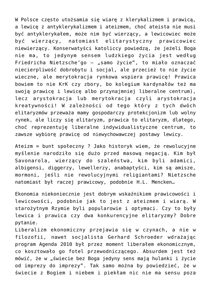 W Polsce często utożsamia się wiarę z klerykalizmem i prawicą, a lewicę z antyklerykalizmem i ateizmem, choć ateista nie musi być antyklerykałem, może nim być wierzący, a lewicowiec może być wierzący, natomiast elitarystyczny prawicowiec niewierzący. Konserwatyści katoliccy powiedzą, że jeżeli Boga nie ma, to jedynym sensem ludzkiego życia jest według Friedricha Nietzsche’go – „samo życie”, to miało oznaczać niecierpliwość dobrobytu i socjal, ale przecież to nie życie wieczne, ale merytokracja rynkowa wspiera prawicę! Prawica bowiem to nie KrK czy zbory, bo kolegium kardynałów też ma swoją prawicę i lewicę albo przynajmniej liberalne centrum), lecz arystokracja lub merytokracja czyli arystokracja kreatywności! W zależności od tego który z tych dwóch elitaryzmów przeważa mamy gospodarczy protekcjonizm lub wolny rynek, ale liczy się elitaryzm, prawica to elitaryzm, dlatego, choć reprezentuję liberalne indywidualistyczne centrum, to zawsze wybiorę prawicę od niewychowawczej postawy lewicy. Ateizm = bunt społeczny ? Jako historyk wiem, że rewolucyjne myślenie narodziło się dużo przed masową negacją. Kim był Savonarola, wierzący do szaleństwa, kim byli adamici, albigensi, diggerzy, lewellerzy, anabaptyści, kim są amisze, mormoni, jeśli nie rewolucyjnymi religiantami? Nietzsche natomiast był raczej prawicowy, podobnie H.L. Mencken… Ekonomia niekoniecznie jest dobrym wskaźnikiem prawicowości i lewicowości, podobnie jak to jest z ateizmem i wiarą. W starożytnym Rzymie byli popularowie i optymaci. Czy to były lewica i prawica czy dwa konkurencyjne elitaryzmy? Dobre pytanie. Liberalizm ekonomiczny przejawia się w czynach, a nie w filozofii, nawet socjalista Gerhard Schroeder wdrażając program Agenda 2010 był przez moment liberałem ekonomicznym, co kosztowało go fotel przewodniczącego. Absurdem jest też mówić, że w „świecie bez Boga jedyny sens mają hulanki i życie od imprezy do imprezy”. Tak samo można by powiedzieć, że w świecie z Bogiem i niebem i piekłam nic nie ma sensu poza samobiczowaniem się, życiem pustelnika i umartwianiem, bo to inwestycja w niebo. Postawa konserwatywno-prawicowa jest i była normą także w innych cywilizacjach i kulturach niż Zachodnia, choćby w starożytnym Rzymie z jego wielobóstwem i w ateistycznopanteistycznych Chinach. Konfucjusz to najczystsza prawica; hierarchia, porządek, dyscyplina, dlatego Chiny były taką inspiracją (ciekawie pisze o tym Paul Hazard) dla oświecenia prawego skrzydła (Voltaire) i dla fizjokratów. Konfucjanizm zaleca zawsze respektować zwyczaje i obyczaje społeczne, jest to najczystszy konserwatywny konformizm, który ładnie podsumował Anatole France: „…Porządnymi ludźmi nazywa się zazwyczaj tych ludzi, którzy postępują tak jak wszyscy inni…”. Nie zapominajmy też, że Nietzsche uważał patrycjuszy rzymskich jak Petroniusz za konserwatystów, podczas gdy chrześcijanie ówcześni byli skrajnym rewolucjonistami. Jeśli Charlesa Maurras i Leo Straussa uwali, ze ład konserwatywny to ład Jahwe, to można to chyba zrzucić na karb ich ograniczeń intelektualnych… Po pierwsze socjalizmu i socjału domagają się np. wierzący związkowcy, po drugie kapitaliści częściej niż przeciętni ludzie są niewierzący, po trzecie święta własność prywatna to koncepcja Locke’a, który był przecież antypapistą, po czwarte to, ze KrK we własnym interesie bronił własności prywatnej (nie zawsze zresztą) nie czyni z niej katolickiej zasady, i po piąte żądanie chleba i igrzysk ma się nijak do przestępstw przeciw własności prywatnej. Z własnością prywatną jest jak z moralnością istnieje bo sprawdziła się w procesie rozwoju historycznego. Komuniści, kanibale i niemoralni przegrywają z tymi co dbają o swoje, rozwijają koncepcję miłości bratniej i pamiętają zasadę Kanta: „postępuj tak, jakbyś chciał by twoje zachowanie stało się obowiązującym prawem”. Nie ma to wiele wspólnego z wiarą czy niewiarą, za to bardzo wiele z obserwacją i praktyką, a te wzmacniają liberalne centrum. http://www.youtube.com/watch?v=fIl9z8Wa_no Pozdrawiam z Poznania