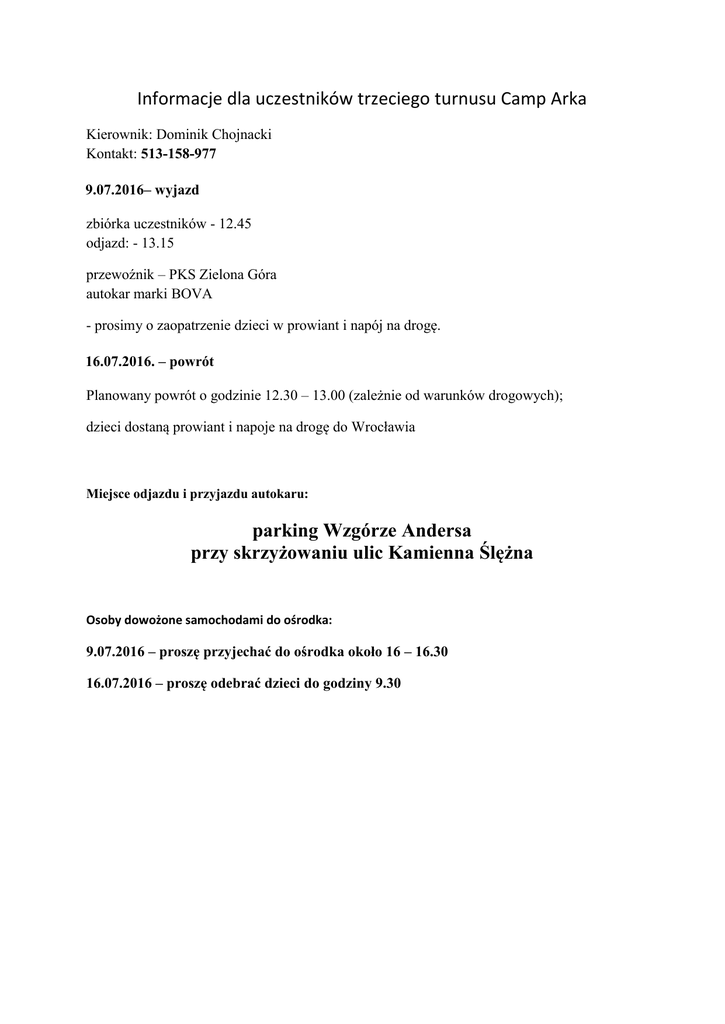 Informacje dla uczestników trzeciego turnusu Camp Arka Kierownik: Dominik Chojnacki Kontakt: 513-158-977 9.07.2016– wyjazd zbiórka uczestników - 12.45 odjazd: - 13.15 przewoźnik – PKS Zielona Góra autokar marki BOVA - prosimy o zaopatrzenie dzieci w prowiant i napój na drogę. 16.07.2016. – powrót Planowany powrót o godzinie 12.30 – 13.00 (zależnie od warunków drogowych); dzieci dostaną prowiant i napoje na drogę do Wrocławia Miejsce odjazdu i przyjazdu autokaru: parking Wzgórze Andersa przy skrzyżowaniu ulic Kamienna Ślężna Osoby dowożone samochodami do ośrodka: 9.07.2016 – proszę przyjechać do ośrodka około 16 – 16.30 16.07.2016 – proszę odebrać dzieci do godziny 9.30
