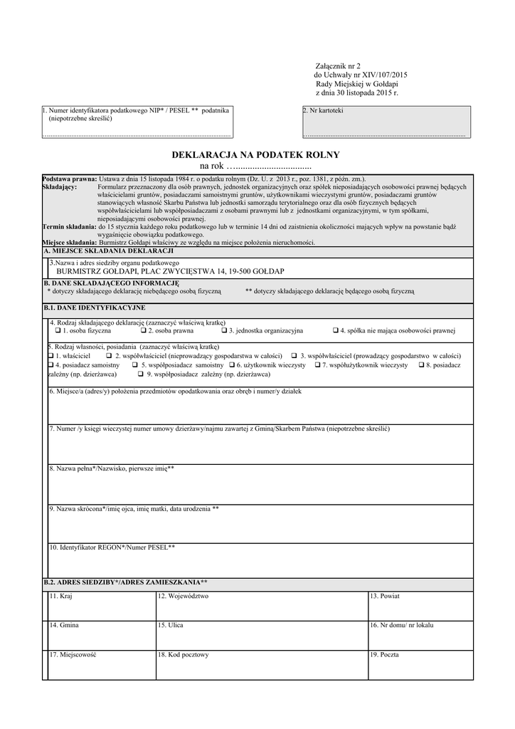 Załącznik nr 2 do Uchwały nr XIV/107/2015 Rady Miejskiej w Gołdapi z dnia 30 listopada 2015 r.30 listopada 012 r. 1. Numer identyfikatora podatkowego NIP* / PESEL ** podatnika (niepotrzebne skreślić) 2. Nr kartoteki …......................................................................................................... ….......................................................................................... DEKLARACJA NA PODATEK ROLNY na rok …................................ Podstawa prawna: Ustawa z dnia 15 listopada 1984 r. o podatku rolnym (Dz. U. z 2013 r., poz. 1381, z późn. zm.). Składający: Formularz przeznaczony dla osób prawnych, jednostek organizacyjnych oraz spółek nieposiadających osobowości prawnej będących właścicielami gruntów, posiadaczami samoistnymi gruntów, użytkownikami wieczystymi gruntów, posiadaczami gruntów stanowiących własność Skarbu Państwa lub jednostki samorządu terytorialnego oraz dla osób fizycznych będących współwłaścicielami lub współposiadaczami z osobami prawnymi lub z jednostkami organizacyjnymi, w tym spółkami, nieposiadającymi osobowości prawnej. Termin składania: do 15 stycznia każdego roku podatkowego lub w terminie 14 dni od zaistnienia okoliczności mających wpływ na powstanie bądź wygaśnięcie obowiązku podatkowego. Miejsce składania: Burmistrz Gołdapi właściwy ze względu na miejsce położenia nieruchomości. A. MIEJSCE SKŁADANIA DEKLARACJI 3.Nazwa i adres siedziby organu podatkowego BURMISTRZ GOŁDAPI, PLAC ZWYCIĘSTWA 14, 19-500 GOŁDAP B. DANE SKŁADAJĄCEGO INFORMACJĘ * dotyczy składającego deklarację niebędącego osobą fizyczną ** dotyczy składającego deklarację będącego osobą fizyczną B.1. DANE IDENTYFIKACYJNE 4. Rodzaj składającego deklarację (zaznaczyć właściwą kratkę) q 1. osoba fizyczna q 2. osoba prawna q 3. jednostka organizacyjna q 4. spółka nie mająca osobowości prawnej 5. Rodzaj własności, posiadania (zaznaczyć właściwą kratkę) q 1. właściciel q 2. współwłaściciel (nieprowadzący gospodarstwa w całości) q 3. współwłaściciel (prowadzący gospodarstwo w całości) q 4. posiadacz samoistny q 5. współposiadacz samoistny q 6. użytkownik wieczysty q 7. współużytkownik wieczysty q 8. posiadacz zależny (np. dzierżawca) q 9. współposiadacz zależny (np. dzierżawca) 6. Miejsce/a (adres/y) położenia przedmiotów opodatkowania oraz obręb i numer/y działek Zgodnie z zał. Nr 1 7. Numer /y księgi wieczystej numer umowy dzierżawy/najmu zawartej z Gminą/Skarbem Państwa (niepotrzebne skreślić) 8. Nazwa pełna*/Nazwisko, pierwsze imię** 9. Nazwa skrócona*/imię ojca, imię matki, data urodzenia ** 10. Identyfikator REGON*/Numer PESEL** B.2. ADRES SIEDZIBY*/ADRES ZAMIESZKANIA** 11. Kraj 12. Województwo 13. Powiat 14. Gmina 15. Ulica 16. Nr domu/ nr lokalu 17. Miejscowość 18. Kod pocztowy 19. Poczta B.3. ADRES KORESPONDENCYJNY*/** 20. Kraj 21. Województwo 22. Powiat 23. Gmina 24. Ulica 25. Nr domu/ nr lokalu 26. Miejscowość 27. Kod pocztowy 28. Poczta C. OKOLICZNOŚCI POWODUJĄCE KONIECZNOŚĆ ZŁOŻENIA DEKLARACJI 29. Okoliczności (zaznaczyć właściwą kratkę) q 1. deklaracja roczna od miesiąca.................................rok............ q 2. korekta deklaracji rocznej od miesiąca.............................. rok............ D. DANE DOTYCZĄCE PRZEDMIOTÓW OPODATKOWANIA (z wyjątkiem zwolnionych) Powierzchnia gruntu w hektarach fizycznych Wymiar podatku rolnego w zł i gr 30. 31. 32. Grunty zadrzewione i Grunty rolne zakrzewione Ogółem zabudowane na użytkach rolnych 33. 34. 35. 39. 40. 41. 42. 43. 44. 45. 46. 47. 49. 50. 51. 52. 53. 54. Klasy użytków Grunty orne Łąki i pastwiska Sady Podlegająca opodatkowani u Liczba ha przelicz. 36. 37. 38. I II 48. III 55. 56. 57. 58. 59. 60. 61. 62. 63. 64. 65. 66. 67. 68. 69. 70. 72. 73. 74. 75. 76. 77. IIIa IIIb 71. IV 78. 79. 80. 81. 82. 83. 84. 85. 86. 87. 88. 89. 90. 91. 92. 93. IVa IVb 94. 95. 96. 97. 98. 99. 100. 101. 102. 103. 104. 105. 106. 107. 108. 109. 110. 111. 112. 113. 114. 115. V VI Rowy Grunty pod stawami a) zarybione łososiem, trocią, głowacicą, palią i pstrągiem 116. b) zarybione innymi gatunkami ryb i niezarybione 117. Razem (kwota podatku w pełnych złotych) 118. E. INNE ZWOLNIENIA I ULGI W PODATKU ROLNYM OD GRUNTÓW I BUDYNKÓW (podać powierzchnię, numer działki, obręb oraz przepis prawa – z jakiego występuje zwolnienie) 119. F. PODPIS SKŁADAJĄCEGO LUB OSOBY UPOWAŻNIONEJ* DO SKŁADANIA DEKLARACJI (* Należy dołączyć pełnomocnictwo lub inny dokument z którego wynika umocowanie do podpisywania deklaracji) 120. Imię 121. Nazwisko 122. Data wypełnienia (dzień - miesiąc - rok) 123. Podpis (pieczęć) osoby uprawnionej/ upoważnionej do złożenia deklaracji G. DANE KONTAKTOWE PODATNIKA nr telefonu, adres e-mail (dobrowolnie) 124. Pouczenie: 1. Obliczony w deklaracji podatek rolny należy wpłacić bez wezwania na rachunek bankowy, w kasie Urzędu Miejskiego lub w placówce pocztowej w ratach proporcjonalnych do czasu trwania obowiązku podatkowego, w terminach do: 15 marca, 15 maja, 15 września i 15 listopada roku podatkowego. 2. W przypadku, gdy kwota podatku nie przekracza 100 zł podatek jest płatny jednorazowo w terminie płatności pierwszej raty. 3. W przypadku nie wpłacenia w obowiązujących terminach i ratach kwoty podatku z poz. 118 lub wpłacenia jej w niepełnej wysokości, niniejsza deklaracja stanowi podstawę do wystawienia tytułu wykonawczego, zgodnie z przepisami ustawy z dnia 17 czerwca 1966 r. o postępowaniu egzekucyjnym w administracji (Dz. U. 2014 r. poz. 1619 ze zm.). H. ADNOTACJE ORGANU PODATKOWEGO 125. Uwagi organu podatkowego 126. Identyfikator przyjmującego formularz 127. Podpis przyjmującego formularz