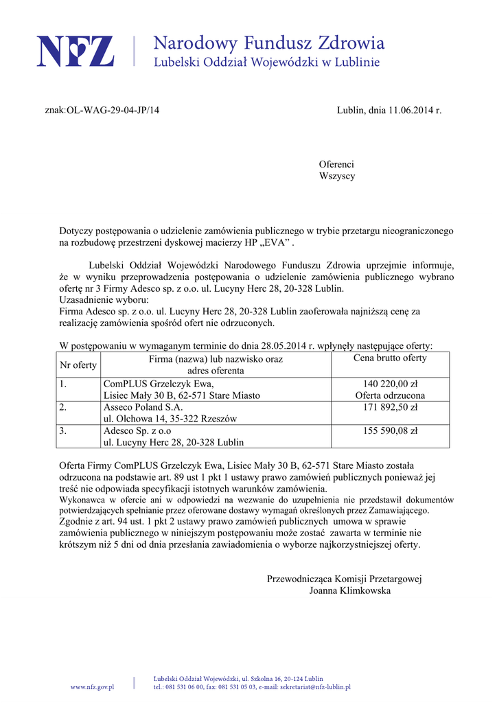 znak:OL-WAG-29-04-JP/14 Lublin, dnia 11.06.2014 r. Oferenci Wszyscy Dotyczy postępowania o udzielenie zamówienia publicznego w trybie przetargu nieograniczonego na rozbudowę przestrzeni dyskowej macierzy HP „EVA” . Lubelski Oddział Wojewódzki Narodowego Funduszu Zdrowia uprzejmie informuje, że w wyniku przeprowadzenia postępowania o udzielenie zamówienia publicznego wybrano ofertę nr 3 Firmy Adesco sp. z o.o. ul. Lucyny Herc 28, 20-328 Lublin. Uzasadnienie wyboru: Firma Adesco sp. z o.o. ul. Lucyny Herc 28, 20-328 Lublin zaoferowała najniższą cenę za realizację zamówienia spośród ofert nie odrzuconych. W postępowaniu w wymaganym terminie do dnia 28.05.2014 r. wpłynęły następujące oferty: Cena brutto oferty Firma (nazwa) lub nazwisko oraz Nr oferty adres oferenta 1. ComPLUS Grzelczyk Ewa, 140 220,00 zł Lisiec Mały 30 B, 62-571 Stare Miasto Oferta odrzucona 2. Asseco Poland S.A. 171 892,50 zł ul. Olchowa 14, 35-322 Rzeszów 3. Adesco Sp. z o.o 155 590,08 zł ul. Lucyny Herc 28, 20-328 Lublin Oferta Firmy ComPLUS Grzelczyk Ewa, Lisiec Mały 30 B, 62-571 Stare Miasto została odrzucona na podstawie art. 89 ust 1 pkt 1 ustawy prawo zamówień publicznych ponieważ jej treść nie odpowiada specyfikacji istotnych warunków zamówienia. Wykonawca w ofercie ani w odpowiedzi na wezwanie do uzupełnienia nie przedstawił dokumentów potwierdzających spełnianie przez oferowane dostawy wymagań określonych przez Zamawiającego. Zgodnie z art. 94 ust. 1 pkt 2 ustawy prawo zamówień publicznych umowa w sprawie zamówienia publicznego w niniejszym postępowaniu może zostać zawarta w terminie nie krótszym niż 5 dni od dnia przesłania zawiadomienia o wyborze najkorzystniejszej oferty. Przewodnicząca Komisji Przetargowej Joanna Klimkowska