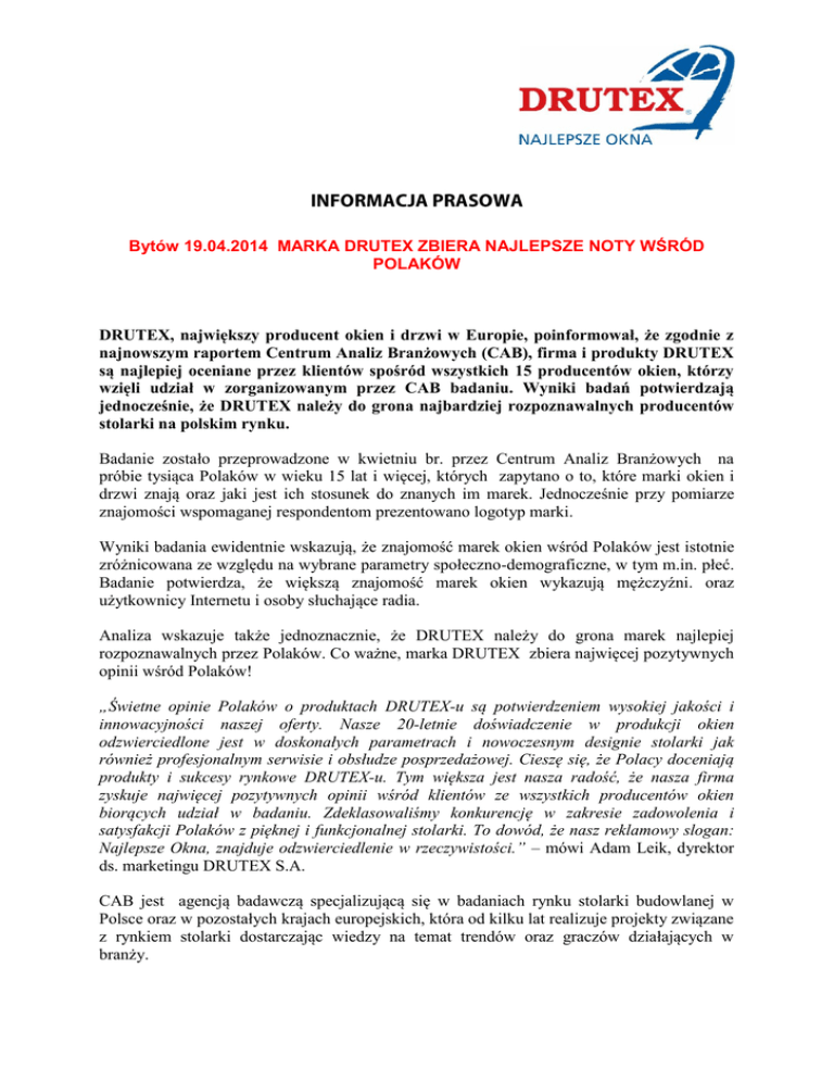 Bytów 19.04.2014 MARKA DRUTEX ZBIERA NAJLEPSZE NOTY WŚRÓD POLAKÓW DRUTEX, największy producent okien i drzwi w Europie, poinformował, że zgodnie z najnowszym raportem Centrum Analiz Branżowych (CAB), firma i produkty DRUTEX są najlepiej oceniane przez klientów spośród wszystkich 15 producentów okien, którzy wzięli udział w zorganizowanym przez CAB badaniu. Wyniki badań potwierdzają jednocześnie, że DRUTEX należy do grona najbardziej rozpoznawalnych producentów stolarki na polskim rynku. Badanie zostało przeprowadzone w kwietniu br. przez Centrum Analiz Branżowych na próbie tysiąca Polaków w wieku 15 lat i więcej, których zapytano o to, które marki okien i drzwi znają oraz jaki jest ich stosunek do znanych im marek. Jednocześnie przy pomiarze znajomości wspomaganej respondentom prezentowano logotyp marki. Wyniki badania ewidentnie wskazują, że znajomość marek okien wśród Polaków jest istotnie zróżnicowana ze względu na wybrane parametry społeczno-demograficzne, w tym m.in. płeć. Badanie potwierdza, że większą znajomość marek okien wykazują mężczyźni. oraz użytkownicy Internetu i osoby słuchające radia. Analiza wskazuje także jednoznacznie, że DRUTEX należy do grona marek najlepiej rozpoznawalnych przez Polaków. Co ważne, marka DRUTEX zbiera najwięcej pozytywnych opinii wśród Polaków! „Świetne opinie Polaków o produktach DRUTEX-u są potwierdzeniem wysokiej jakości i innowacyjności naszej oferty. Nasze 20-letnie doświadczenie w produkcji okien odzwierciedlone jest w doskonałych parametrach i nowoczesnym designie stolarki jak również profesjonalnym serwisie i obsłudze posprzedażowej. Cieszę się, że Polacy doceniają produkty i sukcesy rynkowe DRUTEX-u. Tym większa jest nasza radość, że nasza firma zyskuje najwięcej pozytywnych opinii wśród klientów ze wszystkich producentów okien biorących udział w badaniu. Zdeklasowaliśmy konkurencję w zakresie zadowolenia i satysfakcji Polaków z pięknej i funkcjonalnej stolarki. To dowód, że nasz reklamowy slogan: Najlepsze Okna, znajduje odzwierciedlenie w rzeczywistości.” – mówi Adam Leik, dyrektor ds. marketingu DRUTEX S.A. CAB jest agencją badawczą specjalizującą się w badaniach rynku stolarki budowlanej w Polsce oraz w pozostałych krajach europejskich, która od kilku lat realizuje projekty związane z rynkiem stolarki dostarczając wiedzy na temat trendów oraz graczów działających w branży. Więcej informacji: PremiumMedia Kamila Newlin-Łukowicz [email protected] DRUTEX S.A. Adam Leik Dyrektor ds. Marketingu [email protected] INFORMACJE DLA MEDIÓW DRUTEX S.A. jest największym producentem stolarki okienno - drzwiowej w Europie. Spółka rozpoczęła działalność w 1985 roku i obecnie sprzedaje swoje produkty w większości krajów europejskich, USA, Kanadzie, Meksyku, Australii i na Bliskim Wschodzie. W swojej ofercie, oprócz produktów z PVC, DRUTEX posiada, również okna, drzwi i fasady z aluminium i drewna, jak również rolety. Firma, jako jedna z niewielu w branży, jest również producentem szyb zespolonych oraz wytwarza własne profile PVC - GL System. Obecnie potencjał przedsiębiorstwa pozwala na produkcję 5000 okien na dobę, co czyni firmę niekwestionowanym liderem w branży stolarki w Europie. Jednocześnie produkty firmy charakteryzują się zaawansowaniem technologicznym i innowacyjnością, dzięki czemu wyznaczają standardy na międzynarodowym rynku stolarki i odpowiadają wymaganiom klientów. Spółka jest firmą nowoczesną, stosującą w procesie produkcyjnym najnowsze rozwiązania technologiczne dopasowane do oczekiwań Klientów. Produkty znajdują uznanie w oczach nabywców, dzięki doskonałym rezultatom w zakresie energooszczędności jak również nowoczesnemu designowi i ponadprzeciętnej funkcjonalności, co jest odzwierciedlone w licznych nagrodach i wyróżnieniach, takich jak: Złoty Laur Klienta, Ambasador Polskiej Gospodarki, Filar Polskiej Gospodarki, Lider Polskiego Biznesu, Solidna Firma, Top Builder, Diament Forbesa, Medal Europejski, Gazele Biznesu, EU Standard, Kryształowy Profil, Dobra Firma, Zielona Marka i wiele innych. Celem firmy jest tworzenie najnowocześniejszych produktów, inwestycje w innowacyjne rozwiązania i budowanie dynamicznej sieci sprzedaży gwarantującej optymalizację podaży i procesów zaopatrzenia wciąż powiększającej się bazy Klientów. Siedziba firmy znajduje się w Bytowie, w woj. pomorskim. Tam też znajduje się centrum logistyczne Spółki dysponujące flotą ponad 180 nowoczesnych pojazdów, dzięki czemu, w połączeniu ze sprawnością działania, firma zapewnia najkrótsze na rynku terminy realizacji zamówień (do 7 dni w całej Europie), co zdecydowanie wyróżnia firmę na rynku. W 2013 roku firma osiągnęła przychód na poziomie 480 mln zł, a sprzedaż zagraniczna firmy sięgnęła ok. 70%. Firma jest jednym z największych pracodawców w województwie i zatrudnia ponad 1840 osób. Dynamiczny wzrost przychodów i zatrudnienia jest wynikiem rosnącego popytu na produkty firmy. Obecnie DRUTEX realizuje jedną z najważniejszych inwestycji w historii firmy, związaną z budową Europejskiego Centrum Stolarki, wartą w sumie ok. 200 mln zł.. Pierwszy etap inwestycji firma planuje oddać w II kwartale 2014 roku, co pozwoli firmie na podwojenie mocy produkcyjnych. DRUTEX S.A. jest również firmą społecznie odpowiedzialną, a polityka społecznej odpowiedzialności biznesu jest wpisana w strategię działania firmy. Spółka angażuje się w akcje mające na celu wspieranie potrzebujących. DRUTEX wspiera m.in. Fundację Kiwanis, pomagając dzieciom chorym, znajdującym się w trudnej sytuacji materialnej i życiowej. Firma pomogła również podopiecznym Fundacji „Równe Szanse” Dariusza Michalczewskiego. Poza tym angażuje się w lokalne inicjatywy. Dzięki temu dziś, DRUTEX postrzegany jest jako firma rzetelna, uczciwa i otwarta na po