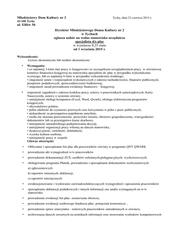 Młodzieżowy Dom Kultury nr 2 Tychy, dnia 23 czerwca 2015 r. 43-100 Tychy ul. Elfów 56 Dyrektor Młodzieżowego Domu Kultury nr 2 w Tychach ogłasza nabór na wolne stanowisko urzędnicze specjalista d/s płac w wymiarze 0,25 etatu od 1 września 2015 r. Wykształcenie: wyższe ekonomiczne lub średnie ekonomiczne • Wymagania: • co najmniej 3-letni staż pracy w księgowości ze szczególnym uwzględnieniem pracy w oświatowej komórce finansowo-księgowej na stanowisku specjalista ds. płac w przypadku wykształcenia wyższego, lub co najmniej 6-letni w przypadku wykształcenia średniego, • znajomość ustaw i rozporządzeń wykonawczych z zakresu rachunkowości, finansów publicznych, przepisów podatkowych, sprawozdawczości budżetowej, • znajomość zasad prowadzenia ewidencji finansowo – księgowej, • znajomość zagadnień z zakresu kodeksu pracy, ustawy o pracownikach samorządowych, Karty Nauczyciela, ustawy o systemie oświaty. • umiejętność obsługi komputera (Excel, Word, Qwark), obsługa elektroniczna programów księgowych, • obywatelstwo polskie, • pełna zdolność do czynności prawnych oraz korzystania w pełni z praw publicznych, • niekaralność za przestępstwa popełnione umyślnie, • osoba nie skazana prawomocnie: przeciwko mieniu, obrotowi gospodarczemu, wiarygodności dokumentów lub za przestępstwo karne skarbowe, • umiejętność samodzielnego podejmowania decyzji, • umiejętność organizacji pracy własnej na danym stanowisku, • dyspozycyjność, rzetelność, dokładność, • wysoka kultura osobista, • umiejętność pracy w zespole. Główne obowiązki: • Obliczanie i sporządzanie list płac dla pracowników oświaty w programie QNT QWARK • prowadzenie akt wynagrodzeń w/w pracowników • prowadzenie dokumentacji ZUS, zasiłków rodzinnych,pielęgnacyjnych, wychowawczych. • obsługiwanie programu Płatnik, prowadzenie i sporządzanie dokumentów rozliczeniowych: a) zgłoszeniowych b) raportów imiennych, deklaracji, c) raportów miesięcznych • ewidencjonowanie i wydawanie zaświadczeńdotyczących wynagrodzeń i uposażenia pracowników • sporządzanie deklaracji podatkowych i innych informacji oaz analiz wymaganych na w/w stanowisku • prowadzenie ewidencji list płac- zestawienia zbiorcze, • prowadzenie ewidencji osobowego funduszu płac- potrącenia komornicze , • prowadzenie spraw emerytalno - rentowych pracowników zatrudnionych w oświacie • archiwizacja danych zawartych na nośnikach informacji oraz stosowanie wydruków komputerowych • zastępstwo głównego księgowegow czasie nieobecności. • obsługa komputera i programów kadrowo-płacowych,(Płace Qwark, Płatnik ZUS, QDeklaracje) Wymagane dokumenty: • kopie dokumentów potwierdzających wykształcenie • kopie dokumentów potwierdzających dodatkowe kwalifikacje • kopie świadectw pracy • oświadczenie o korzystaniu z pełni praw publicznych • oświadczenie o niekaralności za przestępstwa popełnione umyślnie • oświadczenie o nieprowadzeniu działalności gospodarczej • oświadczenie o wyrażeniu zgody na przetwarzanie danych osobowych do celów rekrutacji i zatrudnienia • CV • List motywacyjny Informacje: 1. Wymagane dokumenty aplikacyjne należy złożyć osobiście w terminie do 3.07.2015 w sekretariacie Młodzieżowego Domu Kultury nr 2 w Tychach ul. Elfów 56 w godzinach od 8.30 do 15.30 w zaklejonej kopercie z napisem: „Konkurs na stanowisko Specjalista d/s płac”. 2. Osoby, które spełnią wymogi formalno - prawne podane w ogłoszeniu o naborze zostaną zakwalifikowane do dalszego etapu postępowania. 3. Postępowanie rekrutacyjne przeprowadzi Komisja Rekrutacyjna. 4. Lista osób zakwalifikowanych do dalszego etapu zostanie umieszczona na stronie Biuletynu Informacji Publicznej MDK nr 2 w Tychach. 5. O terminie i miejscu postępowania kandydaci zostaną powiadomieni indywidualnie. 6. Przy naborze przewiduje się rozmowę kwalifikacyjną z kandydatem. 7. Oferty, które nie spełniają wymagań formalno-prawnych, zostaną komisyjnie zniszczone. 8. Dodatkowych informacje można uzyskać pod numerem telefonu 32/227-31-10. 9. Dokumenty, które wpłyną po terminie nie będą rozpatrywane. 10. Wynik konkursu ukaże się na stronie internetowej Biuletynu Informacji Publicznej MDK nr 2 w Tychach. Informacje o warunkach zatrudnienia: • miejsce wykonywanej pracy znajduje się ul. Elfów 56, na półpiętrze w budynku MDK nr 2 w Tychach • wejście do budynku ogranicza jeden stopień, • toalety znajdują sie na półpiętrze , schody nie posiadają możliwości wjazdu wózka inwalidzkiego, • stanowisko pracy wyposażone w biurko o wymiarach standardowych. UWAGA! Treść oświadczenia o przetwarzaniu danych osobowych: „Wyrażam zgodę na przetwarzanie moich danych osobowych zawartych w ofercie pracy dla potrzeb niezbędnych do realizacji procesu rekrutacji ( zgodnie z Ustawą z dnia 29.08.1997r. o ochronie danych osobowych - Dz. U. z 2002r. nr 101, poz.926 z późn. zm. oraz Ustawą z dnia 21 listopada 2008 r. o pracownikach samorządowych - Dz.U. z 2008r. nr 223, poz. 1458 z późn. zm.)”