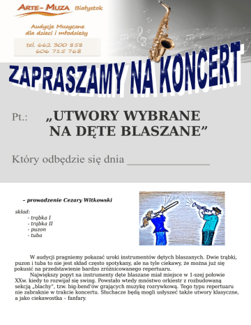 Pt.: „UTWORY WYBRANE NA DĘTE BLASZANE” Który odbędzie się dnia ______________ – prowadzenie Cezary Witkowski skład: - trąbka I - trąbka II - puzon - tuba W audycji pragniemy pokazać uroki instrumentów dętych blaszanych. Dwie trąbki, puzon i tuba to nie jest skład często spotykany, ale na tyle ciekawy, że można już się pokusić na przedstawienie bardzo zróżnicowanego repertuaru. Największy popyt na instrumenty dęte blaszane miał miejsce w 1-szej połowie XXw. kiedy to rozwijał się swing. Powstało wtedy mnóstwo orkiestr z rozbudowaną sekcją „blachy”, tzw. big-bend'ów grających muzykę rozrywkową. Tego typu repertuaru nie zabraknie w trakcie koncertu. Słuchacze będą mogli usłyszeć także utwory klasyczne, a jako ciekawostka – fanfary.