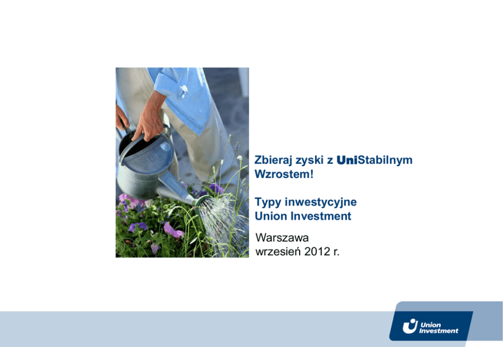 Zbieraj zyski z UniStabilnym Wzrostem! Typy inwestycyjne Union Investment Warszawa wrzesień 2012 r. wrzesień 2012 Co ma potencjał zysku? Sztandarowy subfundusz dla klientów banków spółdzielczych: UniStabilny Wzrost Długoterminowa inwestycja (powyżej 5 lat) Bardzo duży potencjał wzrostu/możliwa duża zmienność wartości inwestycji Średnioterminowa inwestycja Duży potencjał wzrostu/umiarkowane (min 2-3 lata) wahania wartości Zachowanie realnej wartości Potencjał wzrostu/mała zmienność inwestycji w średnim terminie wartości inwestycji Ryzyko inwestycyjne: minimalne niskie umiarkowane wysokie bardzo wysokie UniKorona Akcje UniStabilny Wzrost UniLokata 2 wrzesień 2012 3 UniKorona Akcje – dobre perspektywy dla akcji w długim horyzoncie Szanse ● Gospodarka Stanów Zjednoczonych zachowuje się umiarkowanie stabilnie, czego potwierdzeniem mogą być odczyty makroekonomiczne, które na ogół mieszczą się w prognozach analityków. ● Mimo negatywnych nastrojów wyniki spółek notowanych na polskiej giełdzie nie zaskakują negatywnie i są zgodne z oczekiwaniami analityków. ● Widzimy obecnie bardzo słabe odczyty ekonomiczne w gospodarkach europejskich, które mogą zbliżać się do swych cyklicznych minimów. ● Biorąc pod uwagę powyższe fakty bieżący moment może być okazją do długoterminowej inwestycji w akcje. ● W dłuższym terminie wg stopy zwrotu subfundusz UniKorona Akcje zawsze jest w czołówce klasyfikacji funduszy akcyjnych, w większości mieszcząc się na podium ● UniKorona Akcje został uznany przez Puls Biznesu za drugi najlepszy fundusz akcji polskich w 2011 roku UniKorona Akcje 125 120 115 110 105 100 95 90 85 80 31 sie 10 28 lut 11 31 sie 11 29 lut 12 31 sie 12 Ryzyko inwestycyjne: minimalne niskie umiarkowane wysokie bardzo wysokie wrzesień 2012 4 UniStabilny Wzrost – bezpieczna inwestycja w przyszłość na rynku akcji Szanse ● Stabilny poziom wskaźników w Stanach Zjednoczonych i niskie poziomy indeksów giełdowych w Polsce mogą być dobrą okazją na inwestycję z udziałem akcji. ● Mimo słabych danych makroekonomicznych wyniki finansowe spółki na ogół mieszczą się w oczekiwaniach analityków. UniStabilny Wzrost 110 108 106 104 ● Sytuacja fiskalna Polski poprawia się, rośnie cena obligacji 102 skarbowych, które mają potencjał ograniczania wpływu ryzyka akcji na wyniki subfunduszu. 100 ● Publikacja słabych danych o gospodarce polskiej nie powoduje panicznego pozbywania się akcji, co może świadczyć o oczekiwaniach inwestorów co do przyszłej poprawy sytuacji makroekonomicznej. ● Subfundusz UniStabilny Wzrost w trudnym okresie na rynku kapitałowym w horyzoncie 2 lat osiągnął zwrot 8,87%, natomiast przez ostatnie 3 lata zarobił 23,87%, co czyni go najlepszym funduszem stabilnego wzrostu we wskazanych okresach. 98 96 31 sie 10 31 gru 10 30 kwi 11 31 sie 11 Ryzyko inwestycyjne: minimalne niskie umiarkowane 31 gru 11 30 kwi 12 wysokie bardzo wysokie 31 sie 12 wrzesień 2012 UniLokata – zysk jak na lokacie z możliwością wycofania się z inwestycji bez utraty odsetek Szanse ● W czasach dużej zmienności na rynkach finansowych UniLokata 103,5 subfundusz UniLokata jest rozwiązaniem inwestycyjnym o 103 minimalnych wahaniach ceny jednostki, wykorzystującym 102,5 stabilność cen obligacji o zmiennych kuponach opartych o 102 stawki oprocentowania lokat na rynku międzybankowym. ● Okres inwestycji zależy od potrzeb Klienta - brak deklaracji 101,5 101 terminu wypłaty środków (możliwość wpłat środków w 100,5 dowolnym momencie). ● Możliwość każdorazowego wycofania się z inwestycji bez utraty dotychczas wypracowanych zysków. ● Konstrukcja portfela ma umożliwić potencjał wyższych 100 99,5 lut 12 kwi 12 cze 12 sie 12 zysków niż lokata bankowa przy jednoczesnej niskiej minimalnej wpłacie. ● Problemy niektórych branż i sektorów oddziałują na sytuację całego rynku. Może to powodować, że spółki o dobrej kondycji finansowej, w które obecnie inwestuje subfundusz UniLokata oferują wysokie odsetki swoich obligacji (premia). Dzięki temu rośnie stopa zwrotu całego subfunduszu. Ryzyko inwestycyjne: minimalne niskie umiarkowane wysokie bardzo wysokie 5 wrzesień 2012 Chcesz wiedzieć więcej? Dzwoń 801 144 144 lub (22) 449 03 33, czytaj www.unionklub.pl Metodologia typów inwestycyjnych Union Investment TFI: ● Typy inwestycyjne stanowią proponowane rozwiązanie inwestycyjne w danej sytuacji rynkowej, biorą pod uwagę potencjał i sentyment rynku. ● Prognoza sytuacji rynkowej obejmuje horyzont 12-miesięczny (o ile rekomendacja nie stwierdza inaczej). ● Typy inwestycyjne uwzględniają analizę historycznych wyników subfunduszy, oraz oczekiwania ich kształtowania się w przyszłości. ● Typy inwestycyjne są opracowywane przez zarządzających subfunduszami oraz analityków rynkowych Union Investment TFI S.A. 6 wrzesień 2012 Przedstawiane informacje finansowe dotyczą wskazanego okresu i nie gwarantują podobnych wyników w przyszłości. Brak gwarancji osiągnięcia celów inwestycyjnych subfunduszy; możliwość zmniejszenia wartości zainwestowanych środków. Duża zmienność wartości aktywów netto: UniAkcje Małych i Średnich Spółek, UniAkcje Sektory Wzrostu, UniAkcje: Nowa Europa, UniKorona Akcje, UniKorona Zrównoważony, UniStabilny Wzrost, UniObligacje: Nowa Europa w UniFundusze FIO oraz UniTotal Trend i UniObligacje Aktywny w UniFundusze SFIO. Możliwe lokaty ponad 35% wartości aktywów UniKorona Pieniężny, UniKorona Obligacje, UniBezpieczna Alokacja, UniStabilny Wzrost, UniKorona Zrównoważony, UniLokata w papiery wartościowe emitowane, poręczane lub gwarantowane przez Skarb Państwa albo Narodowy Bank Polski, a w przypadku UniDolar Pieniężny oraz UniObligacje: Nowa Europa także w papiery wartościowe emitowane, poręczane lub gwarantowane przez: Australię, Austrię, Belgię, Bułgarię, Czechy, Cypr, Danię, Estonię, 