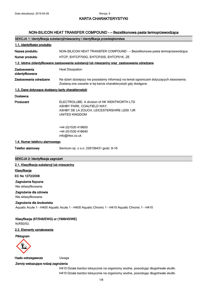 Data aktualizacji: 2015-04-29 Wersja: 9 KARTA CHARAKTERYSTYKI NON-SILICON HEAT TRANSFER COMPOUND - – Bezsilikonowa pasta termoprzewodząca SEKCJA 1: Identyfikacja substancji/mieszaniny i identyfikacja przedsiębiorstwa 1.1. Identyfikator produktu Nazwa produktu NON-SILICON HEAT TRANSFER COMPOUND - – Bezsilikonowa pasta termoprzewodząca Numer produktu HTCP, EHTCP700G, EHTCP20S, EHTCP01K, ZE 1.2. Istotne zidentyfikowane zastosowania substancji lub mieszaniny oraz zastosowania odradzane Zastosowania zidentyfikowane Heat Dissipation Zastosowania odradzane Na dzień dzisiejszy nie posiadamy informacji na temat ograniczeń dotyczących stosowania. Zostaną one zawarte w tej karcie charakterystyki gdy dostępne. 1.3. Dane dotyczące dostawcy karty charakterystyki Dostawca Producent ELECTROLUBE. A division of HK WENTWORTH LTD ASHBY PARK, COALFIELD WAY, ASHBY DE LA ZOUCH, LEICESTERSHIRE LE65 1JR UNITED KINGDOM +44 (0)1530 419600 +44 (0)1530 416640 [email protected] 1.4. Numer telefonu alarmowego Telefon alarmowy Semicon sp. z o.o. 226156431 godz: 8-16 SEKCJA 2: Identyfikacja zagrożeń 2.1. Klasyfikacja substancji lub mieszaniny Klasyfikacja EC No 1272/2008 Zagrożenia fizyczne Nie sklasyfikowane. Zagrożenia dla zdrowia Nie sklasyfikowane. Zagrożenia dla środowiska Aquatic Acute 1 - H400 Aquatic Acute 1 - H400 Aquatic Chronic 1 - H410 Aquatic Chronic 1 - H410 Klasyfikacja (67/548/EWG) or (1999/45/WE) N;R50/53. 2.2. Elementy oznakowania Piktogram Hasło ostrzegawcze Uwaga Zwroty wskazujące rodzaj zagrożenia H410 Działa bardzo toksycznie na organizmy wodne, powodując długotrwałe skutki. H410 Działa bardzo toksycznie na organizmy wodne, powodując długotrwałe skutki. 1/8 Data aktualizacji: 2015-04-29 Wersja: 9 NON-SILICON HEAT TRANSFER COMPOUND - – Bezsilikonowa pasta termoprzewodząca Zwroty wskazujące środki ostrożności P273 Unikać uwolnienia do środowiska. P391 Zebrać wyciek. P501 Zawartość/pojemnik usuwać zgodnie z krajowymi przepisami. 2.3. Inne zagrożenia Substancja ta nie jest sklasyfikowana jako PBT ani vPvB zgodnie z obecnymi kryteriami WE. SEKCJA 3: Skład/informacja o składnikach 3.2. Mieszaniny 60-100% Aluminium Oxide Numer CAS: 1344-28-1 Numer WE: 215-691-6 Klasyfikacja Klasyfikacja (67/548/EWG) or (1999/45/WE) Nie sklasyfikowane. 10-30% ZINC OXIDE Numer CAS: 1314-13-2 Numer WE: 215-222-5 Numer rejestracji REACH: 01-2119463881-32-XXXX Współczynnik M (toksyczność ostra) = 1 Współczynnik M (toksyczność przewlekła) = 1 Klasyfikacja Klasyfikacja (67/548/EWG) or (1999/45/WE) Aquatic Acute 1 - H400 N;R50/53 Aquatic Chronic 1 - H410 Pełny tekst zwrotów wskazujących rodzaj zagrożenia (zwrotów R) i określeń zagrożeń jest przedstawiony w sekcji 16. Uwagi dotyczące składu Brak klasyfikowanych składników lub składników, dla których istnieją normy narażenia zawodowego, występujących w stężeniach powyżej poziomu ujawnienia. SEKCJA 4: Środki pierwszej pomocy 4.1. Opis środków pierwszej pomocy Informacje ogólne Zasięgnąć porady medycznej jeśli dyskomfort się utrzymuje. Wdychanie Nie dotyczy. Połknięcie Dokładnie wypłukać usta wodą. Podać duże ilości wody do picia. Zasięgnąć pomocy medycznej. Kontakt ze skórą Umyć dokładnie skórę wodą z mydłem. Zasięgnąć porady medycznej jeśli podrażnienia utrzymują się po umyciu. Kontakt z oczami Usunąć szkła kontaktowe i otworzyć szeroko powieki. Spłukać wodą. Kontynuować płukanie przez co najmniej 15 minut. Zasięgnąć porady medycznej jeśli dyskomfort się utrzymuje. 4.2. Najważniejsze ostre i opóźnione objawy oraz skutki narażenia Kontakt ze skórą Długotrwały lub powtarzany kontakt ze skórą może powodować podrażnienie, zaczerwienienie i stan zapalny. 4.3. Wskazania dotyczące wszelkiej natychmiastowej pomocy lekarskiej i szczególnego postępowania z poszkodowanym Wskazówki dla lekarza Leczyć objawowo. SEKCJA 5: Postępowanie w przypadku pożaru 5.1. Środki gaśnicze 2/8 Data aktualizacji: 2015-04-29 Wersja: 9 NON-SILICON HEAT TRANSFER COMPOUND - – Bezsilikonowa pasta termoprzewodząca Odpowiednie środki gaśnicze Produkt nie jest łatwopalny. Używać środków gaśniczych odpowiednich dla palących się materiałów w najbliższym otoczeniu. 5.2. Szczególne zagrożenia związane z substancją lub mieszaniną Szczególne zagrożenia Produkt nie jest łatwopalny. Toksyczne gazy i opary. Nie stwierdzono nadzwyczajnych zagrożeń pożarem ani wybuchem. Niebezpieczne produkty rozkładu Tlenki węgla. Wskutek rozkładu termicznego lub spalania mogą uwalniać się tlenki węgla i inne toksyczne gazy oraz pary. 5.3. Informacje dla straży pożarnej Działania ochronne podczas gaszenia pozaru Nie znane są szczególne środki ostrożności przy gaszeniu pożaru. Specjalny sprzęt ochronny dla strażaków Nosić aparat oddechowy z niezależnym dopływem powietrza i odpowiednie ubranie ochronne. SEKCJA 6: Postępowanie w przypadku niezamierzonego uwolnienia do środowiska 6.1. Indywidualne środki ostrożności, wyposażenie ochronne i procedury w sytuacjach awaryjnych Osobiste środki ostrożności Stosować odzież ochronną zgodnie z informacjami w sekcji 8 niniejszej karty charakterystyki. 6.2. Środki ostrożności w zakresie ochrony środowiska Środki ostrożności w zakresie ochrony środowiska Unikać odprowadzania do ścieków, cieków wodnych lub do ziemi. 6.3. Metody i materiały zapobiegające rozprzestrzenianiu się skażenia i służące do usuwania skażenia Metody usuwania skażenia Absorbować wermikulitem, piaskiem lub ziemią i przenieść do pojemników. Spłukać zanieczyszczony obszar dużą ilością wody. 6.4. Odniesienia do innych sekcji Odniesienia do innych sekcji Stosować odzież ochronną zgodnie z informacjami w sekcji 8 niniejszej karty charakterystyki. Dodatkowe informacje o zagrożeniu dla zdrowia - patrz Sekcja 11. Informacje dotyczące postępowania z odpadami, patrz sekcja 13. SEKCJA 7: Postępowanie z subst