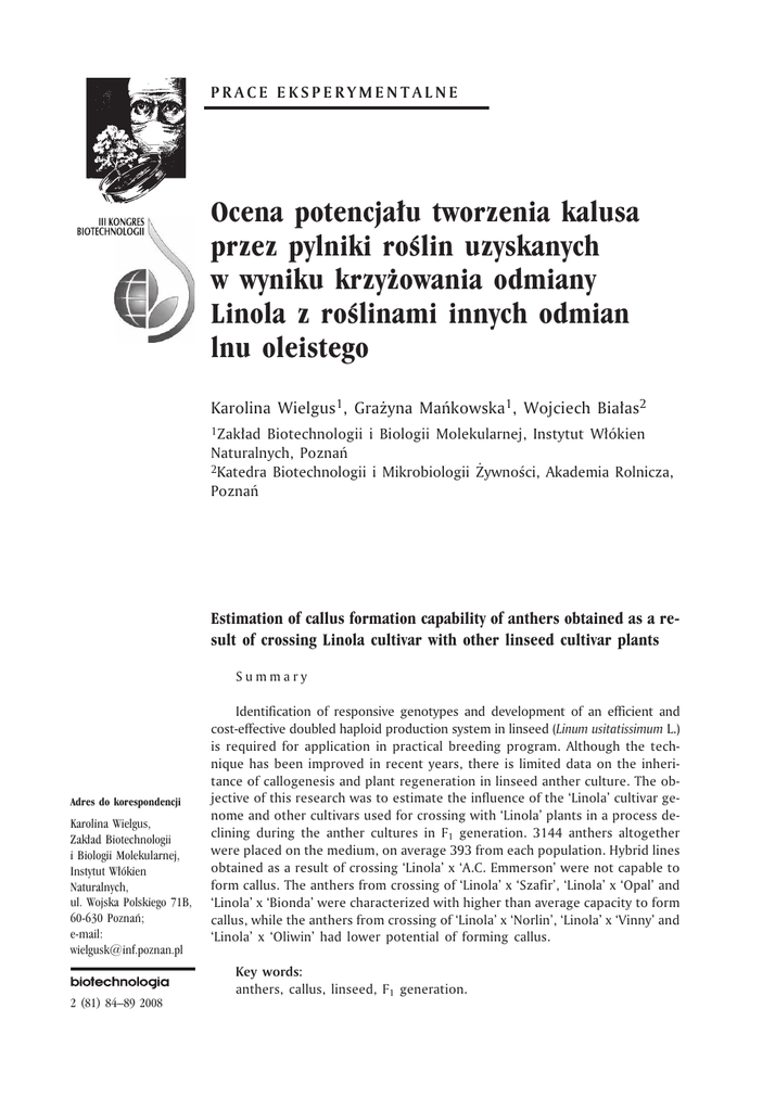 PRACE EKSPERYMENTALNE Ocena potencja³u tworzenia kalusa przez pylniki roœlin uzyskanych w wyniku krzy¿owania odmiany Linola z roœlinami innych odmian lnu oleistego Karolina Wielgus1, Gra¿yna Mañkowska1, Wojciech Bia³as2 1Zak³ad Biotechnologii i Biologii Molekularnej, Instytut W³ókien Naturalnych, Poznañ 2Katedra Biotechnologii i Mikrobiologii ¯ywnoœci, Akademia Rolnicza, Poznañ Estimation of callus formation capability of anthers obtained as a result of crossing Linola cultivar with other linseed cultivar plants Summary Adres do korespondencji Karolina Wielgus, Zak³ad Biotechnologii i Biologii Molekularnej, Instytut W³ókien Naturalnych, ul. Wojska Polskiego 71B, 60-630 Poznañ; e-mail: [email protected] 2 (81) 84–89 2008 Identification of responsive genotypes and development of an efficient and cost-effective doubled haploid production system in linseed (Linum usitatissimum L.) is required for application in practical breeding program. Although the technique has been improved in recent years, there is limited data on the inheritance of callogenesis and plant regeneration in linseed anther culture. The objective of this research was to estimate the influence of the ‘Linola’ cultivar genome and other cultivars used for crossing with ‘Linola’ plants in a process declining during the anther cultures in F1 generation. 3144 anthers altogether were placed on the medium, on average 393 from each population. Hybrid lines obtained as a result of crossing ‘Linola’ x ‘A.C. Emmerson’ were not capable to form callus. The anthers from crossing of ‘Linola’ x ‘Szafir’, ‘Linola’ x ‘Opal’ and ‘Linola’ x ‘Bionda’ were characterized with higher than average capacity to form callus, while the anthers from crossing of ‘Linola’ x ‘Norlin’, ‘Linola’ x ‘Vinny’ and ‘Linola’ x ‘Oliwin’ had lower potential of forming callus. Key words: anthers, callus, linseed, F1 generation. Ocena potencja³u tworzenia kalusa przez pylniki roœlin uzyskanych w wyniku krzy¿owania odmiany Linola 1. Wstêp Len jest gatunkiem diploidalnym (2n = 30), samopylnym (obcopylnoœæ stanowi 5-10%) (1), cenionym od wielu lat jako roœlina w³óknodajna. Obecnie du¿ym zainteresowaniem ciesz¹ siê badania nad wykorzystaniem do celów przemys³owych oleju lnianego. Olej lniany charakteryzuje siê wysok¹ zawartoœci¹ nienasyconych kwasów t³uszczowych, co umo¿liwia jego zastosowanie w produkcji kosmetyków, szybko schn¹cych farb i lakierów, oleju oœwietleniowego, tuszu drukarskiego i biopaliw (2). Dla spo¿ywczego zastosowania oleju lnianego szczególnie istotna jest wysoka zawartoœæ kwasu linolenowego, zw³aszcza kwasu a-linolenowego nale¿¹cego do rodziny omega 3, stanowi¹cej niezbêdny sk³adnik prawid³owej diety cz³owieka (3). Uprawy oleistych odmian lnu o najwiêkszym znaczeniu gospodarczym i przemys³owym znajduj¹ siê w krajach o klimacie umiarkowanym, zw³aszcza w Argentynie, Indiach, Chinach, Kanadzie, Stanach Zjednoczonych i Rosji. Obecnie na œwiecie produkowane s¹ 3 miliony ton oleju lnianego rocznie (4) i trwaj¹ poszukiwania nowych odmian cennych dla przemys³u. Wykorzystanie procesu androgenezy umo¿liwia otrzymanie homozygotycznych linii w postaci haploidów i podwojonych haploidów (DH), które stanowi¹ bardzo dobry materia³ do badañ nad genetycznym uwarunkowaniem cech iloœciowych (4,5), a wykorzystanie DH w programach hodowlanych lnu umo¿liwia skrócenie czasu koniecznego do otrzymania stabilnych genetycznie linii i wyprowadzenia z nich odmian o po¿¹danych cechach. Procedura otrzymywania roœlin w kulturach pylnikowych obejmuje inicjacjê tworzenia siê kalusa z mikrospor oraz ró¿nicowanie korzeni i pêdów (7,8). Opisano du¿¹ zmiennoœæ tych procesów w kulturach pylnikowych ró¿nych genotypów lnu oleistego (3,6). W procesie dziedziczenia tych cech obserwuje siê zarówno addytywne jak i nieaddytywne oddzia³ywania genów (9). Mimo ¿e technikê kultur pylnikowych lnu udoskonalono znacznie w ostatnich latach, informacje dotycz¹ce dziedziczenia potencja³u tworzenia kalusa i regeneracji roœlin pozostaj¹ nadal znikome. Celem pracy by³o okreœlenie wp³ywu genomu odmiany Linola charakteryzuj¹cej siê nisk¹ zawartoœci¹ kwasu linolenowego i siedmiu innych odmian u¿ytych do krzy¿owania z roœlinami ‘Linola’ na procesy zachodz¹ce podczas prowadzenia kultur pylnikowych w pokoleniu F1. 2. Materia³y i metody 2.1. Materia³ roœlinny Badania prowadzono na roœlinach odmiany Linola oraz roœlinach odmian Bionda, Szafir, Opal, Oliwin, Vinny, A.C. Emmerson i Norlin, o znanej mo¿liwoœci tworzenia kalusa i potencjale regeneracyjnym kultur pylnikowych. Roœliny wysadzono do waBIOTECHNOLOGIA 2 (81) 84-89 2008 85 Karolina Wielgus, Gra¿yna Mañkowska, Wojciech Bia³as zonów w szklarni Zak³adu Doœwiadczalnego IWN Pêtkowo. Podczas uprawy nie stosowano œrodków ochrony roœlin. 2.2. Kultury pylnikowe Pylniki pobierano z p¹ków kwiatowych, zebranych z roœlin macierzystych w pocz¹tkowym okresie kwitnienia. Kultury pylnikowe prowadzono wed³ug procedury opisanej przez Rutkowsk¹-Krause (6). Wszystkie doœwiadczenia wykonano w trzech powtórzeniach (131 pylników na powtórzenie). 2.3. Hodowla ex vitro Ukorzenione roœliny poddawano aklimatyzacji i ukorzenianiu w sterylnej ziemi ogrodniczej w temperaturze 18-20°C, i fotoperiodzie 16/8 godzin. Przez pocz¹tkowe dwa tygodnie roœliny przykrywano szklanym naczyniem w celu ograniczenia parowania wody. 2.4. Analiza statystyczna Uzyskane wyniki by³y poddane analizie statystycznej. Zastosowano: transformacjê zmiennej zale¿nej za pomoc¹ funkcji ArcSinÖY, analizê wariancji na poziomie istotnoœci 0,05 oraz test Tukeya HSD. 3. Wyniki i dyskusja Wykorzystanie haploidalnego materia³u roœlinnego jest coraz czêœciej stosowane w programach hodowlanych (4). Powszechne zastosowanie procesu androgenezy jest jednak limitowane wieloma czynnikami, m.in. czynnikami genetycznymi