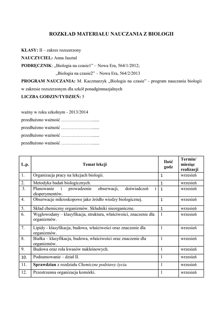 ROZKŁAD MATERIAŁU NAUCZANIA Z BIOLOGII KLASY: II – zakres rozszerzony NAUCZYCIEL: Anna Jasztal PODRĘCZNIK: „Biologia na czasie1” – Nowa Era, 564/1/2012; „Biologia na czasie2” – Nowa Era, 564/2/2013 PROGRAM NAUCZANIA: M. Kaczmarzyk „Biologia na czasie” - program nauczania biologii w zakresie rozszerzonym dla szkół ponadgimnazjalnych LICZBA GODZIN/TYDZIEŃ: 5 ważny w roku szkolnym - 2013/2014 przedłużono ważność …………………...... przedłużono ważność …………………...... przedłużono ważność …………………...... przedłużono ważność …………………...... L.p. 1. Organizacja pracy na lekcjach biologii. 2. 3. Metodyka badań biologicznych. Planowanie i prowadzenie obserwacji, doświadczeń eksperymentów. Obserwacje mikroskopowe jako źródło wiedzy biologicznej. 4. Ilość godz Temat lekcji 1 Termin/ miesiąc realizacji wrzesień 1 i 1 wrzesień wrzesień 1 wrzesień 5. 6. Skład chemiczny organizmów. Składniki nieorganiczne. Węglowodany – klasyfikacja, struktura, właściwości, znaczenie dla organizmów. 1 1 wrzesień wrzesień 7. 1 wrzesień 1 wrzesień 9. Lipidy - klasyfikacja, budowa, właściwości oraz znaczenie dla organizmów. Białka – klasyfikacja, budowa, właściwości oraz znaczenie dla organizmów. Budowa oraz rola kwasów nukleinowych. 1 wrzesień 10. Podsumowanie – dział II. 1 wrzesień 11. Sprawdzian z rozdziału Chemiczne podstawy życia. 1 wrzesień 12. Przestrzenna organizacja komórki. 1 wrzesień 8. 13. Budowa i właściwości błon biologicznych. 1 wrzesień 14. Funkcje błon biologicznych. 1 wrzesień 15. 1 wrzesień 16. Składniki cytoplazmy i ich funkcje. Czy może istnieć ruch bez szkieletu? Składniki cytoplazmy otoczone podwójną błoną. 1 październik 17. Budowa oraz funkcje jądra komórkowego. 1 październik 18. 19. Pozostałe składniki cytoplazmy. Podziały komórkowe. Cykl życiowy komórki. 1 1 październik październik 20. Rozmnażanie się komórek – mitoza. 1 październik 21. Rozmnażanie się organizmów – mejoza. 1 październik 22. Podsumowanie – dział III. 23. Sprawdzian wiedzy z rozdziału Komórka: podstawowa jednostka życia. 1 październik 24. Klasyfikowanie organizmów. 1 październik 25. Sposoby identyfikacji organizmów – korzystanie z klucza do oznaczania organizmów. 1 październik 26. Wirusy – bezkomórkowe formy materii. 1 październik 27. Infekcja wirusowa – cykl lityczny i lizogeniczny. 1 październik 28. Bakterie – organizmy bezjądrowe. 1 październik 29. Znaczenie bakterii w przyrodzie i dla człowieka. 1 październik 30. Protisty – proste organizmy eukariotyczne. 1 październik 31. 32. Przegląd protistów zwierzęcopodobnych. Przegląd protistów roślinopodobnych i grzybopodobnych. 1 1 październik październik 33. Znaczenie protistów w przyrodzie i dla człowieka. 1 październik 34. Grzyby – cudzożywne beztkankowce. 1 październik 35. 36. Rozmnażanie się grzybów. Cykle rozwojowe. Porosty – symbioza czy niewolnictwo? 1 1 październik listopad 37. Podsumowanie – dział IV. 1 listopad 38. Sprawdzian wiedzy z rozdziału Różnorodność wirusów, bakterii, protistów, grzybów. 1 listopad 39. Rośliny pierwotnie wodne. 1 listopad 40. Główne kierunki rozwoju roślin lądowych. 1 listopad 41. Tkanki roślinne: tkanki twórcze. 1 listopad 42. Tkanki roślinne: tkanki okrywające. 1 listopad 43. Tkanki roślinne: tkanki miękiszowe. 1 listopad październik 44. Tkanki roślinne: tkanki wzmacniające. 1 listopad 45. Tkanki roślinne: tkanki przewodzące. 1 listopad 46. Budowa i funkcje korzenia. 1 listopad 47. Budowa i funkcje łodygi. listopad 48. Budowa i funkcje liści. 1 1 49. Mszaki – rośliny o dominującym gametoficie 1 listopad 50. Przegląd oraz znaczenie mszaków. 1 listopad 51. Paprotniki – zarodnikowe rośliny naczyniowe. 1 listopad 52. Cykle rozwojowe paprotników. 1 grudzień 53. Nagozalążkowe – rośliny kwiatowe z nieosłoniętym zalążkiem. 1 grudzień 54. 55. Cykl rozwojowy rośliny nagozalążkowej. Okrytozalążkowe – rośliny wytwarzające owoce. 1 1 grudzień grudzień 56. Cykl rozwojowy rośliny okrytozalążkowej. 1 grudzień 57. 58. 59. 60. Po czym rozróżnić roślinę jednoliścienną od rośliny dwuliściennej? Porównanie roślin nago- i okrytozalążkowych. Podsumowanie – dział V. Sprawdzian wiedzy z rozdziału Różnorodność roślin. 1 1 1 1 grudzień grudzień grudzień grudzień 61. 62. Transport wody, soli mineralnych i substancji odżywczych Wzrost i rozwój roślin okrytonasiennych 1 1 grudzień grudzień 63. 64. 65. 66. 67. 68. 69. 70. 71. Regulatory wzrostu i rozwoju roślin Reakcje roślin na bodźce Podsumowanie – dział VI. Kryteria klasyfikacji zwierząt Gąbki – zwierzęta beztkankowe Tkanki zwierzęce: tkanka nabłonkowa. Tkanki zwierzęce: tkanka łączna stała. Tkanki zwierzęce: tkanka łączna płynna. Tkanki zwierzęce: tkanka mięśniowa. 1 1 1 1 1 1 1 1 1 grudzień styczeń styczeń styczeń styczeń styczeń styczeń styczeń styczeń 72. 73. Tkanki zwierzęce: tkanka nerwowa. Parzydełkowce – tkankowe zwierzęta dwuwarstwowe. 1 1 styczeń styczeń 74. 75. 76. 77. 78. 79. 80. 81. 82. Przegląd oraz znaczenie parzydełkowców. Płazińce – zwierzęta spłaszczone grzbietobrzusznie. Cykle rozwojowe płazińców pasożytniczych. Nicienie – zwierzęta o obłym, nieczłonowanym ciele. Cykle rozwojowe nicieni. Pierścienice – bezkręgowce o wyraźnej metamerii. Przegląd oraz znaczenie pierścienic. Budowa morfologiczna stawonogów. Budowa anatomiczna stawonogów. 1 1 1 1 1 1 1 1 1 styczeń styczeń styczeń styczeń styczeń styczeń styczeń styczeń luty listopad 83. 84. Rozmnażanie i rozwój stawonogów. Przegląd i znaczenie stawonogów. 1 1 luty luty 85. 86. 87. 88. 89. 90. 91. 92. 93. 94. 95. 96. 97. 98. 99. 100. 101. 102. 103. 104. 105. 106. 107. 108. 109. 110. Mięczaki– zwierzęta o miękkim, niesegmentowanym ciele. Budowa anatomiczna mię