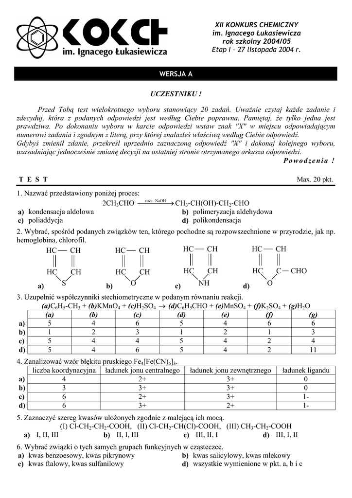 XII KONKURS CHEMICZNY im. Ignacego Łukasiewicza rok szkolny 2004/05 Etap I – 27 listopada 2004 r. WERSJA A UCZESTNIKU ! Przed Tobą test wielokrotnego wyboru stanowiący 20 zadań. Uważnie czytaj każde zadanie i zdecyduj, która z podanych odpowiedzi jest według Ciebie poprawna. Pamiętaj, że tylko jedna jest prawdziwa. Po dokonaniu wyboru w karcie odpowiedzi wstaw znak "X" w miejscu odpowiadającym numerowi zadania i zgodnym z literą, przy której znalazłeś właściwą według Ciebie odpowiedź. Gdybyś zmienił zdanie, przekreśl uprzednio zaznaczoną odpowiedź "X" i dokonaj kolejnego wyboru, uzasadniając jednocześnie zmianę decyzji na ostatniej stronie otrzymanego arkusza odpowiedzi. Powodzenia ! Max. 20 pkt. T E S T 1. Nazwać przedstawiony poniżej proces: NaOH → CH3-CH(OH)-CH2-CHO 2CH3CHO rozc. b) polimeryzacja aldehydowa a) kondensacja aldolowa c) poliaddycja d) polikondensacja 2. Wybrać, spośród podanych związków ten, którego pochodne są rozpowszechnione w przyrodzie, jak np. hemoglobina, chlorofil. HC CH HC CH HC CH HC CH HC a) CH S HC b) HC CH O c) CH NH HC d) C CHO O 3. Uzupełnić współczynniki stechiometryczne w podanym równaniu reakcji. (a)C6H5-CH3 + (b)KMnO4 + (c)H2SO4 → (d)C6H5CHO + (e)MnSO4 + (f)K2SO4 + (g)H2O (a) (b) (c) (d) (e) (f) (g) 5 4 6 5 4 6 6 a) 1 2 3 1 2 1 3 b) 5 4 4 5 4 2 4 c) 5 4 6 5 4 2 11 d) 4. Zanalizować wzór błękitu pruskiego Fe4[Fe(CN)6]3. liczba koordynacyjna ładunek jonu centralnego 4 2+ a) 3 3+ b) 6 2+ c) 6 3+ d) ładunek jonu zewnętrznego 3+ 3+ 3+ 2+ ładunek ligandu 0 0 11- 5. Zaznaczyć szereg kwasów ułożonych zgodnie z malejącą ich mocą. (I) Cl-CH2-CH2-COOH, (II) Cl-CH2-CH(Cl)-COOH, (III) CH3-CH2-COOH a) I, II, III b) II, I, III c) III, II, I d) III, I, II 6. Wybrać związki o tych samych grupach funkcyjnych w cząsteczce. b) kwas salicylowy, kwas mlekowy a) kwas benzoesowy, kwas pikrynowy d) wszystkie wymienione w pkt. a, b i c c) kwas ftalowy, kwas sulfanilowy 7. Rozróżnić wśród podanych związków freony. b) CH2Cl2, CHCl3 a) CBrClF2, CHBr3 c) CH3Cl, CH2F2 d) CCl2F2, CFCl3 8. Zdecydować, które roztwory zabarwią fenoloftaleinę na malinowo. a) AlCl3, CH3COONa, Na2SO4 b) (C17H35COO)2Ca, NaHSO4, Na3PO4 d) NaClO4, K2SO3, BaCl2 c) Na2HPO4, CH3COONa, K2CO3 9. Przyporządkować typ izomerii do odpowiedniego związku, który występuje w postaci izomerów właściwych wybranemu typowi izomerii. X - C6H5-C3H7 I izomeria „cis-trans” II izomeria „syn-anti” Y - C6H5-C2H4OH Z - C6H5-CH=CHCl III izomeria optyczna W - C6H5-CH=NOH IV izomeria łańcuchowa a) I – X, II – Y, III – Z, IV – W c) I – Z, II – Y, III – X, IV – Z b) I – Y, II – Z, III – W, IV – X d) I – Z, II – W, III – Y, IV – X 10. Nazwać kamień filozoficzny poszukiwany przez Harry Potter’a. a) akwamaryn b) almagra c) ametyst d) azbest 11. Zdecydować, jakie skutki na organizm człowieka może powodować niedobór amidu kwasu nikotynowego. a) zaburzenia układu nerwowego i pokarmowego b) głód nikotynowy u palaczy d) apatię i schorzenia skórne c) trudności w gojeniu się ran i szkorbut 12. Zdecydować, który z aminokwasów podczas elektroforezy w środowisku obojętnym pozostaje w punkcie izoelektrycznym. a) lizyna b) kwas asparaginowy c) alanina d) kwas glutaminowy 13. Zidentyfikować nazwę mieszaniny: 3 objętości HCl i 1 objętość HNO3. a) woda Burowa b) woda ciężka c) woda Javela d) woda królewska 14. Przyporządkować barwę płomienia palnika do roztworu soli następujących metali: bar wapń magnez zielony niebieski żółty a) ceglastoczerwony karminowoczerwony pomarańczowoczerwony b) żółty żółtozielony ceglastoczerwony c) żółtozielony ceglastoczerwony nie barwi d) 15. Wskazać schemat ogniwa stosowanego podczas miareczkowania potencjometrycznego. a) Ag, AgCl | HCl | r-r badany | KCl | Hg2Cl2, Hg b) Pt, H2 | HCl | r-r badany | HCl | Cl2, Pt d) Pt | Fe3+, Fe2+ | r-r badany | H+, MnO2, Mn2+ | Pt c) Pt, H2 | szkło | r-r badany | KCl | AgCl, Ag 16. Zdecydować, które z podanych równań reakcji przedstawia proces zachodzący w bombie jądrowej. 1 92 1 b) 235 a) 239 → 239 → 239 →141 92 U 93 Np 94 Pu 92 U + 0 n 56 Ba + 36 Kr + 3( 0 n) c) 2 1 d) H + 31 H → 42 He+ 01 n 4 2 1 He+ 238 → 241 92 U 94 Pu + 0 n 17. Rozpoznać prawdziwe stwierdzenia wśród danych: I - w warunkach izotermiczno-izobarycznych zamknięty układ reagentów dąży do osiągnięcia minimalnej wartości entalpii swobodnej II - zamknięty układ reagentów osiąga stan równowagi termodynamicznej wówczas, gdy entalpia układu osiągnie wartość minimum III- zamknięty układ reagentów osiąga stan równowagi termodynamicznej wówczas gdy entalpia swobodna osiąga wartość minimum IV- w warunkach izotermiczno-izochorycznych zamknięty układ reagentów dąży do osiągnięcia maksimum wartości entalpii swobodnej V - funkcja Gibbsa-Helmholtza jest zdefiniowana równaniem: ∆G = ∆H − T∆ S a) I, II, V b) I, II, IV, V Etap I – wersja A c) II, III, V Strona 2 d) I, III, V 18. Uszeregować metale biorące udział w podanych reakcjach według malejących właściwości redukujących. In + 3TlCl → InCl3 + 3Tl 2In + 3CoCl2 → 2InCl3 + 3Co 2Tl + CoCl2 → 2TlCl + Co Ga + InCl3 → GaCl3 + In a) In, Tl, Ga, Co b) Ga, In, Tl, Co c) Co, Tl, In, Ga d) Tl, In, Co, Ga 19. Wskazać, w którym roztworze jest największe stężenie H+, gdy stężenia molowe OH- są następujące: II [OH-] = 10-5 III [OH-] = 10-4 IV [OH-] = 10-6 I [OH-] = 10-3 a) I b) II c) III d) IV 20. Wskazać zbiór substancji chemicznych zawierających tylko zasady a) H3O+, NH +4 , HCN b) NH3, CH3COO-, OHc) HSO -4 , Na+, NH3 d) OH-, HSO -4 , H2SO4 UCZESTNIKU ! Przed Tobą 3 zadania otwarte. Rozwiąż je stosując zasady matematyki, właściwe prawa chemiczne, wyeksponuj przeliczanie jednostek i uwzględnij komentarz pisemny. Każde zadanie winno znaleźć rozwiązanie na odpowiednich stronach (obliczenia pomocnicze również). Gdybyś chc