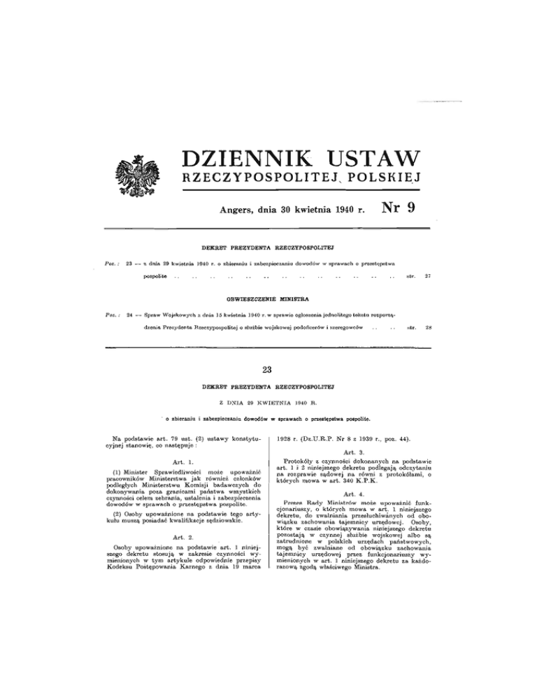 DZIENNIK USTAW RZECZYPOSPOLITEJ. POLSKIEJ Angers, dnia 30 kwietnia 1940 r. DEKRET PREZYDENTA Poz. : Nr 9 RZECZYPOSPOLITEJ 23 — z dnia 29 kwietnia 1940 r. o zbieraniu i zabezpieczaniu dowodów w sprawach o przestępstwa pospolite .. .. .. .. .. .. .. .. .. .. .• .• •• str. 27 str. 28 OBWIESZCZENIE MINISTRA Poz. : 24 — Spraw Wojskowych z dnia 15 kwietnia 1940 r. w sprawie ogłoszenia jednolitego t e k s t u rozporządzenia Prezydenta Rzeczypospolitej o służbie wojskowej podoficerów i szeregowców .. .. 23 DEKRET PREZYDENTA RZECZYPOSPOLITEJ Z D N I A 29 K W I E T N I A 1940 R . o zbieraniu i zabezpieczaniu dowodów w sprawach o przestępstwa pospolite. Na podstawie art. 79 ust. (2) ustawy konstytucyjnej stanowię, co następuje : Art. 1. (1) Minister Sprawiedliwości może upoważnić pracowników Ministerstwa jak również członków podległych Ministerstwu Komisji badawczych do dokonywania poza granicami państwa wszystkich czynności celem zebrania, ustalenia i zabezpieczenia dowodów w sprawach o przestępstwa pospolite. (2) Osoby upoważnione na podstawie tego artykułu muszą posiadać kwalifikacje sędziowskie. Art. 2. Osoby upoważnione na podstawie art. 1 niniejszego dekretu stosują w zakresie czynności wymienionych w tym artykule odpowiednie przepisy Kodeksu Postępowania Karnego z dnia 19 marca 1928 r. (Dz.U.R.P. Nr 8 z 1939 r., poz. 44). Art. 3. Protokóły z czynności dokonanych na podstawie art. 1 i 2 niniejszego dekretu podlegają odczytaniu na rozprawie sądowej na równi z protokółami, o których mowa w art. 340 K . P . K . Art. 4. Prezes R a d y Ministrów może upoważnić funkcjonariuszy, o których mowa w art. 1 niniejszego dekretu, do zwalniania przesłuchiwanych od obowiązku zachowania tajemnicy urzędowej. Osoby, które w czasie obowiązywania niniejszego dekretu pozostają w czynnej służbie wojskowej albo są zatrudnione w polskich urzędach państwowych, mogą być zwalniane od obowiązku zachowania tajemnicy urzędowej przez funkcjonariuszy wymienionych w art. 1 niniejszego dekretu za każdorazową zgodą właściwego Ministra. Dziennik Ustaw Nr 5 — 28 — Art. 5. Poz. 11 i 12 nistrowi Sprawiedliwości i Ministrowi Spraw Zagranicznych. Minister Sprawiedliwości może nadać protokółom z czynności dokonanych przed wejściem w życie niniejszego dekretu moc przewidzianą w art. 3, o ile protokóły te sporządzone zostały przez osoby posiadające kwalifikacje sędziowskie. Art. 8. Dekret niniejszy wchodzi w życie z dniem ogłoszenia. Art. 6. Prezydent Rzeczypospolitej : Władysław Akta oraz dowody zebrane bądź utrwalone na podstawie niniejszego dekretu przechowuje Ministerstwo Sprawiedliwości. Raczkiewicz Prezes Rady Ministrów i Minister Sprawiedliwości: Art. 7. Sikorski Minister Spraw Zagranicznych : August Wykonanie niniejszego dekretu powierza się Mi- Załeski 24 OBWIESZCZENIE MINISTRA SPRAW WOJSKOWYCH Z DNIA 15 K W I E T N I A 1940 R . w sprawie ogłoszenia jednolitego tekstu rozporządzenia Prezydenta Rzeczypospolitej o służbie wojskowej podoficerów i szeregowców. Na podstawie art. 3 dekretu Prezydenta Rzeczypospolitej z dnia 6 marca 1940 r. w sprawie zmiany i zawieszenia mocy obowiązującej niektórych przepisów rozporządzenia Prezydenta Rzeczypospolitej z dnia 7 października 1932 r. o służbie wojskowej podoficerów i szeregowców (Dz.U.R.P. Nr 5, poz. 12) ogłaszam w brzmieniu obowiązującym od dnia 7 marca 1940 r. jednolity tekst rozporządzenia Prezydenta Rzeczypospolitej z dnia 7 października 1932 r. o służbie wojskowej podoficerów i szeregowców (Dz.U.R.P. Nr 89, poz. 747) z uwzględnieniem zmian wynikających z : 1) Art. 26 Rozporządzenia Prezydenta Rzeczypospolitej z dnia 28 grudnia 1934 r. o unormowaniu właściwości władz i trybu postępowania w niektórych działach administracji państwowej (Dz.U.R.P. Nr 110, poz. 976) ; 2) Dekretu Prezydenta Rzeczypospolitej z dnia 26 czerwca 1936 r. w sprawie zmiany roz- porządzenia Prezydenta Rzeczypospolitej ż dnia 7 października 1932 r. o służbie wojskowej podoficerów i szeregowców (Dz.U.R.P. Nr 55, poz. 399); 3) Dekretu Prezydenta Rzeczypospolitej z dnia 14 kwietnia 1939 r. w sprawie zmiany rozporządzenia Prezydenta Rzeczypospolitej z dnia 7 października 1932 r. o służbie wojskowej podoficerów i szeregowców (Dz.U.R.P. Nr 35, poz. 221); 4) Dekretu Prezydenta Rzeczypospolitej z dnia 6 marca 1940 r. w sprawie zmiany i zawieszenia mocy obowiązującej niektórych przepisów rozporządzenia Prezydenta Rzeczypospolitej z dnia 7 października 1932 r. o służbie wojskowej podoficerów i szeregowców (Dz.U.R.P. Nr 5, poz. 12). Minister Spraw Wojskowych : Sikorski Załącznik do obwieszczenia Ministra Spraw Wojskowych z dnia 15 kwietnia 1940 r. poz. 24. ROZPORZĄDZENIE PREZYDENTA RZECZYPOSPOLITEJ Z DNIA 7 PAŹDZIERNIKA 1932 R. o służbie wojskowej podoficerów i szeregowców. Na podstawie art. 44 ust. (6) Konstytucji i art. 1 lit. a) ustawy z dnia 17 marca 1932 r. o upoważnieniu Prezydenta Rzeczypospolitej do wydawania rozporządzeń z mocą ustawy (Dz.U.R.P. Nr 22, poz. 165) postanawiam, co następuje : ROZDZIAŁ I. POSTANOWIENIA OGÓLNE Art. 1. Wojsko narodowe, siła zbrojna Państwa, będąca ochroną i ostoją niepodległości i wolności Rzeczy- Dziennik Ustaw Nr 7 — 29 — Poz.18i19 pospolitej, będzie po wsze czasy podlegać opiece Narodu. Art. 2. (1) Żołnierz jest obywatelem, na którym spoczywa szczególny obowiązek bronienia Ojczyzny i gotowości każdej chwili oddania życia w jej obronie. (2) W szczególności winien on służyć za wzór miłości Ojczyzny i honoru, pełnić zawsze wiernie i uczciwie służbę narodową, być dbałym, sprawiedliwym dowódcą, opiekunem i wychowawcą podwładnych żołnierzy, posłusznym i oddanym podwładnym, szczerym i doskonałym kolegą oraz życzliwym współobywatelem całej ludności, której praca i patriotyzm są warunkiem siły wojska. Art. 3. (1) Żołnierzem staje się każdy, kto zosta