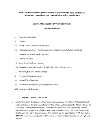 Przed rozpoczęciem korzystania ze sklepu internetowego www.madama.co Usługobiorcy są zobowiązani zapoznać się z treścią Regulaminu. REGULAMIN SKLEPU INTERNETOWEGO www.madama.co I. Postanowienia ogólne II. Definicje III. Rodzaj i zakres usług elektronicznych IV. Warunki świadczenia i zawierania umów o świadczenie usług elektronicznych V. Warunki zawierania umów sprzedaży VI. Sposoby płatności VII. Koszt, termin i sposoby dostawy VIII. Warunki rozwiązania umów o świadczenie usług elektronicznych IX. Tryb postępowania reklamacyjnego X. Prawo odstąpienia od umowy XI. Własność intelektualna XII. Postanowienia dotyczące przedsiębiorców (B2B) XIII. Postanowienia końcowe I. 1. POSTANOWIENIA OGÓLNE Sklep internetowy działający pod adresem www.madama.co prowadzony jest przez Klaudię Kuhn wykonującą działalność gospodarczą pod firmą Madama. Klaudia Kuhn. wpisaną do Centralnej Ewidencji i Informacji o Działalności Gospodarczej Rzeczypospolitej Polskiej prowadzonej przez ministra właściwego do spraw gospodarki, adres miejsca wykonywania działalności oraz adres do doręczeń: ul. Waryńskiego 42, 80-242 Gdańsk, NIP: 8431554612, REGON: 221510916, adres poczty elektronicznej (e-mail): [email protected], tel. + 48 509 265 243. 2. Sklep www.madama.co działa na zasadach określonych w niniejszym Regulaminie. 3. Regulamin określa rodzaje i zakres usług świadczonych drogą elektroniczną przez Sklep www.madama.co, zasady świadczenia tych usług, warunki zawierania i rozwiązywania umów o świadczenie usług drogą elektroniczną oraz Umów Sprzedaży Produktu, a także tryb postępowania reklamacyjnego. 4. Każdy Usługobiorca z chwilą podjęcia czynności zmierzających do korzystania z Usług Elektronicznych Sklepu www.madama.co, zobowiązany jest do przestrzegania postanowień niniejszego Regulaminu. 5. Warunkiem złożenia Zamówienia w Sklepie przez Klienta jest zapoznanie się z Regulaminem i akceptacja jego postanowień w czasie składania Zamówienia. 6. Sklep www.madama.co prowadzi sprzedaż detaliczną Produktów, za pośrednictwem sieci Internet na terenie Polski oraz w innych krajach Unii Europejskiej. 7. Produkty oferowane w Sklepie są nowe, wolne od wad prawnych i zostały legalnie wprowadzone na rynek polski. 8. W sprawach nieuregulowanych w niniejszym Regulaminie mają zastosowanie przepisy a) Ustawy o świadczeniu usług drogą elektroniczną z dnia 18 lipca 2002 r. (Dz. U. Nr 144, poz. 1204 ze zm.), b) Ustawy o prawach konsumenta z dnia 30 maja 2014 r. (Dz. U. 2014 poz. 827), c) Ustawy Kodeks cywilny z dnia 23 kwietnia 1964 r. (Dz. U. nr 16, poz. 93 ze zm.) oraz inne właściwe przepisy prawa polskiego. II. 1. DEFINICJE DZIEŃ ROBOCZY – jeden dzień od poniedziałku do piątku z wyłączeniem dni ustawowo wolnych od pracy. 2. FORMULARZ ZAMÓWIENIA – formularz dostępny na stronie internetowej www.madama.co umożliwiający złożenie Zamówienia. 3. KONSUMENT – osoba fizyczna, która dokonuje z przedsiębiorcą czynności prawnej niezwiązanej bezpośrednio z jej działalnością gospodarczą lub zawodową. 4. KLIENT – Usługobiorca, który zamierza zawrzeć lub zawarł Umowę Sprzedaży ze Sprzedawcą. 5. REGULAMIN - niniejszy regulamin Sklepu. 6. SKLEP - Sklep internetowy Usługodawcy działający pod adresem www.madama.co 7. SPRZEDAWCA, USŁUGODAWCA – Klaudia Kuhn wykonująca działalność gospodarczą pod firmą Madama. Klaudia Kuhn, ul. Waryńskiego 42, 80-242 Gdańsk, NIP: 8431554612, REGON: 221510916. 8. PRODUKT – dostępna w Sklepie rzecz ruchoma albo usługa, będąca przedmiotem Umowy Sprzedaży między Klientem a Sprzedawcą. 9. UMOWA SPRZEDAŻY – Umowa Sprzedaży Produktu zawarta między Klientem, a Sprzedawcą za pośrednictwem Sklepu. 10. USŁUGOBIORCA – osoba fizyczna, osoba prawna albo jednostka organizacyjna nieposiadająca osobowości prawnej, której ustawa przyznaje zdolność prawną korzystająca z Usługi Elektronicznej. 11. USŁUGA ELEKTRONICZNA – usługa świadczona drogą elektroniczną przez Usługodawcę na rzecz Usługobiorcy za pośrednictwem Sklepu. 12. ZAMÓWIENIE - oświadczenie woli Klienta stanowiące ofertę zawarcia Umowy Sprzedaży Produktu ze Sprzedawcą. 13. NEWSLETTER – Usługa Elektroniczna pozwalająca Usługobiorcy na subskrybowanie i otrzymywanie na podany przez Usługobiorcę adres e-mail bezpłatnych informacji pochodzących od Usługodawcy, dotyczących Produktów dostępnych w Sklepie. III. 1. RODZAJ I ZAKRES USŁUG ELEKTRONICZNYCH Usługodawca umożliwia za pośrednictwem Sklepu korzystanie z Usług Elektronicznych takich jak: a) zawieranie Umów Sprzedaży Produktu, b) korzystanie z Newslettera. 2. Świadczenie Usług Elektronicznych na rzecz Usługobiorców w Sklepie odbywa się na warunkach określonych w Regulaminie. 3. Usługodawca ma prawo do zamieszczania na stronie internetowej Sklepu treści reklamowych. Treści te, stanowią integralną część Sklepu i prezentowanych w nim materiałów. IV. WARUNKI ŚWIADCZENIA I ZAWIERANIA UMÓW O ŚWIADCZENIE USŁUG ELEKTRONICZNYCH 1. Świadczenie Usług Elektronicznych określonych w rozdziale III pkt. 1 Regulaminu przez Usługodawcę jest nieodpłatne. 2. Okres na jaki umowa zostaje zawarta: a) umowa o świadczenie Usługi Elektronicznej polegającej na umożliwieniu złożenia Zamówienia w Sklepie zawierana jest na czas oznaczony i ulega rozwiązaniu z chwilą złożenia Zamówienia albo zaprzestania jego składania przez Usługobiorcę. b) umowa o świadczenie Usługi Elektronicznej polegającej na korzystaniu z Newslettera zawierana jest na czas nieoznaczony. 3. Wymagania techniczne niezbędne do współpracy z systemem teleinformatycznym, którym posługuje się Usługodawca: a) komputer z dostępem do Internetu, b) dostęp do poczty elektronicznej, c) przeglądarka internetowa, d) włączenie w przeglądarce internetowej Cookies oraz Javascript. 4. Usługobiorca zobowiązany jest do korzystania ze Sklepu w spo