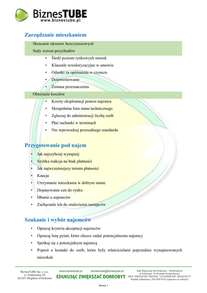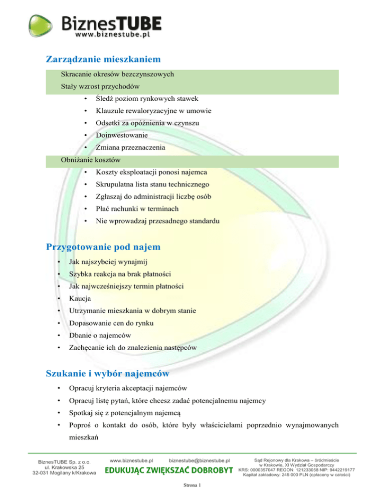 Zarządzanie mieszkaniem Skracanie okresów bezczynszowych Stały wzrost przychodów • Śledź poziom rynkowych stawek • Klauzule rewaloryzacyjne w umowie • Odsetki za opóźnienia w czynszu • Doinwestowanie • Zmiana przeznaczenia Obniżanie kosztów • Koszty eksploatacji ponosi najemca • Skrupulatna lista stanu technicznego • Zgłaszaj do administracji liczbę osób • Płać rachunki w terminach • Nie wprowadzaj przesadnego standardu Przygotowanie pod najem • Jak najszybciej wynajmij • Szybka reakcja na brak płatności • Jak najwcześniejszy termin płatności • Kaucja • Utrzymanie mieszkania w dobrym stanie • Dopasowanie cen do rynku • Dbanie o najemców • Zachęcanie ich do znalezienia następców Szukanie i wybór najemców • Opracuj kryteria akceptacji najemców • Opracuj listę pytań, które chcesz zadać potencjalnemu najemcy • Spotkaj się z potencjalnym najemcą • Poproś o kontakt do osób, które były właścicielami poprzednio wynajmowanych mieszkań BiznesTUBE Sp. z o.o. ul. Krakowska 25 32-031 Mogilany k/Krakowa www.biznestube.pl [email protected] Strona 1 Sąd Rejonowy dla Krakowa – Śródmieście w Krakowie, XI Wydział Gospodarczy KRS: 0000357047 REGON: 121233058 NIP: 9442219177 Kapitał zakładowy: 245 000 PLN (opłacony w całości) • Poproś o zaświadczenie z pracy, potwierdzające zatrudnienie i wysokość zarobków • Poproś o kontakt do osób bliskich Rozliczanie podatków z najmu Przychód z wynajmu nieruchomości można opodatkować na trzy sposoby: 1. ryczałt od przychodów ewidencjonowanych – stawka 8,5% 2. zasady ogólne – stawki progresywne 18 i 32% 3. podatek liniowy – stawka 19% Uwaga! Wynajem nieruchomości w ramach prowadzenia działalności gospodarczej lub poza nią ogranicza możliwe do wykorzystania sposoby opodatkowania do dwóch. Osoby fizyczne, które nie prowadzą działalności gospodarczej mogą bowiem wybrać ryczałt lub zasady ogólne. W przypadku prowadzenia działalności gospodarczej w zakresie wynajmu nieruchomości podatnik musi zdecydować się na opłacanie podatku liniowego lub na zasadach ogólnych. Amortyzacja Idea amortyzacji zakłada, że zakupiony budynek lub maszyna (tzw. środki trwałe) zużywają się w użytkowaniu przez dłuższy czas, dlatego nie można zaliczyć w koszty ich całej ceny w momencie zakupu. W zależności od rodzaju zakupionego majątku mamy różne okresy amortyzacji (np. komputery – 2-3 lata, budynki – 40-60 lat). Odpisy z tytułu amortyzacji nie obniżają dochodu w przypadku ryczałtu!!! Wartość początkowa: • Cena nabycia (całość kosztów, tj. także pośrednik, odsetki zapłacone do momentu wynajęcia etc. ) • Wartość rynkowa – wycena rzeczoznawcy Stawki: • Spółdzielcze prawo własnościowe – 2,5 % • Budynki i lokale mieszkalne – 1,5 % Amortyzacja „uproszczona”: powierzchnia mieszkania x 988 zł Raz przyjętej stawki amortyzacji nie można zmieniać! BiznesTUBE Sp. z o.o. ul. Krakowska 25 32-031 Mogilany k/Krakowa www.biznestube.pl [email protected] Strona 2 Sąd Rejonowy dla Krakowa – Śródmieście w Krakowie, XI Wydział Gospodarczy KRS: 0000357047 REGON: 121233058 NIP: 9442219177 Kapitał zakładowy: 245 000 PLN (opłacony w całości) Pokazałam Ci, w jaki sposób odpisy amortyzacyjne obniżają podatki z najmu. Twoje zadanie na dziś to obliczenie - w ujęciu rocznym - podatku, jaki zapłacisz z tytułu osiągania przychodów z najmu. Załóż stawkę miesięczną uzyskiwanego czynszu, uwzględnij okresy pustostanu. Oblicz podatek przy założeniu zasad ogólnych oraz ryczałtu. Tam, gdzie to możliwe, uwzględnij w kosztach nie tylko amortyzację. Sylwia Bednarek trener BiznesTUBE, przedsiębiorca i inwestor Jestem inwestorem w nieruchomości od 2010 r. Moją pasją jest rynek nieruchomości niekomercyjnych i tematyka z nim związana, m.in. możliwości finansowania zakupu, kryteria wyboru pod kątem inwestycyjnym. Szkolę z możliwości pomnażania kapitału, ze szczególnym uwzględnieniem inwestowania w nieruchomości, a także w zakresie motywacji i wyznaczania celów. Motto, którym kieruję się w życiu to słowa Briana Tracy’ego: "Każdego dnia powinieneś uczyć się i rozwijać." BiznesTUBE Sp. z o.o. ul. Krakowska 25 32-031 Mogilany k/Krakowa www.biznestube.pl [email protected] Strona 3 Sąd Rejonowy dla Krakowa – Śródmieście w Krakowie, XI Wydział Gospodarczy KRS: 0000357047 REGON: 121233058 NIP: 9442219177 Kapitał zakładowy: 245 000 PLN (opłacony w całości)