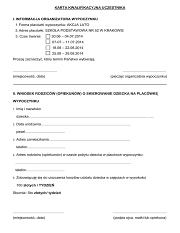 KARTA KWALIFIKACYJNA UCZESTNIKA I. INFORMACJA ORGANIZATORA WYPOCZYNKU 1. Forma placówki wypoczynku: AKCJA LATO 2. Adres placówki: SZKOŁA PODSTAWOWA NR 52 W KRAKOWIE 3. Czas trwania: 30.06 – 04.07.2014 07-07 – 11.07.2014 18.08 – 22.08.2014 25.08 – 29.08.2014 Proszę zaznaczyć, który termin Państwo wybierają. ............................................ (miejscowość, data) ........................................... (pieczęć organizatora wypoczynku) II. WNIOSEK RODZICÓW (OPIEKUNÓW) O SKIEROWANIE DZIECKA NA PLACÓWKĘ WYPOCZYNKU 1. Imię i nazwisko dziecka............................................................................................................................ 2. Data urodzenia......................................................................................... pesel........................................ 3. Adres zamieszkania................................................................................. telefon...................................... 4. Adres rodziców (opiekunów) w czasie pobytu dziecka w placówce wypoczynku: ................................................................................................................... telefon...................................... 5. Zobowiązuję się do uiszczenia kosztów udziału dziecka w zajęciach w wysokości 100 złotych / TYDZIEŃ Słownie: Sto złotych/ tydzień ................................................... ….................................................. (miejscowość, data) (podpis ojca, matki lub opiekuna) III. INFORMACJA RODZICÓW (OPIEKUNÓW) O STANIE ZDROWIA DZIECKA (np. na co dziecko jest uczulone, jak znosi jazdę samochodem, czy przyjmuje stale leki i w jakich dawkach, czy nosi aparat ortodontyczny lub okulary) ......................................................................................................................................................... ......................................................................................................................................................... ......................................................................................................................................................... ......................................................................................................................................................... .................................................................. STWIERDZAM, ŻE PODAŁAM (EM) WSZYSTKIE ZNANE MI INFORMACJE O DZIECKU, KTÓRE MOGĄ POMÓC W ZAPEWNIENIU WŁAŚCIWEJ OPIEKI W CZASIE POBYTU DZIECKA W PLACÓWCE WYPOCZYNKU. WYRAŻAM ZGODĘ NA ZABIEGI MEDYCZNE RATUJĄCE ZDROWIE I ŻYCIE MOJEGO DZIECKA. ................................................... ….................................................. (miejscowość, data) (podpis ojca, matki lub opiekuna) IV. INFORMACJA PIELĘGNIARKI O SZCZEPIENIACH lub przedstawienie książeczki zdrowia z aktualnym wpisem szczepień Szczepienia ochronne (podać rok): tężec................., błonica.................., dur.........................., inne ................. .......................................... (miejscowość, data) ......................................... (podpis pielęgniarki) Wyrażam zgodę na przetwarzanie danych osobowych zawartych w częściach II-V karty kwalifikacyjnej w zakresie niezbędnym dla bezpieczeństwa i ochrony zdrowia dziecka. ................................................... ….................................................. (miejscowość, data) (podpis ojca, matki lub opiekuna) ….................................................... (pieczątka organizatora)