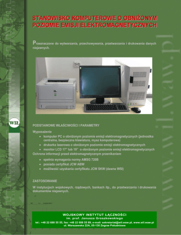 STANOWISKO KOMPUTEROWE O OBNIŻONYM POZIOMIE EMISJI ELEKTROMAGNETYCZNYCH P rzeznaczone do wytwarzania, przechowywania, przetwarzania i drukowania danych niejawnych. PODSTAWOWE WŁAŚCIWOŚCI I PARAMETRY Wyposażenie • komputer PC o obniżonym poziomie emisji elektromagnetycznych (jednostka centralna, bezpieczna klawiatura, mysz komputerowa) • drukarka laserowa o obniżonym poziomie emisji elektromagnetycznych • monitor LCD 17” lub 19” o obniżonym poziomie emisji elektromagnetycznych Ochrona informacji przed elektromagnetycznym przenikaniem • spełnia wymagania normy AMSG 720B • posiada certyfikat JCW ABW • możliwość uzyskania certyfikatu JCW SKW (dawne WSI) ZASTOSOWANIE W instytucjach wojskowych, rządowych, bankach itp., do przetwarzania i drukowania dokumentów niejawnych. WOJSKOWY INSTYTUT ŁĄCZNOŚCI im. prof. Janusza Groszkowskiego tel.: +48 22 688 55 55, fax: +48 22 688 55 89, e-mail: [email protected], www.wil.waw.pl ul. Warszawska 22A, 05-130 Zegrze Południowe