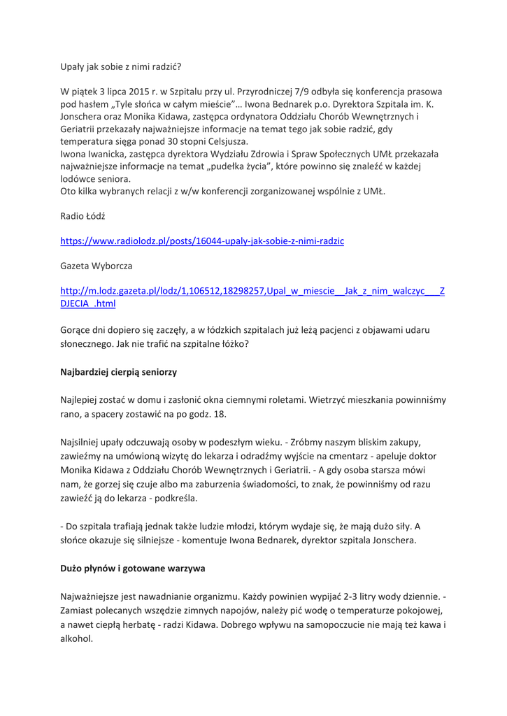 Upały jak sobie z nimi radzid? W piątek 3 lipca 2015 r. w Szpitalu przy ul. Przyrodniczej 7/9 odbyła się konferencja prasowa pod hasłem „Tyle słooca w całym mieście”… Iwona Bednarek p.o. Dyrektora Szpitala im. K. Jonschera oraz Monika Kidawa, zastępca ordynatora Oddziału Chorób Wewnętrznych i Geriatrii przekazały najważniejsze informacje na temat tego jak sobie radzid, gdy temperatura sięga ponad 30 stopni Celsjusza. Iwona Iwanicka, zastępca dyrektora Wydziału Zdrowia i Spraw Społecznych UMŁ przekazała najważniejsze informacje na temat „pudełka życia”, które powinno się znaleźd w każdej lodówce seniora. Oto kilka wybranych relacji z w/w konferencji zorganizowanej wspólnie z UMŁ. Radio Łódź https://www.radiolodz.pl/posts/16044-upaly-jak-sobie-z-nimi-radzic Gazeta Wyborcza http://m.lodz.gazeta.pl/lodz/1,106512,18298257,Upal_w_miescie__Jak_z_nim_walczyc___Z DJECIA_.html Gorące dni dopiero się zaczęły, a w łódzkich szpitalach już leżą pacjenci z objawami udaru słonecznego. Jak nie trafid na szpitalne łóżko? Najbardziej cierpią seniorzy Najlepiej zostad w domu i zasłonid okna ciemnymi roletami. Wietrzyd mieszkania powinniśmy rano, a spacery zostawid na po godz. 18. Najsilniej upały odczuwają osoby w podeszłym wieku. - Zróbmy naszym bliskim zakupy, zawieźmy na umówioną wizytę do lekarza i odradźmy wyjście na cmentarz - apeluje doktor Monika Kidawa z Oddziału Chorób Wewnętrznych i Geriatrii. - A gdy osoba starsza mówi nam, że gorzej się czuje albo ma zaburzenia świadomości, to znak, że powinniśmy od razu zawieźd ją do lekarza - podkreśla. - Do szpitala trafiają jednak także ludzie młodzi, którym wydaje się, że mają dużo siły. A słooce okazuje się silniejsze - komentuje Iwona Bednarek, dyrektor szpitala Jonschera. Dużo płynów i gotowane warzywa Najważniejsze jest nawadnianie organizmu. Każdy powinien wypijad 2-3 litry wody dziennie. Zamiast polecanych wszędzie zimnych napojów, należy pid wodę o temperaturze pokojowej, a nawet ciepłą herbatę - radzi Kidawa. Dobrego wpływu na samopoczucie nie mają też kawa i alkohol. Najlepszym sposobem na upały jest siesta w godzinach południowych, nieosiągalna dla większości z nas z powodu codziennych obowiązków. Warto wtedy zadbad o odpowiednią, lekkostrawną dietę. Kiełbaski z grilla trzeba zastąpid gotowanymi warzywami i mięsem. "Pudełko życia" Pomysłem zespołu ds. seniorów jest rozdawanie "Pudełek życia". - Ratownicy mogą w nich znaleźd wszystkie informacje o pacjencie, jego stanie zdrowia i przyjmowanych lekach informuje Iwona Bednarek. Starsze osoby wyczerpane upałem czasami nie są w stanie przekazad wszystkich informacji personelowi medycznemu. Wystarczy, że zostawią pudełko w lodówce, a na jej drzwiach przykleją naklejkę znajdującą się w środku opakowania. Pudełka dostępne są w 15 miejscach w Łodzi, m.in. w szpitalu im. Jonschera. http://lodz.tvp.pl/20715840/03072015-1830 TVP 3 Łódź Jak radzid sobie z upałami? Zalecenia lekarzy Data dodania: 2015-07-03 15:05:00 Ostatnia aktualizacja: 2015-07-03 15:53:37 Nad Polskę nadciągnęła fala upałów. W weekend temperatura powietrza może przekroczyd nawet 37 stopni Celsjusza!. Jak radzid sobie z wysokimi temperaturami? Wielu mieszkaoców regionu taka pogoda może cieszyd, głównie ze względu na planowany urlop. Są jednak tacy, którzy powinni unikad dłuższych pobytów na powietrzu, gdy słupek rtęci pokazuje chodby 30 kresek. Upały szczególnie odczuwają nie tylko osoby chorujące na ciśnienie czy serce, ale głównie mieszkaocy w podeszłym wieku. CZYTAJ: Do Polski zbliża się fala upałów. Prawie 40 stopni w ten weekend! – Zauważamy powtarzający się problem, gdy podnosi się temperatura, więcej osób starszych przyjmowanych jest na oddział z objawami udaru – przyznaje Iwona Bednarek, dyrektor szpitala im. reklama Karola Jonschera w Łodzi. Największy błąd, jaki popełniają osoby starsze to picie zbyt małej ilości płynów, zwłaszcza poza domem. Obawiają się bowiem problemów fizjologicznych. To błąd. – Dziennie należy wypid w takie dni ok 2 l wody, by nie doszło do zagęszczenia krwi i udaru – dodaje dyrektor Bednarek. Do zaleceo lekarzy powinny stosowad się nie tylko osoby starsze, ale także ich opiekunowie. – Podczas upałów seniorzy powinni zrezygnowad z prac na działkach i w ogrodzie. W takie dni najlepiej, gdy położą się w chłodnym pomieszczeniu ze szklanką wody w ręku – zaleca dr Monika Kidawa z Oddziału Chorób Wewnętrznych i Geriatrii szpitala im. K. Jonschera. – Osoby, które biorą leki, powinny przyjrzed się dokładnie ulotkom, bo często po zażyciu leku nie można wystawiad się na słooce - dodaje. Jeśli jednak wystąpią objawy sugerujące udar słoneczny, czyli zawroty głowy, mdłości, osłabienie czy przyspieszony rytm serca, należy położyd się w zacienionym miejscu i wykonad zimne okłady. A gdy ktoś straci przytomnośd, należy wezwad pogotowie. Czytaj więcej: http://www.dzienniklodzki.pl/artykul/3923585,jak-radzic-sobie-z-upalamizalecenia-lekarzy,id,t.html http://tvtoya.pl/news/show/10678,1