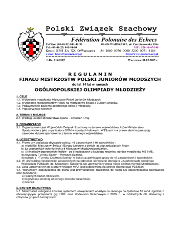 Polski Związek Szachowy Fédération Polonaise des Echecs Tel/ fax: (00-48-22) 841-41-92 Tel: (00-48-22) 841-94-60 00-454 WARSZAWA, ul. Czerniakowska 126a NIP : 526-16-67-148 Konto: BPH SA XX O/Warszawa 34 1060 0076 0000 3200 0071 8184 e-mail: [email protected] http://www.pzszach.org.pl ****************************************************************************** L.Dz. 214/2007 Warszawa, 31.03.2007 r. REGULAMIN FINAŁU MISTRZOSTW POLSKI JUNIORÓW MŁODSZYCH do lat 14 lat w ramach OGÓLNOPOLSKIEJ OLIMPIADY MŁODZIEŻY 1. CELE 1.1. Wyłonienie medalistów Mistrzostw Polski Juniorów Młodszych. 1.2. Wyłonienie reprezentantów Polski na mistrzostwa Świata i Europy juniorów. 1.3. Podwyższanie poziomu sportowego dzieci i młodzieży. 1.4. Popularyzacja szachów. 2. TERMIN I MIEJSCE 2.1. Według ustaleń Ministerstwa Sportu – kwiecień / maj 3. ORGANIZATOR 3.1. Organizatorem jest Wojewódzki Związek Szachowy na terenie województwa, które Ministerstwo Sportu wybiera jako organizatora OOM w sportach halowych. WZSzach ma prawo zlecić organizację zawodów klubowi sportowemu z terenu własnego województwa. 4. UCZESTNICTWO 4.1. Prawo gry posiadają obywatele polscy, 46 zawodniczek i 46 zawodników : a) medaliści Mistrzostw Świata i Europy juniorów z dwóch lat poprzedzających finały, b) 32 uczestników wyłonionych z 8 Mistrzostw Międzywojewódzkich, c) 10 finalistów poprzednich finałów - po 5 najlepszych z każdego rocznika, oprócz medalistów ME i MŚ, d) zwycięzcy Turnieju Kadry – Pierwsza Szansa, e) najlepsi z “Turnieju Ostatniej Szansy” w ilości uzupełniającej grupy do 46 zawodniczek i zawodników. 4.2. W przypadku nieobecności uprawnionych na odprawie technicznej decyzje o uzupełnieniach podejmuje Wiceprezes PZSzach. ds. Młodzieży i Szkolenia lub upoważniony przez niego członek Komisji Młodzieżowej. 4.3. Lista uprawnionych do startu w finałach MPJ jest publikowana na stronie internetowej PZSzach. 4.4. Warunkiem dopuszczenia do startu jest przynależność zawodnika do klubu lub stowarzyszenia sportowego oraz posiadanie: a) ważnych badań lekarskich, b) legitymacji szkolnej lub innego dowodu tożsamości, c) licencji. 5. SYSTEM ROZGRYWEK 5.1. Mistrzostwa rozegrane zostaną systemem szwajcarskim opartym na rankingu na dystansie 10 rund, zgodnie z obowiązującymi przepisami gry FIDE oraz Kodeksem Szachowym z 2005 r., w oddzielnych dla dziewcząt i chłopców grupach turniejowych. 6. TEMPO GRY: 90 min na 40 posunięć + 15 min. na dokończenie oraz 30 sekund za każde posunięcie od początku partii. 7. ZGŁOSZENIA 7.1. Potwierdzenia udziału zawodników na kartach zgłoszenia OOM (do pobrania ze strony http:\\13oomhala.pl) dokonują wojewódzkie związki szachowe na adres wskazany przez Organizatora listem poleconym lub mailem, najpóźniej na 14 dni przed rozpoczęciem zawodów. Jednostka delegująca podaje jednocześnie dane opiekuna każdego zawodnika. Zawodnik nie potwierdzony w ww. terminie zostaje skreślony z listy uczestników i zastąpiony kolejnym zawodnikiem z Turnieju Ostatniej Szansy. 8. FINANSOWANIE 8.1. Komitet Organizacyjny OOM ponosi koszty organizacyjne zawodów oraz pobytu zawodników i opiekunów wojewódzkich na mistrzostwach, w liczbie określonej regulaminem ogólnym OOM. 9. OCENA WYNIKÓW 9.1. Klasyfikacja końcowa finalistów ustalana jest z uwzględnieniem następujących, kolejno stosowanych kryteriów: - suma zdobytych punktów - wartościowanie średnie Buchholza, - wartościowanie pełne Buchholza, - ilość zwycięstw, - progresja, - ocena rankingowa wyniku, - wynik bezpośredniej partii między zainteresowanymi zawodnikami. 9.2. W wypadku braku rozstrzygnięcia na podstawie powyższych kryteriów o tytule mistrza Polski zadecyduje barażowy mecz lub mecz-turniej na zasadach ustalonych przez sędziego głównego; dalsze lokaty będą dzielone. 10. KLASYFIKACJE ZESPOŁOWE 10.1. Zgodnie z Regulaminem współzawodnictwa sportowego dzieci i młodzieży, wydanym w 2007 r. w każdej dyscyplinie sportu prowadzone są klasyfikacje zespołowe za poniższe kategorie wiekowe dla województw i klubów. Dla dyscypliny SZACHY w mistrzostwach Polski juniorów do 13-14 lat ustalono następującą siatkę punktową: Lok. 1 2 3 4-5 6-9 10-15 16-23 24-32 Suma Pkt. 9 7 6 5 4 3 2 1 91 10.2. Obliczenia wykonuje Sędzia Główny zawodów i przesyła ich wyniki do weryfikacji przez Komisję Młodzieżową PZSzach, przekazującą je następnie do Działu Analiz PFSM 00-449 Warszawa, ul. Łazienkowska 6a, fax 022 52989-34, e-mail: [email protected]. 11. NAGRODY I WYRÓŻNIENIA 11.1. Zwycięzca ma prawo startu w mistrzostwach świata juniorów, a drugi w mistrzostwach Europy. 11.2. Zwycięzcy turniejów zdobywają tytuły mistrzów Polski juniorów. Zawodnicy, którzy zajmą miejsca 1-3 otrzymują medale, a za miejsca 1-6 dyplomy. Nagrody i upominki dla czołowych uczestników mistrzostw funduje Organizator. 11.3. Po 5 najlepszych zawodników z każdego rocznika uzyskuje prawo startu bezpośrednio w finałach mistrzostw Polski juniorów w roku następnym. 11.4. Finaliści MPJ , którzy uzyskają: - 5,0 pkt. (50 %) - roczniki starsze w grupie, - 4,0 pkt. (40 %) - roczniki młodsze w grupie, zdobywają prawo startu bezpośrednio w eliminacjach międzywojewódzkich do finałów mistrzostw Polski juniorów na rok następny. 12. SĘDZIOWANIE 12.1. Finały MPJ prowadzi sędzia główny posiadający co najmniej klasę państwową, przy pomocy sędziów asystentów. Wszyscy sędziowie muszą posiadać aktualne licencje sędziowskie. 12.2. Decyzje sędziego głównego są w trakcie rozgrywania finałów ostateczne. Zawodnikowi przysługuje prawo odwołania się do Kolegium Sędziów PZSzach w ciągu 3 dni po zakończeniu zawodów. 12.3. Sędzia główny ma obowiązek wysłać w ciągu 7 dni po zawodach sprawozdanie w formie elektronicznej (mailem, na dyskietce lub płycie cd) do Przewodniczącego Komisji Klasyfikacji i Rankingu. 12.4. Sprawozdanie winno zaw