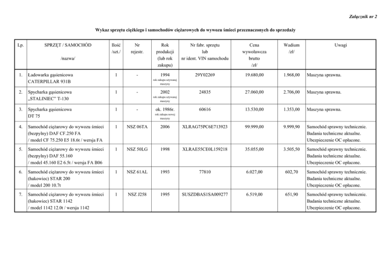 Załącznik nr 2 Wykaz sprzętu ciężkiego i samochodów ciężarowych do wywozu śmieci przeznaczonych do sprzedaży Lp. SPRZĘT / SAMOCHÓD Ilość /szt./ Nr rejestr. Rok produkcji (lub rok zakupu) Nr fabr. sprzętu lub nr ident. VIN samochodu Cena wywoławcza brutto /zł/ Wadium /zł/ Ładowarka gąsienicowa CATERPILLAR 931B 1 - 1994 29Y02269 19.680,00 1.968,00 Maszyna sprawna. Spycharka gąsienicowa „STALINIEC” T-130 1 24835 27.060,00 2.706,00 Maszyna sprawna. Spycharka gąsienicowa DT 75 1 60616 13.530,00 1.353,00 Maszyna sprawna. 4. Samochód ciężarowy do wywozu śmieci (bezpylny) DAF CF.250 FA / model CF 75.250 E5 18.6t / wersja FA 1 NSZ 06TA 2006 XLRAG75PC6E713923 99.999,00 9.999,90 Samochód sprawny technicznie. Badania techniczne aktualne. Ubezpieczenie OC opłacone. 5. Samochód ciężarowy do wywozu śmieci (bezpylny) DAF 55.160 / model 45.160 E2 6.5t / wersja FA B06 1 NSZ 50LG 1998 XLRAE55CE0L159218 35.055,00 3.505,50 Samochód sprawny technicznie. Badania techniczne aktualne. Ubezpieczenie OC opłacone. 6. Samochód ciężarowy do wywozu śmieci (hakowiec) STAR 200 / model 200 10.7t 1 NSZ 61AL 1993 77810 6.027,00 602,70 Samochód sprawny technicznie. Badania techniczne aktualne. Ubezpieczenie OC opłacone. 7. Samochód ciężarowy do wywozu śmieci (hakowiec) STAR 1142 / model 1142 12.0t / wersja 1142 1 NSZ J258 1995 SUSZDBAS1SA009277 6.519,00 651,90 Samochód sprawny technicznie. Badania techniczne aktualne. Ubezpieczenie OC opłacone. /nazwa/ 1. 2. 3. Uwagi rok zakupu używanej maszyny - 2002 rok zakupu używanej maszyny - ok. 1986r. rok zakupu nowej maszyny