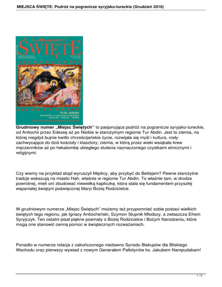 MIEJSCA ŚWIĘTE: Podróż na pogranicze syryjsko-tureckie (Grudzień 2010) Grudniowy numer „Miejsc Świętych” to pasjonująca podróż na pogranicze syryjsko-tureckie, od Antiochii przez Edessę aż po Nisibis w starożytnym regionie Tur Abdin. Jest to ziemia, na której niegdyś bujnie kwitło chrześcijańskie życie, rozwijała się myśl i kultura, rosły zachwycające do dziś kościoły i klasztory; ziemia, w którą przez wieki wsiąkała krew męczenników aż po hekatombę ubiegłego stulecia naznaczonego czystkami etnicznymi i religijnymi. Czy wiemy na przykład skąd wyruszyli Mędrcy, aby przybyć do Betlejem? Pewne starożytne tradcje wskazują na miasto Hah, właśnie w regionie Tur Abdin. To właśnie tam, w drodze powrotnej, mieli oni zbudować niewielką kapliczkę, która stała się fundamentem przyszłej wspaniałej świątyni poświęconej Maryi Bożej Rodzicielce. W grudniowym numerze „Miejsc Świętych” możemy też przypomnieć sobie postaci wielkich świętych tego regionu, jak Ignacy Antiocheński, Szymon Słupnik Młodszy, a zwłaszcza Efrem Syryjczyk. Ten ostatni pisał piękne poematy o Bożej Rodzicielce i Bożym Narodzeniu, które mogą one stanowić cenną pomoc w świątecznych rozważaniach. Ponadto w numerze relacja z zakończonego niedawno Synodu Biskupów dla Bliskiego Wschodu oraz pierwszy wywiad z nowym Generałem Pallotynów ks. Jakubem Nampudakam! 1/2 MIEJSCA ŚWIĘTE: Podróż na pogranicze syryjsko-tureckie (Grudzień 2010) Zapraszając do lektury grudniowego numeru „Miejsc Świętych”, jednocześnie gorąco zachęcam do prenumeraty miesięcznika na rok 2011. Dla prenumeratorów przygotowano specjalny konkurs, którego główną nagrodą (pośród 100 innych) jest 9-dniowa pielgrzymka do Ziemi Świętej! Ks. Mirosław Mejzner SAC (redaktor naczelny „Miejsc Świętych”) Szczegóły na: www.miejscaswiete.pl . 2/2