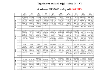 Tygodniowy rozkład zajęć – klasy IV – VI CZWARTEK ŚRODA WTOREK PONIEDZIAŁEK rok szkolny 2015/2016 ważny od 01.09.2015r. 1 2 3 4 5 6 7 8 9 1 2 3 4 5 6 7 8 9 1 2 3 4 5 6 7 8 9 1 2 3 4 5 6 7 8 IVa Barbara Woźnicka IVb Irena Kalkowska Joanna Guzowska IV d Ewa Tomaszewska Va Ewa Rycharska Vb Małgorzata Tyburska Vc Monika Wojciechowska w-f dz/ch B w-f dz/ch B mat. 109 j. pol. 117 j. ang. 113 rel. 117 w-f dz B w-f dz B przyr. 108 mat. 14 j. pol. 105 w-f ch. B w-f ch. B w-f dz B w-f dz B przyr. 107 j. pol. 113 mat. 14 w-f ch. B w-f ch. B w-f dz/ch B w-f dz/ch B g. wych.202 przyr. 107 j. pol. 202 j. ang. 113 inf. g.1 202 przyr. 107 j. ang. 113 tech. 108 j. pol. 104 mat. I 109 j. ang. 14 g. wych. 117 j. pol. 117 mat. 202 przyr. 107 tech. 108 przyr. 107 g. wych. 202 j. ang. 14 mat. 109 tech. 108 j. pol. 105 j. pol. 105 j.an.g.1 113 j. pol. 105 mat. 109 plast. 110 g.wych. 105 hist. 104 plast. 110 mat. 109 j. pol. 117 w-f dz/ch B hist. 104 w-f dz/ch B tech. 108 plast. 110 j. pol. 104 j. ang. 113 przyr. 108 mat. 14 g.wych.108 tech. 108 rel. 117 plast. 110 j. ang. 113 j. pol. 105 mat. 14 g. wych.105 j. pol. 105 mat. 109 przyr. 202 inf. dz. 202 rel. 117 przyr. 107 j. pol. 108 mat. 14 j. ang. 113 mat. 109 g. wych. 109 j. pol. 14 rel. 117 hist. 104 w-f dz/ch B w-f dz/ch B w-f dz/ch B w-f dz/ch B j. pol. 104 mat. 107 rel. 117 inf. g.1 202 w-f dz/ch B w-f dz/ch B rel. 117 j. pol. 105 muz. 110 hist. 104 inf. g.1 202 inf. g.1 202 j. pol. 104 w-f ch. j. ang. 14 muz. 110 w-f ch./indz przyr. 107 w-f dz/ch j. pol. 105 j. pol. 104 w-f dz/ch mat. 109 mat. 109 przyr. 108 przyr. 107 rel. 117 mat. 109 j. ang. 113 g. wych.109 j.an.g.2 113 tech. 108 w-f dz w-f dz przyr. 108 j. pol. 202 inf. 202 mat. 109 w-f dz w-f dz j. ang. 113 mat. 117 j. pol. 105 w-f dz w-f dz/in ch j. pol. 105 tech. 108 j. ang. 113 w-f ch./inf.dz. w-f ch. w-f ch. w-f ch. w-f dz w-f dz mat. 202 j. pol. 105 tech. 108 j. ang. 113 inf. g.2 202 j. pol. 110 przyr. 107 j. ang. 113 mat. 109 plast. 110 j. pol. 104 j. pol. 104 hist. 104 mat. 14 plast. 110 j. ang. 14 plast. 110 mat. 109 mat. 109 j. pol. 113 rel. 217 w-f dz/ch w-f dz/ch muz. 110 rel. 117 tech. 108 inf. chł.202 j. pol. 105 mat. 109 j. pol. 104 w-f ch. w-f ch. przyr. 108 muz. 110 j. ang. 113 rel. 117 IVc plast. 110 mat. 109 hist. 117 j. ang. 113 j. pol. 105 rel. 117 j. pol. 14 rel. 117 w-f ch. w-f ch. VI a Marta Sochocka VI b Elżbieta Kamińska VI c Elżbieta Szczepańska mat. 109 muz. 110 hist. 104 j. pol. 105 plast. 110 w-f dz B w-f dz B rel. 117 j. ang. 14 mat. 109 przyr. 107 j. pol. 107 inf. g.2 202 mat. 109 j. ang. 14 rel. 117 muz. 110 hist. 104 j. pol. 105 WDŻ 117 j.an.g.2 113 j. pol. 105 mat. 109 j. pol. 105 j. pol. 110 mat. 109 hist. 104 przyr. 107 rel. 117 WDŻ 14 WDŻ 117 hist. 104 j.an.g.1 14 g. wych.113 j. pol.in.104 j. pol. 104 przyr. 107 j. pol. 105 j. pol. 105 plast. 110 . inf. g.2 202 tech. 108 j. ang. 14 w-f dz/ch B w-f dz/ch B j. pol. 104 przyr. 107 rel. 107 mat. 202 muz. 110 mat. 14 j. ang. 14 mat. 117 przyr. 107 przyr. 107 mat. 109 j. pol. 105 j. pol. 104 przyr. 108 mat. 109 j. pol. 105 j. ang. 113 w-f ch. B w-f ch. B PIĄTEK 9 1 2 3 4 5 6 7 j. ang. 113 muz. 110 hist. 104 j. pol. 117 przyr. 108 hist. 104 j. pol. 105 g.wych. 105 przyr. 108 mat. 109 muz. 110 mat. 108 przyr. 108 j. ang. 113 j. pol. 105 rel. 110 inf. g.1 202 hist. 104 muz. 110 mat. 109 przyr. 107 j. pol. 105 inf. g.2 202 mat. 108 j. ang. 113 przyr. 107 j. pol. 104 j. pol. 104 j. pol. 107 przyr. 107 w-f dz/ch w-f dz/ch rel. 117 inf. g.2 202 j. pol. 105 mat. 109 w-f dz/ch w-f dz/ch j. ang. 14 w-f dz/ch w-f dz/ch j. pol. 110 przyr. 107 mat. 110 mat. 109 w-f dz rel. 117 w-f dz/infch j. pol. 117 mat. 109 j. ang14/inf j. pol. 110 inf/j.ang213 j. ang. 113 przyr. 108 rel. 117