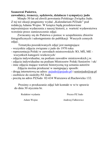Szanowni Państwo, zawodnicy, trenerzy, sędziowie, działacze i sympatycy judo Minęło 50 lat od chwili powstania Polskiego Związku Judo. Z tej teŜ okazji pragniemy wydać „Kalendarium PZJudo” pod redakcją Adama Wojno. W ksiąŜce będą przedstawione najwaŜniejsze wydarzenia z naszej historii, a wartość wydawnictwa wzrośnie przez zamieszczenie zdjęć. Zwracamy się do Państwa o pomoc w uzupełnieniu zbiorów fotograficznych i udostępnienie do publikacji Waszych cennych zdjęć. Tematyka poszukiwanych zdjęć jest następująca: - wszystkie zdjęcia związane z judo do 1970 roku - reprezentacja Polski w zawodach mistrzowskich /IO, MŚ, ME wszystkich kategorii wiekowych/ - zdjęcia indywidualne, na podium zawodów mistrzowskich j.w. - zdjęcia indywidualne na podium Mistrzostw Polski Seniorów /-ek/ - inne zdjęcia mające wartość historyczną wg uznania autorów Zdjęcia moŜna przekazać w następujący sposób: - drogą internetową na adres: [email protected] i [email protected] - osobiście do siedziby PZ Judo - pocztą na adres PZJudo 02-634 Warszawa ul.Racławicka 132. Prosimy o przekazanie zdjęć lub kontakt w w/w sprawie do dnia 30 stycznia br. Redaktor wydania Adam Wojno Prezes PZ Judo Andrzej Falkiewicz