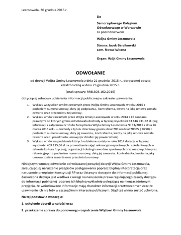 Lesznowola, 30 grudnia 2015 r. Do Samorządowego Kolegium Odwoławczego w Warszawie za pośrednictwem Wójta Gminy Lesznowola Strona: Jacek Barcikowski zam. Nowa Iwiczna Organ: Wójt Gminy Lesznowola ODWOŁANIE od decyzji Wójta Gminy Lesznowola z dnia 21 grudnia 2015 r., doręczonej pocztą elektroniczną w dniu 23 grudnia 2015 r. (znak sprawy: RRB.303.162.2015) dotyczącej odmowy udzielenia informacji publicznej w zakresie ujawnienia: 1. Wykazu wszystkich umów zawartych przez Wójta Gminy Lesznowola w roku 2015 z podaniem numeru umowy, daty jej podpisania, kontrahenta, kwoty na jaką umowa została zawarta oraz przedmiotu tej umowy. 2. Wykazu umów zawartych przez Wójta Gminy Lesznowola w roku 2014 z 16 osobami prawnymi od których gmina odnotowała dochody w łącznej wysokości 63 616 931,52 zł. (wg informacji z załącznika nr 13 do Zarządzenia Wójta Gminy Lesznowola Nr 33/2015 z dnia 26 marca 2015 roku – dochody z tytułu dzierżawy gruntu dział 700 rozdział 70005 § 0750) z podaniem numeru umowy, daty jej zawarcia, kontrahenta, kwoty na jaką umowa została zawarta oraz i przedmiotu umowy (nr działki i jej powierzchnia). 3. Wykazu umów na podstawie których udzielone zostały w roku 2014 dotacje w łącznej wysokości 409 115,06 zł na prowadzenie zajęć rekreacyjno-sportowych i szkoleniowych w zakresie kultury fizycznej, organizacji i obsługi zawodów sportowych oraz masowych imprez rekreacyjnych z podaniem numeru umowy, daty jej zawarcia, kontrahenta, kwoty na jaką umowa została zawarta oraz przedmiotu umowy. Niniejszym wnoszę odwołanie od wskazanej powyżej decyzji Wójta Gminy Lesznowola, zarzucając jej naruszenie przepisów postępowania poprzez błędną interpretację oraz naruszenie przepisów Konstytucji RP oraz Ustawy o dostępie do informacji publicznej. Zaskarżona decyzja jest wadliwa z uwagi na naruszenie prawa regulującego zasady dostępu do informacji publicznej poprzez ich błędną wykładnię polegającą na nieuzasadnionym przyjęciu, że wnioskowane informacje mają charakter informacji przetworzonych oraz że ujawnienie ich nie leży w szczególnym interesie publicznym. Stąd też winna zostać uchylona. Na tej podstawie wnoszę o: 1. uchylenie decyzji w całości oraz 2. przekazanie sprawy do ponownego rozpatrzenia Wójtowi Gminy Lesznowola. UZASADNIENIE W dniu 17 listopada 2015 roku złożyłem do Urzędu Gminy Lesznowola za pośrednictwem systemu ePUAP wniosek o udzielenie informacji publicznej (załącznik nr 1). W dniu 1 grudnia 2015 roku otrzymałem od organu pismo datowane na ten sam dzień wzywające mnie do uzasadnienia, że żądane przeze mnie informacje są szczególnie istotne dla interesu publicznego ( załącznik nr 2), przy czym organ nie uzasadnił w tym piśmie mimo ciążącego na nim obowiązku ustawowego dlaczego wnioskowane przeze mnie informacje mają jego zdaniem charakter informacji przetworzonej. W dniu 6 grudnia 2015 r. za pośrednictwem systemu ePUAP przesłałem odpowiedź na to żądanie (załącznik nr 3), w którym na podstawie przywołanych orzeczeń Sądów Administracyjnych wykazałem, że informacje, o które prosiłem we wniosku nie mogą być traktowane jako informacje przetworzone, a także dodatkowo uzasadniłem (z ostrożności procesowej), dlaczego ich ujawnienie jest szczególnie istotne dla interesu publicznego. W dniu 23 grudnia 2015 roku pocztą elektroniczną otrzymałem decyzję odmowną gminy (załącznik nr 4) w stosunku do trzech pierwszych punktów mojego wniosku o udzielenie informacji publicznej. W uzasadnieniu decyzji odmownej organ stwierdza, iż wnioskowane przeze mnie informacje nie mogą być ujawnione, gdyż mają charakter informacji przetworzonych. Jednocześnie organ nie uzasadnił, dlaczego uważa, iż ujawnienie ich jego zdaniem nie leży w szczególnym interesie publicznym (do czego zobowiązywało go prawo). Swoje stanowisko organ uzasadnił powołując się na szereg orzeczeń Sądów Administracyjnych. Jednoczenie 22 grudnia 2015 roku otrzymałem od organu pismo stojące w sprzeczności z jego decyzją odmowną, częścią którego był wykaz umów o który wnioskowałem w punkcie 3 swojego wniosku (załącznik nr 5). W uzasadnieniu przedmiotowej decyzji odmownej organ udowadnia, że nie może przesłać przesłanego mi wykazu ze względu na to, że go nie posiada ! W uzasadnieniu do swojej decyzji odmownej organ wskazał szereg orzeczeń, które w jego mniemaniu mają uzasadniać, iż żądane przeze mnie wykazy umów są informacją przetworzoną, w tym m.in. orzeczenie WSA w Olsztynie z 6 września 2011 roku, II SA/Ol 435/11. W orzeczeniu tym czytamy o tym, jakie kryteria winien wypełniać zabieg przetworzenia informacji publicznej: „Zabieg ten wymaga dokonania, stosownych działań takich jak analizy, obliczenia, zestawienia, podsumowania, które połączone są z zaangażowaniem intelektualnym”. Powyższe orzeczenie wbrew stanowisku organu potwierdza jedynie, że zestawienia umów o które wystąpiłem w swoim wniosku nie są informacjami przetworzonymi, gdyż przedstawienie ich wymaga jedynie bardzo prostego zestawienia, a nie wymaga dokonywania żadnych analiz, podsumowań a tym bardziej żadnego zaangażowania intelektualnego” Kolejnym orzeczeniem na które powołuje się organ to wyrok WSA w Poznaniu z 23 stycznia 2014 roku II SAB/Po 123/13, LEX nr 1422299. Czytamy w nim że: „Informacja będzie miała charakter informacji przetworzonej w sytuacji, gdy jej udostępnienie co do zasady wymaga dokonania stosownych analiz, obliczeń, zestawień statystycznych, itp. połączonych z zaangażowaniem w ich pozyskanie określonych środków osobowych i finansowych”. Przedstawienie wnioskowanych wykazów umów nie wymaga dokonania żadnych analiz, obliczeń czy też zestawień statystycznych. W przypadku punktu 2 wniosku chodzi o wykaz kilku danych jedynie z 16 umów zawartych z osobami prawnymi a więc o wykonanie bardzo prostego i mało czasochłonnego zestawie