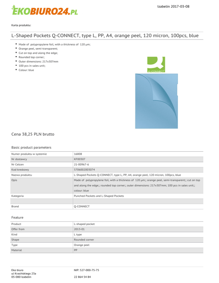 Izabelin 2017-03-08 Karta produktu: L-Shaped Pockets Q-CONNECT, type L, PP, A4, orange peel, 120 micron, 100pcs, blue Made of polypropylene foil, with a thickness of 120 µm; Orange peel, semi-transparent; Cut on top and along the edge; Rounded top corner; Outer dimensions: 217x307mm 100 pcs in sales unit; Colour: blue Cena 38,25 PLN brutto Basic product parameters Numer produktu w systemie 16808 Nr dostawcy KF00307 Nr Celcen 21-00967-6 Kod kreskowy 5706002003074 Nazwa produktu L-Shaped Pockets Q-CONNECT, type L, PP, A4, orange peel, 120 micron, 100pcs, blue Opis Made of polypropylene foil, with a thickness of 120 µm;; orange peel, semi-transparent;; cut on top and along the edge;; rounded top corner;; outer dimensions: 217x307mm; 100 pcs in sales unit;; colour: blue Kategoria Punched Pockets and L-Shaped Pockets Brand Q-CONNECT Feature Product L-shaped pocket Offer from 2013-01 Kind L type Shape Rounded corner Type Orange peel Material PP Eko biuro ul Krasińskiego 23a 05-080 Izabelin NIP: 527-000-75-75 22 864 54 84 Izabelin 2017-03-08 Karta katalogowa produktu cd. L-Shaped Pockets Q-CONNECT, type L, PP, A4, orange peel, 120 micron, 100pcs, blue Dimensions Format A4 Thickness (mm) 120 Dimensions (mm) 217x307 Amount Number of punches N.a. Procurement vocabulary CPV 30192500-6 Okładki przezroczyste Certifications Hit Hit New product Standard Colour Colour Blue Serdecznie zapraszamy do współpracy Eko biuro zespół. Eko biuro ul Krasińskiego 23a 05-080 Izabelin NIP: 527-000-75-75 22 864 54 84