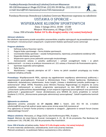 Fundacja Rozwoju Demokracji Lokalnej Centrum Mazowsze zaprasza na szkolenie: USTAWA O SPORCIE – WSPIERANIE KLUBÓW SPORTOWYCH Data: 3 lutego 2012, 10:00 - 15:00 Miejsce: Warszawa, ul. Długa 23/25 Cena: 350 zł brutto Rabat 10 % dla drugiej osoby z tej samej Instytucji Adresaci szkolenia: Na szkolenie zapraszamy przede wszystkim pracowników urzędów zajmujących się prowadzeniem spraw formalnych i merytorycznych związanych z wspieraniem klubów sportowych przez samorząd. Program szkolenia: 1. Definicja kultury fizycznej i sportu. 2. Pojęcie klubu sportowego – formy klubów sportowych. 3. Uczniowskie kluby sportowe – zasady funkcjonowania, rejestracji, prowadzenie ewidencji UKS. 4. Stypendia klubów sportowych. 5. Wspieranie sportu przez jednostki samorządu terytorialnego. 6. Zastosowanie ustawy o pożytku publicznym i uchwał szczególnych kiedy i w jakich okolicznościach – co znaczy w praktyce stosowanie art. 221 ustawy o finansach do finansowania sportu. 7. Sportowe stypendia samorządowe. 8. Rady Sportu. 9. Wyróżnienia i nagrody pieniężne od JST – komu na jakich zasadach przysługują czy trzeba wydawad odrębną uchwałę Prowadzący: Współpracownik FRDL, zajmuje się zagadnieniami współpracy administracji publicznej z organizacjami pozarządowymi. Pracował w Ministerstwie Pracy i Polityki Społecznej. Wykładowca akademicki, doświadczony szkoleniowiec. Autor książki „Ustawa o działalności pożytku publicznego i o wolontariacie” (Wyd. DIFIN). Powołany przez Ministra Rozwoju Regionalnego na eksperta do oceny projektów realizowanych w ramach programów operacyjnych na lata 2007-2013 w dziedzinie „Umacnianie społeczeostwa obywatelskiego, w tym wsparcie organizacji pozarządowych oraz partnerów społecznych i gospodarczych”. Asesor akredytowany przy MSWiA do oceny projektów w ramach Działania 5.2 PO KL „Wzmocnienie potencjału administracji samorządowej”. Szkolił inspektorów kontroli RIO. Zgłoszenie na szkolenie Zgłoszenia prosimy przesyład do 27 stycznia 2012 r. faxem. (22) 351 93 10, e-mailem [email protected] lub wybrad opcje zapisu przez stronę www.frdl.mazowsze.pl Przy zgłoszeniu w ramach Forów prosimy o wpisanie w uwagach: „Zgłoszenie w ramach Forum (nazwa odpowiedniego Forum)”. Miejsce szkolenia: Warszawa, ul. Długa 23/25, Sala Konferencyjna FRDL, III piętro. Dojazd: Metrem do stacji Ratusz Arsenał, tramwajami 4, 15, 18, 35 do przystanku Plac Bankowy lub autobusami 116, 178,180, 222, 503 do przystanku Plac Krasioskich. Cena: 350 zł brutto od jednej osoby. Rabat 10 % dla drugiej osoby z tej samej Instytucji. W cenie materiały szkoleniowe, zaświadczenie, lunch oraz przerwy kawowe. Płatnośd przelewem, na podstawie faktury wystawionej w dniu szkolenia. ZGŁOSZENIE USTAWA O SPORCIE – WSPIERANIE KLUBÓW SPORTOWYCH Data: 3 lutego 2012, 10:00 - 15:00 Miejsce: Warszawa, ul. Długa 23/25 Cena: 350 zł brutto Rabat 10 % dla drugiej osoby z tej samej Instytucji Instytucja: ........................................................................................................................... Adres: ................................................................................................................................. NIP:..................................................................................................................................... L.p. Imię i nazwisko Wydział tel. e-mail 1. ........................................................................................................................................ 2. ........................................................................................................................................ 3. ........................................................................................................................................ ........................................................... podpis i pieczątka osoby delegującej O wpisaniu na listę decyduje termin zgłoszenia – 27 stycznia 2012 r. Ewentualną rezygnację ze szkolenia można zgłosid najpóźniej na dwa dni przed szkoleniem. W przypadku niewykorzystania zgłoszonego uczestnictwa - Urząd będzie zobowiązany do sfinansowania 60% odpłatności za uczestnictwo i materiały. FRDL zastrzega sobie prawo odwołania szkolenia.