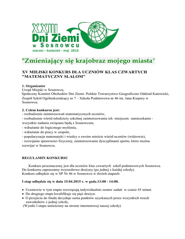"Zmieniający się krajobraz mojego miasta" XV MIEJSKI KONKURS DLA UCZNIÓW KLAS CZWARTYCH "MATEMATYCZNY SLALOM" 1. Organizator Urząd Miejski w Sosnowcu, Społeczny Komitet Obchodów Dni Ziemi. Polskie Towarzystwo Geograficzne Oddział Katowicki, Zespół Szkół Ogólnokształcący nr 7 – Szkoła Podstawowa nr 46 im. Jana Kiepury w Sosnowcu. 2. Celem konkursu jest: - rozbudzenie zainteresowań matematycznych uczniów, - rozbudzenie wśród młodzieży szkolnej zainteresowania ich miejscem zamieszkania wszystkie zadania związane będą z Sosnowcem, - wdrażanie do logicznego myślenia, - wdrażanie do pracy w zespole, - popularyzacja matematyki i wiedzy o swoim mieście wśród uczniów (widzowie), - rozwijanie sprawności fizycznej, zainteresowanie dyscyplinami sportu, które można rozwijać w Sosnowcu. REGULAMIN KONKURSU Konkurs przeznaczony jest dla uczniów klas czwartych szkół podstawowych Sosnowca. Do konkursu zapraszamy trzyosobowe drużyny (po jednej z każdej szkoły). Konkurs odbędzie się w SP Nr 46 w Sosnowcu w dwóch etapach: I etap odbędzie się w dniu 15.04.2015 r. w godz.13:00 - 14:00. Uczniowie w tym etapie rozwiązują indywidualnie zestaw zadań w czasie 45 minut. Do drugiego etapu kwalifikuje się pięć drużyn. O przejściu do finału decyduje suma punktów uzyskanych przez wszystkich trzech zawodników z jednej szkoły. (Wyniki I etapu umieścimy na stronie internetowej naszej szkoły) II etap odbędzie się w terminie 8.05.2015 r. II etap to konkurencje sportowe połączone z drużynowym rozwiązywaniem zadań matematycznych. Obowiązuje strój sportowy i zmienne obuwie sportowe. Każda drużyna może zabrać kilkuosobową publiczność dopingującą ją do sportowej rywalizacji. Zgłoszenia wraz z imienną listą uczestników oraz nauczycieli przygotowujących uczniów do konkursu proszę przesłać w terminie do 8.04.2015 r. na adres szkoły: ZSO Nr 7, SP Nr 46 im.J.Kiepury w Sosnowcu Sosnowiec, ul.Gwiezdna 2 tel./fax. 032 263 35 53, 032 263 50 74 e-mail:[email protected] W zgłoszeniu prosimy podać: - nazwę i adres szkoły, - imiona i nazwiska uczniów oraz nauczycieli przygotowujących uczniów do konkursu. Wszyscy uczestnicy II etapu konkursu otrzymają dyplomy, I, II, III miejsce - nagrody, natomiast nauczyciele – opiekunowie podziękowania za przygotowanie uczniów. Zakres materiału: - działania pamięciowe w zbiorze liczb naturalnych, - kalendarz, - cechy podzielności, - kolejność wykonywania działań, - działania pisemne w zbiorze liczb naturalnych, - cyfry rzymskie ( również L, C, D, M), - podstawowe figury geometryczne, - obwód wielokąta, - jednostki długości, - skala. SERDECZNIE ZAPRASZAMY! Organizatorzy: Elżbieta Czarnecka i Małgorzata Wiórkowska - nauczycielki matematyki, Tomasz Łyczek, Agata Skowrońska - nauczyciele wychowania fizycznego
