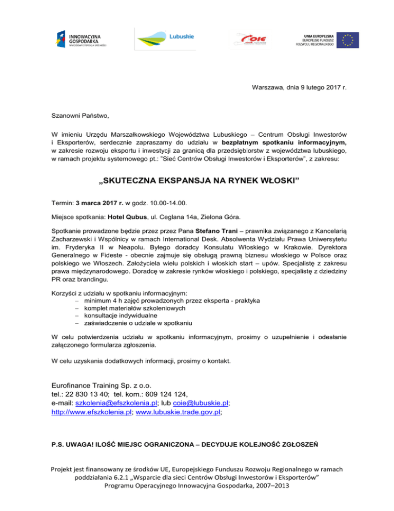 Warszawa, dnia 9 lutego 2017 r. Szanowni Państwo, W imieniu Urzędu Marszałkowskiego Województwa Lubuskiego – Centrum Obsługi Inwestorów i Eksporterów, serdecznie zapraszamy do udziału w bezpłatnym spotkaniu informacyjnym, w zakresie rozwoju eksportu i inwestycji za granicą dla przedsiębiorstw z województwa lubuskiego, w ramach projektu systemowego pt.: ”Sieć Centrów Obsługi Inwestorów i Eksporterów”, z zakresu: „SKUTECZNA EKSPANSJA NA RYNEK WŁOSKI” Termin: 3 marca 2017 r. w godz. 10.00-14.00. Miejsce spotkania: Hotel Qubus, ul. Ceglana 14a, Zielona Góra. Spotkanie prowadzone będzie przez przez Pana Stefano Trani – prawnika związanego z Kancelarią Zacharzewski i Wspólnicy w ramach International Desk. Absolwenta Wydziału Prawa Uniwersytetu im. Fryderyka II w Neapolu. Byłego doradcy Konsulatu Włoskiego w Krakowie. Dyrektora Generalnego w Fideste - obecnie zajmuje się obsługą prawną biznesu włoskiego w Polsce oraz polskiego we Włoszech. Założyciela wielu polskich i włoskich start – upów. Specjalistę z zakresu prawa międzynarodowego. Doradcę w zakresie rynków włoskiego i polskiego, specjalistę z dziedziny PR oraz brandingu. Korzyści z udziału w spotkaniu informacyjnym: minimum 4 h zajęć prowadzonych przez eksperta - praktyka komplet materiałów szkoleniowych konsultacje indywidualne zaświadczenie o udziale w spotkaniu W celu potwierdzenia udziału w spotkaniu informacyjnym, prosimy o uzupełnienie i odesłanie załączonego formularza zgłoszenia. W celu uzyskania dodatkowych informacji, prosimy o kontakt. Eurofinance Training Sp. z o.o. tel.: 22 830 13 40; tel. kom.: 609 124 124, e-mail: [email protected]; lub [email protected]; http://www.efszkolenia.pl; www.lubuskie.trade.gov.pl; P.S. UWAGA! ILOŚĆ MIEJSC OGRANICZONA – DECYDUJE KOLEJNOŚĆ ZGŁOSZEŃ Projekt jest finansowany ze środków UE, Europejskiego Funduszu Rozwoju Regionalnego w ramach poddziałania 6.2.1 „Wsparcie dla sieci Centrów Obsługi Inwestorów i Eksporterów” Programu Operacyjnego Innowacyjna Gospodarka, 2007–2013