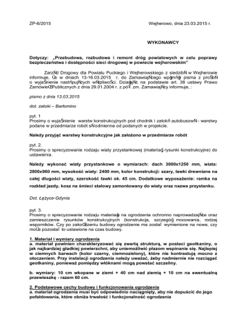 ZP-6/2015 Wejherowo, dnia 23.03.2015 r. WYKONAWCY Dotyczy: „Przebudowa, rozbudowa i remont dróg powiatowych w celu poprawy bezpieczeństwa i dostępności sieci drogowej w powiecie wejherowskim” Zarząd Drogowy dla Powiatu Puckiego i Wejherowskiego z siedzibą w Wejherowie informuje, że w dniach 13-16.03.2015 r. do Zamawiającego wpłynęły pisma z prośbą o wyjaśnienie następujących wątpliwości. Działając na podstawie art. 38 ustawy Prawo Zamówień Publicznych z dnia 29.01.2004 r. z póź. zm. Zamawiający informuje, : pismo z dnia 13.03.2015 dot. zatoki – Barłomino pyt. 1 Prosimy o wyjaśnienie warstw konstrukcyjnych pod chodnik i zatokę autobusową - warstwy podane w przedmiarze robót są odmienne od podanych w projekcie. Należy przyjąć warstwy konstrukcyjne jak założono w przedmiarze robót pyt. 2. Prosimy o sprecyzowanie rodzaju wiaty przystankowej (materiał, rysunki konstrukcyjne) do ustawienia. Należy wykonać wiaty przystankowe o wymiarach: dach 3000x1250 mm, wiata: 2800x960 mm, wysokość wiaty: 2400 mm, kolor konstrukcji: szary, ławki drewniane na całej długości wiaty, szerokość ławki ok. 45 cm. Dodatkowe wyposażenie: ramka na rozkład jazdy, kosz na śmieci stalowy zamontowany do wiaty oraz nazwa przystanku. Dot. Łężyce-Gdynia pyt. 3. Prosimy o sprecyzowanie rodzaju materiału na ogrodzenia ochronno naprowadzające oraz zamieszczenie rysunków konstrukcyjnych (konstrukcja, szczegół mocowania, rodzaj wsporników. Czy po zakończeniu budowy ogrodzenie ma zostać wymienione na nowe, czy może pozostać to ustawione na czas budowy. 1. Materiał i wymiary ogrodzenia a. materiał powinien charakteryzować się zwartą strukturą, w postaci geotkaniny, o jak najbardziej gładkiej powierzchni, aby uniemożliwić płazom wspinanie się. Najlepiej w ciemnych barwach (kolor czarny, ciemnozielony), które nie kontrastują mocno z otoczeniem. Przy instalacji ogrodzenia należy uważać, żeby nadmiernie nie rozciągać geotkaniny, ponieważ pomiędzy włóknami mogą powstać szczeliny. b. wymiary: 10 cm wkopane w ziemi + 40 cm nad ziemią + 10 cm na ewentualną przewieszkę - razem 60 cm. 2. Podstawowe cechy budowy i funkcjonowania ogrodzenia a. materiał ogrodzenia musi być odpowiednio naciągnięty, aby nie dopuścić do jego pofałdowania, które obniża trwałość i funkcjonalność ogrodzenia b. ogrodzenie musi być skonstruowane w taki sposób, aby uniemożliwić płazom przechodzenie dołem, stąd konieczność wkopania go na głębokość około 10 cm, najlepiej od strony z której będą nadchodzić płazy; c. ogrodzenie powinno mieć przewieszkę o szerokości 5 cm przy górnym brzegu, odchodzącą od niego pod kątem prostym w kierunku, z którego płazy przychodzą lub powinno być odchylone od pionu pod kątem około 20 stopni d. geotkaninę należy mocować bezpośrednio do drewnianych słupków, ale należy zwrócić szczególną uwagę na wykonanie łączenia 2 sąsiednich pasów materiału, gdyż miejsce to będzie najsłabszym ogniwem ogrodzenia; e. należy stosować, w miarę możliwości jak najdłuższe pasy materiału (10-20 m lub więcej), aby zmniejszyć liczbę łączeń, wrażliwych na rozerwanie, a jeżeli jest taka możliwość zastosować pas o docelowej długości płotka. 3. Materiał i wymiary słupków podtrzymujących ogrodzenie a. słupki drewniane o średnicy minimum 5 cm i długości ok. 100 cm, w tym: ok. 40 cm w ziemi + 50 cm nad ziemią + 10 cm na przewieszkę; b. należy zastosować twarde drewno liściaste (dąb, robinia akacjowa); c. odległość między słupkami powinna wynosić 2-3 m. 4. Podstawowe cechy budowy i funkcjonowania płotków a. muszą być sztywne i łatwe do instalacji, a jednocześnie umożliwić pochylenie ogrodzenia lub zrobienie przewieszki w jego górnej części b. przy zastosowaniu drewnianego palika przewieszkę trzeba zrobić przez dodanie dodatkowej listwy lub pochylić ogrodzenie; Źródło: „Materiały informacyjno-edukacyjne, pomocne w prowadzeniu monitoringu płazów wzdłuż szlaków komunikacyjnych” Po zakończeniu budowy, płotki należy wymienić na nowe. pyt. 4. Prosimy o podanie parametrów kompozytu układanego na poszerzeniach. Wszystkie niezbędne informacje kompozytem nawierzchni asfaltowej zawarte są w: D-05.03.26a. Wzmocnienie pyt. 5. Prosimy o podanie parametrów biowłókniny i geokraty przestrzennej dla umocnienia powierzchniowego skarp. Wszystkie niezbędne informacje zawarte są w: D-06.01.01.b Umocnienie skarp rowu biowłókniną i geokratą przestrzenną pyt. 6. Prosimy o wyjaśnienie pozycji 17 przedmiaru robót - przygotowanie krawędzi jezdni - co należy ująć w tej pozycji (cięcie krawędzi jezdni bitumicznej, uzupełnienie podbudowy - w jakiej ilości)? Oferent powinien sam oszacować, jakie roboty wykona przygotowując krawędź do poszerzenia – zależne jest to od sposobu organizacji robót oraz obecnego stanu krawędzi. pyt. 7. Prosimy o sprecyzowanie rodzaju wiaty przystankowej (materiał, rysunki konstrukcyjne) do ustawienia. Należy wykonać wiaty przystankowe wg załączonej SST, wymiary wiaty: dach 3000x1250 mm, wiata: 2800x960 mm, wysokość wiaty: 2400 mm, kolor konstrukcji: szary, ławki drewniane na całej długości wiaty, szerokość ławki ok. 45 cm. Dodatkowe wyposażenie: ramka na rozkład jazdy, kosz na śmieci stalowy zamontowany do wiaty oraz nazwa przystanku. pismo z dnia 16.03.2015 pyt. 1. Zgodnie z opisem technicznym pkt. 4.4.2.4 należy pod zatoką autobusową wykonać podbudowę C1,5 – 2,0 o grubości 27 cm. Brak adekwatnej pozycji w przedmiarze. Prosimy o wyjaśnienie. Zatoki autobusowe należy wykonać zgodnie z rysunkiem 4.1. i p. 74 Kosztorysu ofertowego tj. na warstwie ulepszonego podłoża z mieszanki związanej cementem (CBGM) o klasie wytrzymałości C1,5-2,0 grubości 22 cm. pyt. 2. Prosimy o podanie zestawienia stali oraz ilość betonu dla płyty zespalającej na przepuście skrzynkowym dla płazów. Od