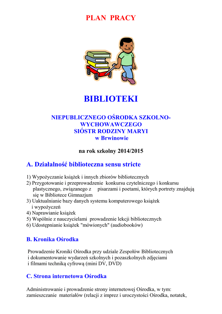 PLAN PRACY BIBLIOTEKI NIEPUBLICZNEGO OŚRODKA SZKOLNOWYCHOWAWCZEGO SIÓSTR RODZINY MARYI w Brwinowie na rok szkolny 2014/2015 A. Działalność biblioteczna sensu stricte 1) Wypożyczanie książek i innych zbiorów bibliotecznych 2) Przygotowanie i przeprowadzenie konkursu czytelniczego i konkursu plastycznego, związanego z pisarzami i poetami, których portrety znajdują się w Bibliotece Gimnazjum 3) Uaktualnianie bazy danych systemu komputerowego książek i wypożyczeń 4) Naprawianie książek 5) Wspólnie z nauczycielami prowadzenie lekcji bibliotecznych 6) Udostępnianie książek "mówionych" (audiobooków) B. Kronika Ośrodka Prowadzenie Kroniki Ośrodka przy udziale Zespołów Bibliotecznych i dokumentowanie wydarzeń szkolnych i pozaszkolnych zdjęciami i filmami techniką cyfrową (mini DV, DVD) C. Strona internetowa Ośrodka Administrowanie i prowadzenie strony internetowej Ośrodka, w tym: zamieszczanie materiałów (relacji z imprez i uroczystości Ośrodka, notatek, informacji), opracowanych przez nauczycieli, pedagogów i wychowawców oraz zdjęć, a także wiadomości, zleconych przez Dyrektora Ośrodka. D. Godziny pracy Biblioteka będzie czynna: we wtorki, środy i czwartki: w Szkole Podstawowej i Gimnazjum (ul. M. Konopnickiej 1) - w godz. 10:00 – 12:30 w Przedszkolu i NS FAMILIA (ul. Szkolna 18) w godz. 13:00 do 14:00 E. Pracownicy Biblioteki s. Katarzyna Archacka Zbigniew Nowacki Brwinów, 3 września 2014 roku Bibliotekarz Zbigniew Nowacki